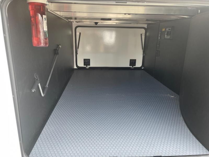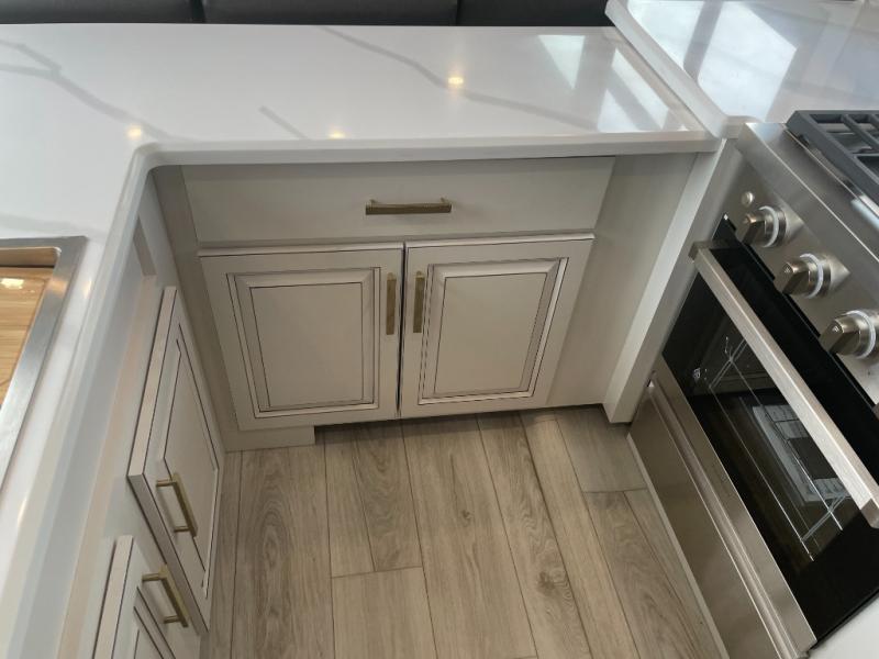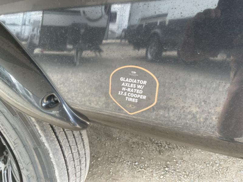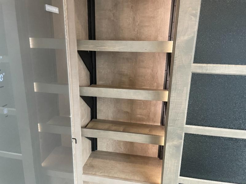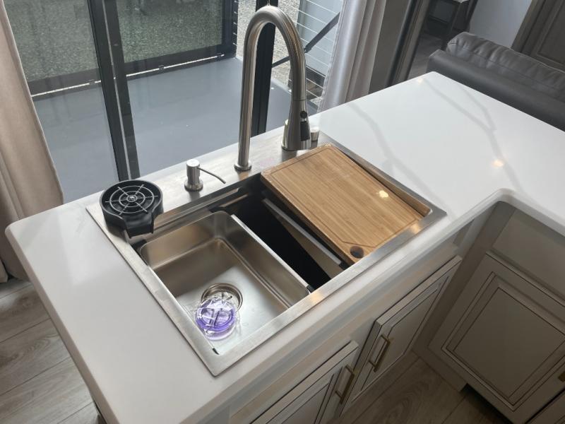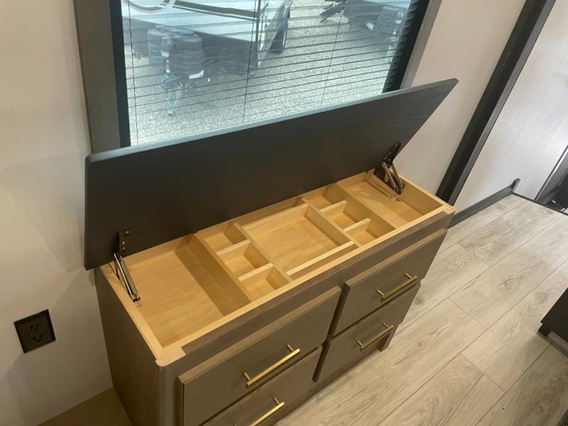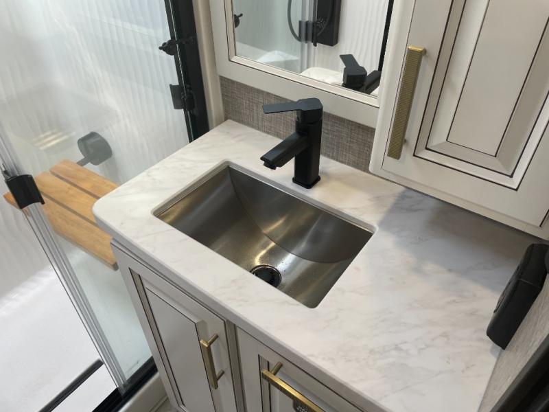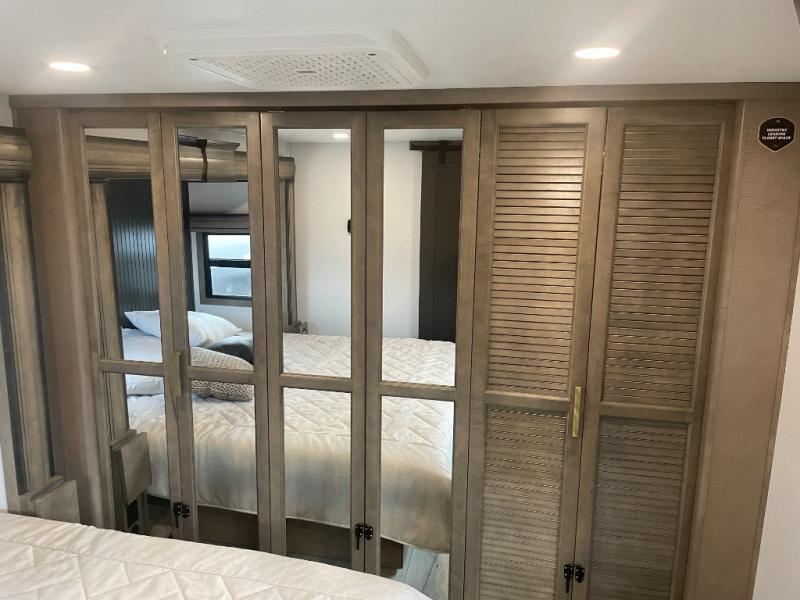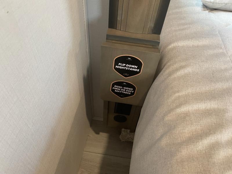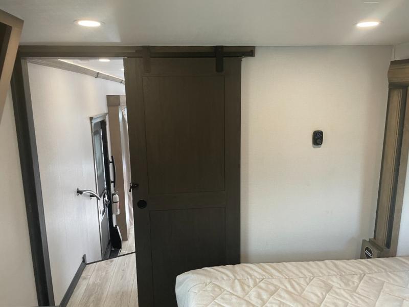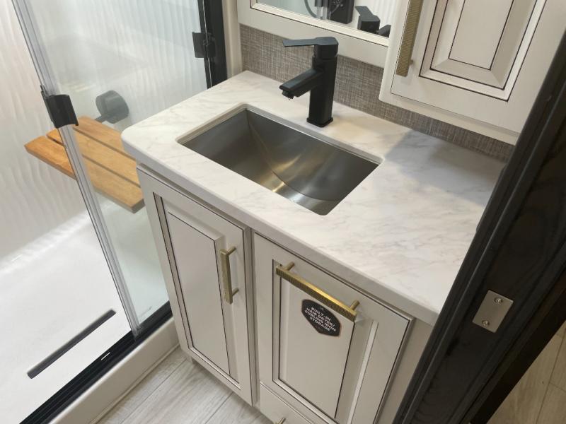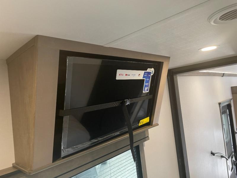Luxury abounds throughout this fifth wheel starting in the centrally located kitchen featuring an L-shaped counter, a large floor to ceiling pantry with sliding glass doors, a 24" range with an overhead convection microwave, and an 18 cu. ft. residential refrigerator with ice an maker. Just up the steps to the right of the entry, you will find a spacious bathroom featuring a 48" x 30" fiberglass shower with a seat, decorative glass enclosure, linen cabinet, and skylight above it for more natural lighting. Sleep like a baby in the front private bedroom on the king bed slide with storage underneath, and keep your clothes looking their best with the front closets. The rear entertainment living area offers true relaxation with L-shaped seating including a hide-a-bed sofa along the roadside, and powered theater seating facing the entertainment center with a 5,000 BTU decorative fireplace heater and Smart TV to watch your favorite movies! And don't overlook the best part, the powered side patio to entertain guests!