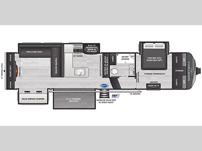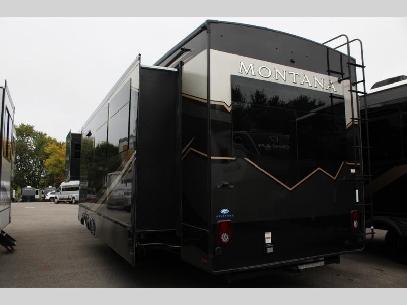 Enjoy luxury, innovation, and the outdoors in any one of Montana's finest fifth wheels. Each set the standard with exceptional features, and exciting factory installed options to provide you a great home on the road. Keystone's exclusive 12" I-beam chassis with z-frame technology has been reengineered to be stronger, lighter and built for "the long haul". A few other construction features you will appreciate include a Road Armor suspension, 2" thick, dual-layered lauan high gloss fiberglass sidewalls, a MaxTurn front cap with KeyShield automotive-grade paint, and a fully walkable roof with an Alpha seamless TPO membrane system. Each feature stylish interiors with two decor choices paired with beautiful hardwood cabinetry, vinyl flooring throughout, central vacuum, plus a La-Z-Boy furniture package for all-around comfort!