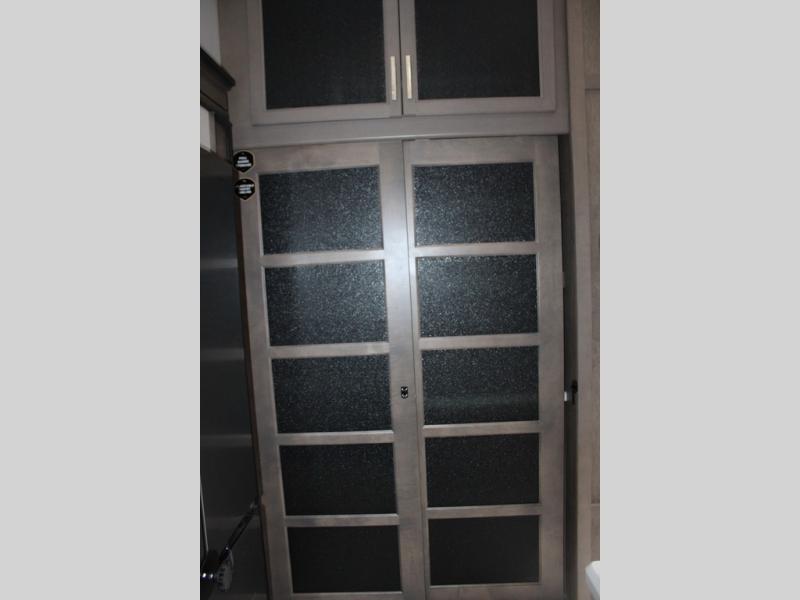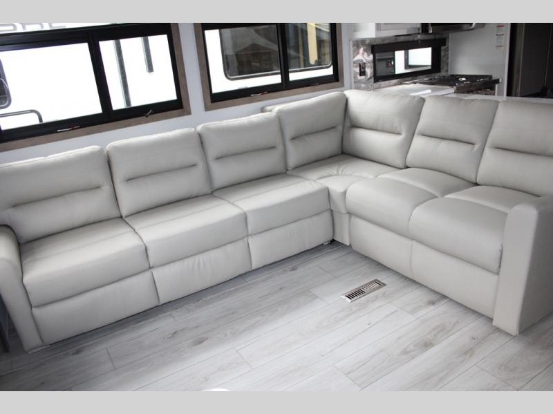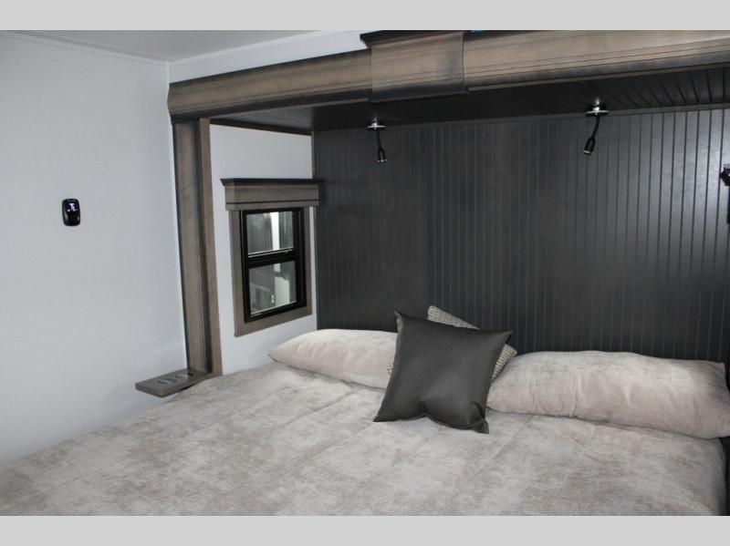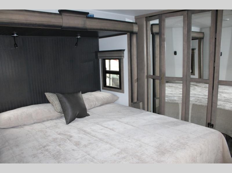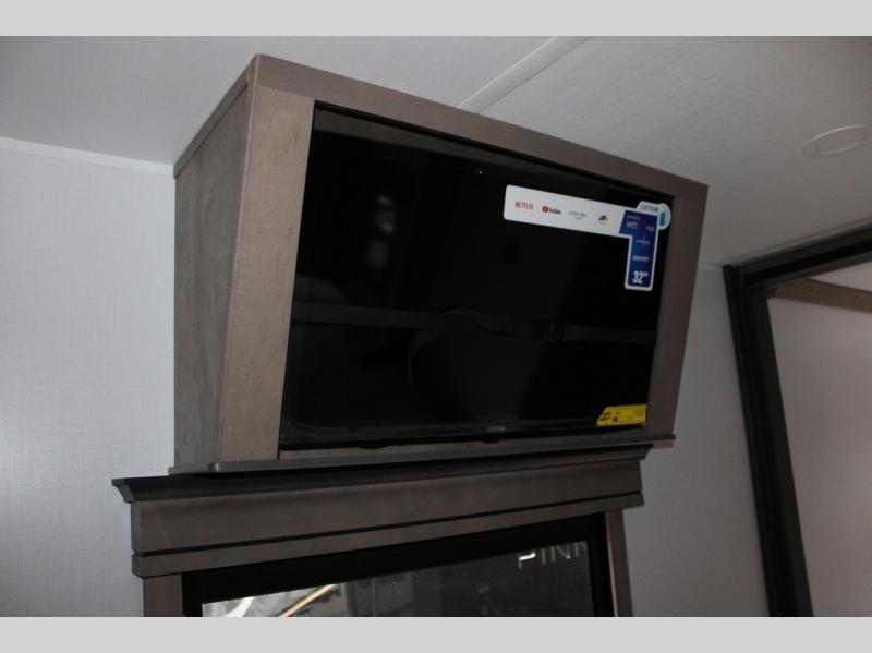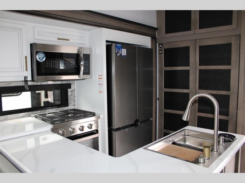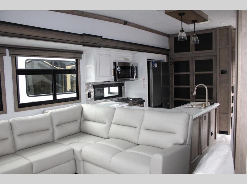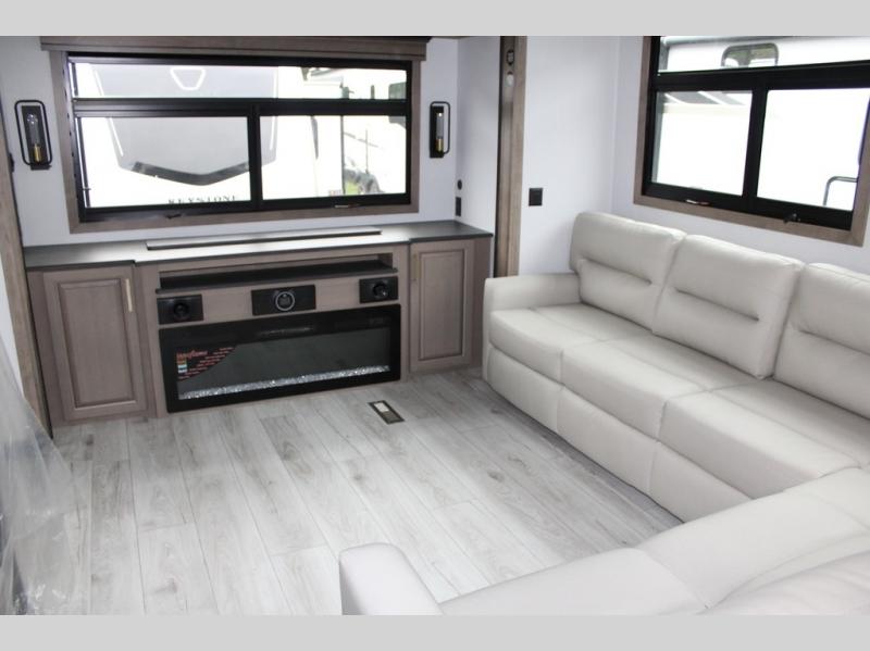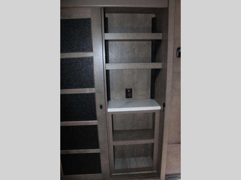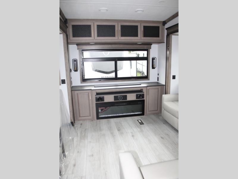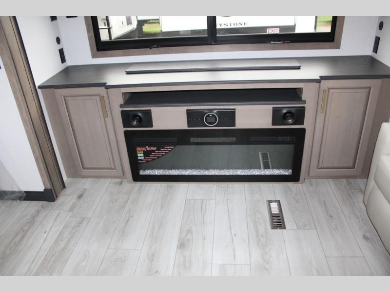 Luxury abounds throughout this fifth wheel starting in the centrally located kitchen featuring an L-shaped counter, a large floor to ceiling pantry with sliding glass doors, a 24" range with an overhead convection microwave, and an 18 cu. ft. residential refrigerator with ice an maker. Just up the steps to the right of the entry, you will find a spacious bathroom featuring a 48" x 30" fiberglass shower with a seat, decorative glass enclosure, linen cabinet, and skylight above it for more natural lighting. Sleep like a baby in the front private bedroom on the king bed slide with storage underneath, and keep your clothes looking their best with the front closets. The rear entertainment living area offers true relaxation with L-shaped seating including a hide-a-bed sofa along the roadside, and powered theater seating facing the entertainment center with a 5,000 BTU decorative fireplace heater and Smart TV to watch your favorite movies! And don't overlook the best part, the powered side patio to entertain guests!