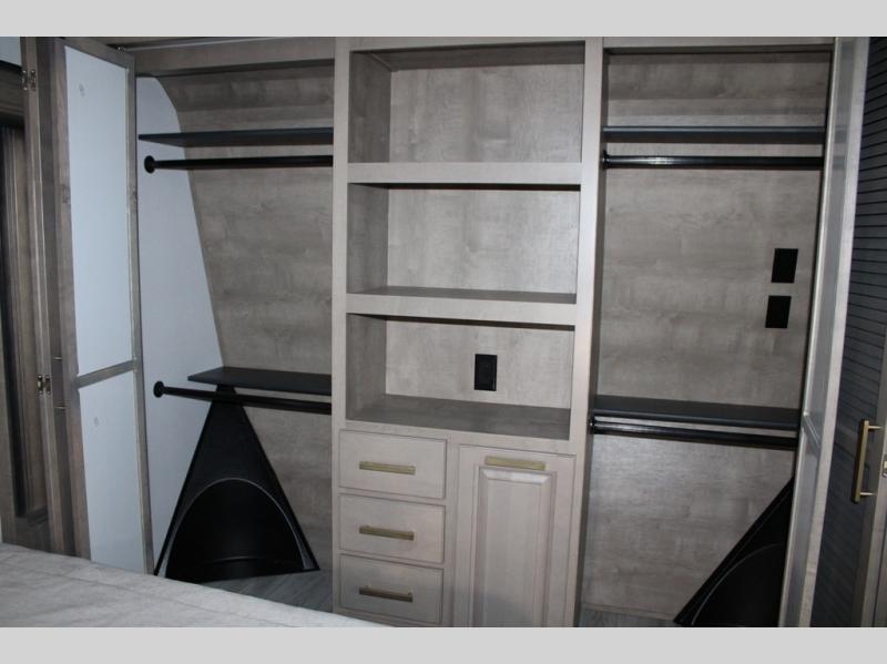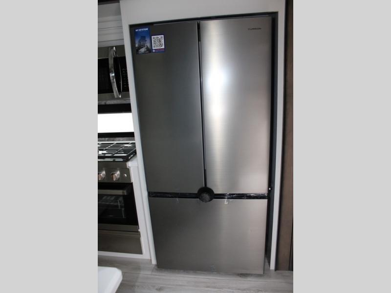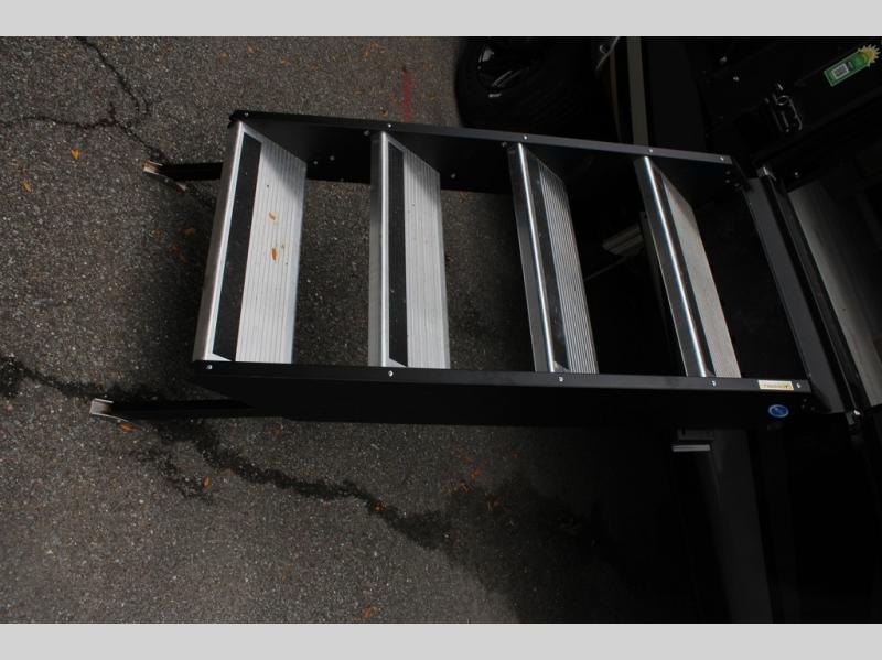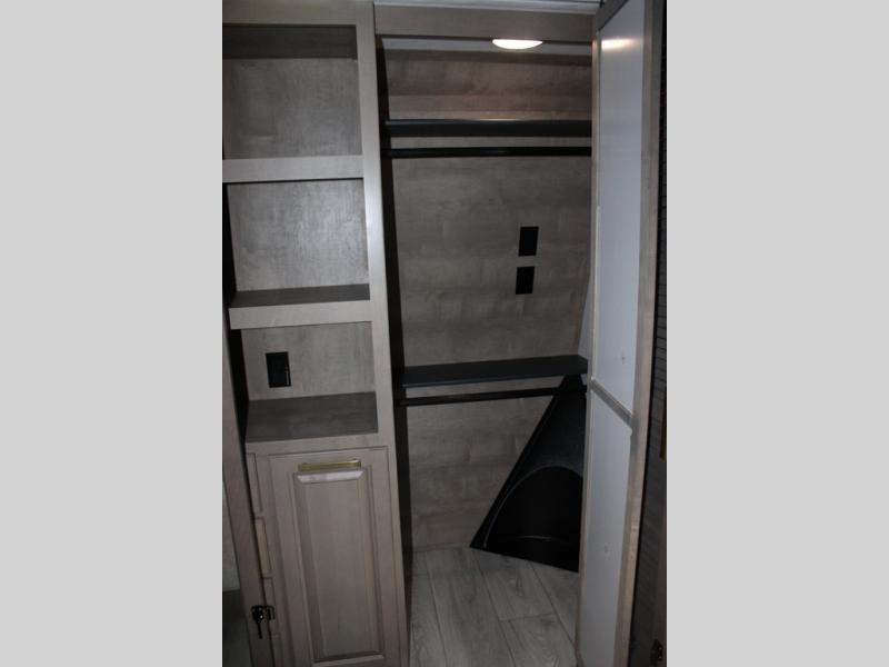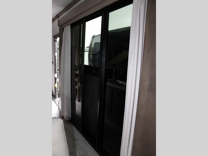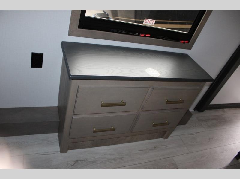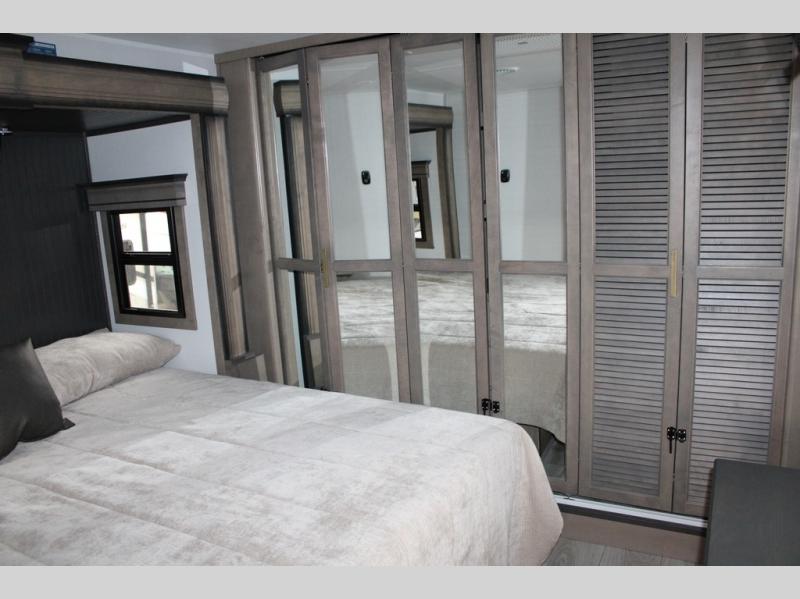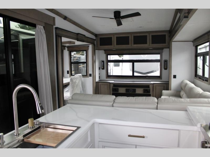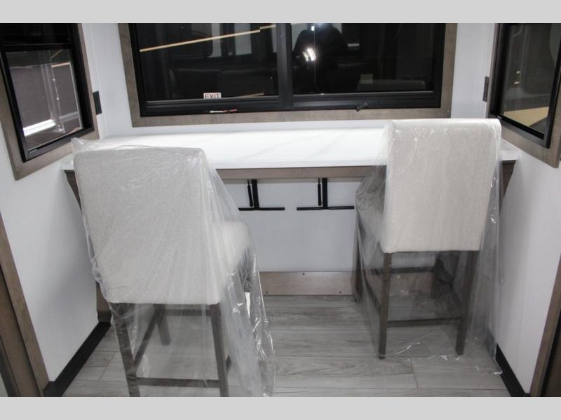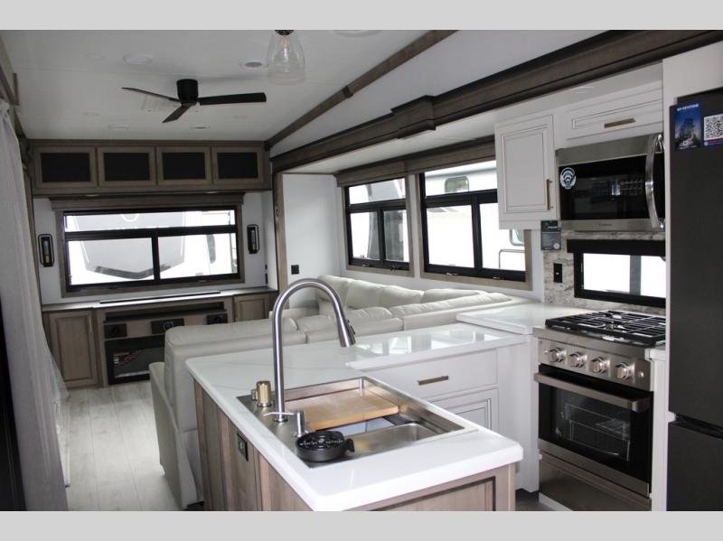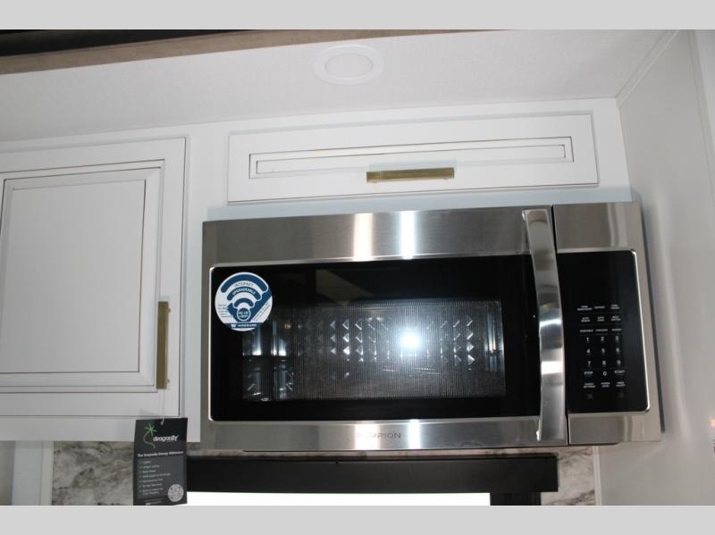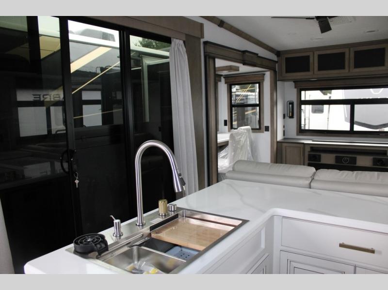 Luxury abounds throughout this fifth wheel starting in the centrally located kitchen featuring an L-shaped counter, a large floor to ceiling pantry with sliding glass doors, a 24" range with an overhead convection microwave, and an 18 cu. ft. residential refrigerator with ice an maker. Just up the steps to the right of the entry, you will find a spacious bathroom featuring a 48" x 30" fiberglass shower with a seat, decorative glass enclosure, linen cabinet, and skylight above it for more natural lighting. Sleep like a baby in the front private bedroom on the king bed slide with storage underneath, and keep your clothes looking their best with the front closets. The rear entertainment living area offers true relaxation with L-shaped seating including a hide-a-bed sofa along the roadside, and powered theater seating facing the entertainment center with a 5,000 BTU decorative fireplace heater and Smart TV to watch your favorite movies! And don't overlook the best part, the powered side patio to entertain guests!