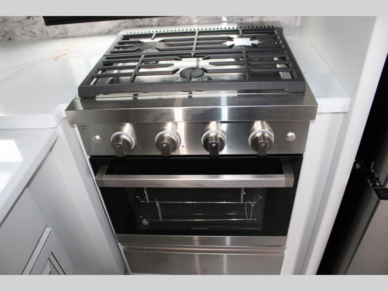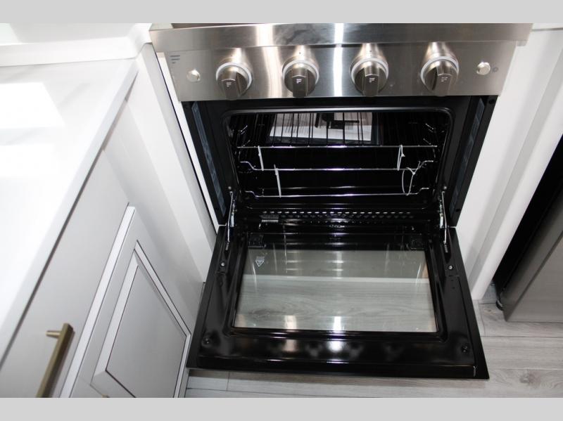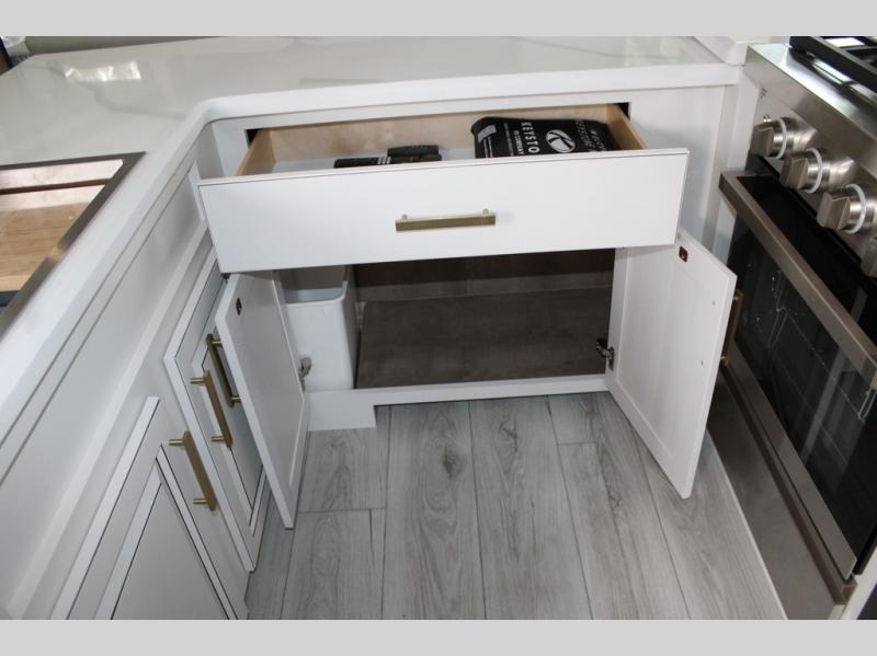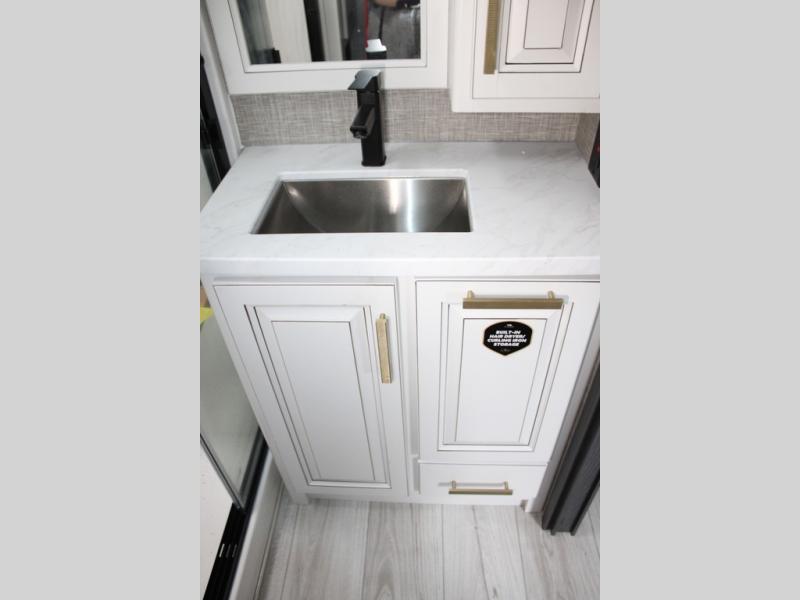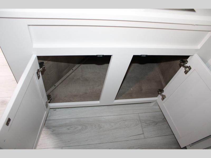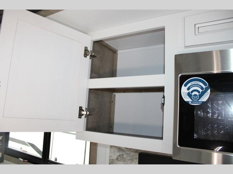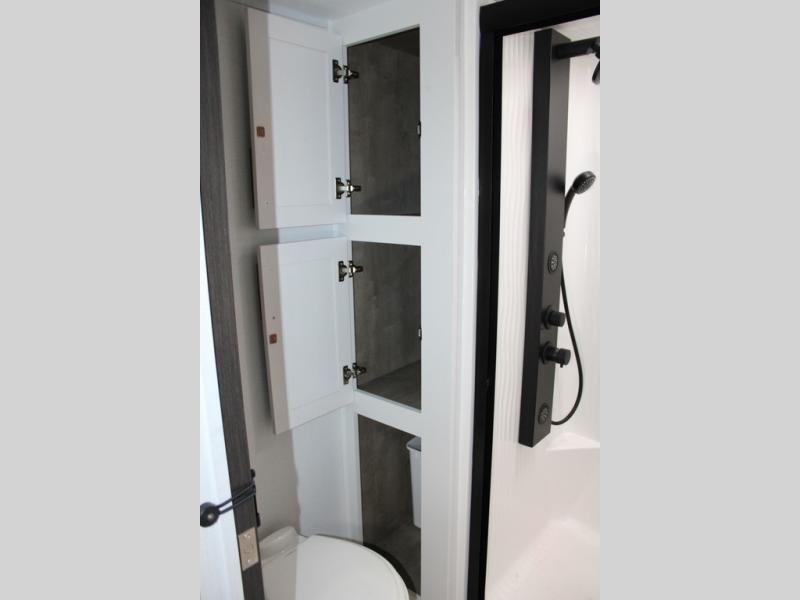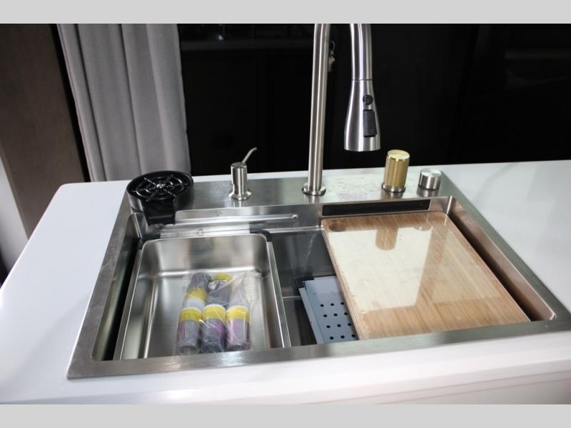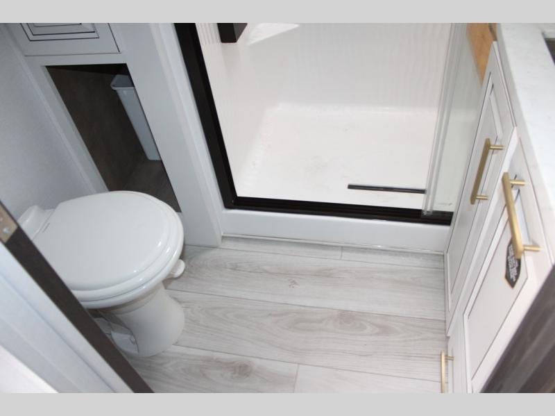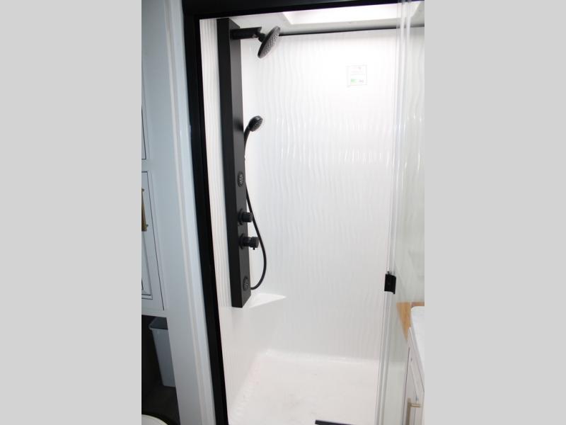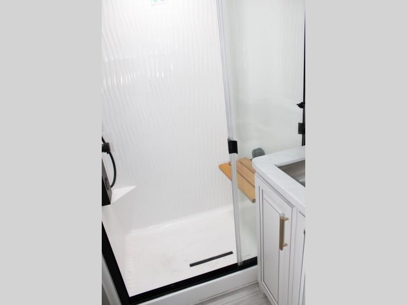 Luxury abounds throughout this fifth wheel starting in the centrally located kitchen featuring an L-shaped counter, a large floor to ceiling pantry with sliding glass doors, a 24" range with an overhead convection microwave, and an 18 cu. ft. residential refrigerator with ice an maker. Just up the steps to the right of the entry, you will find a spacious bathroom featuring a 48" x 30" fiberglass shower with a seat, decorative glass enclosure, linen cabinet, and skylight above it for more natural lighting. Sleep like a baby in the front private bedroom on the king bed slide with storage underneath, and keep your clothes looking their best with the front closets. The rear entertainment living area offers true relaxation with L-shaped seating including a hide-a-bed sofa along the roadside, and powered theater seating facing the entertainment center with a 5,000 BTU decorative fireplace heater and Smart TV to watch your favorite movies! And don't overlook the best part, the powered side patio to entertain guests!