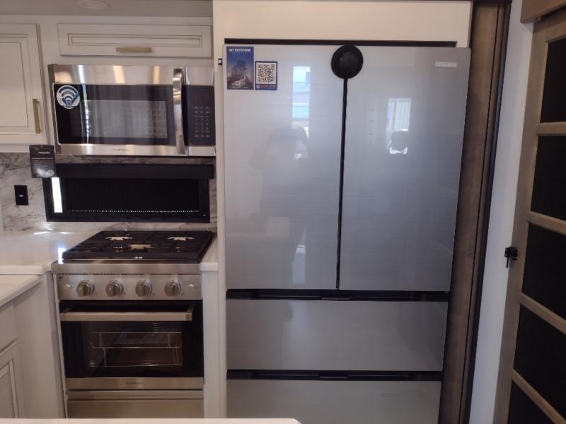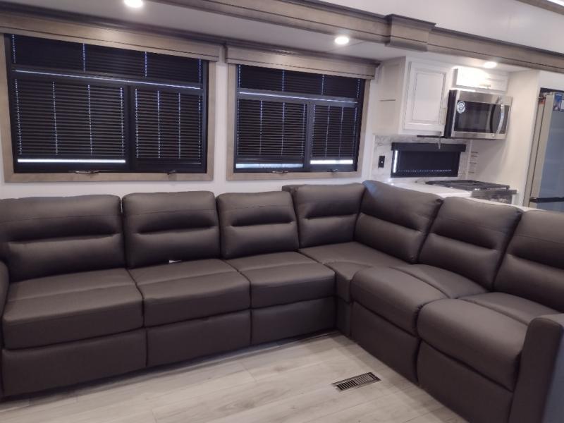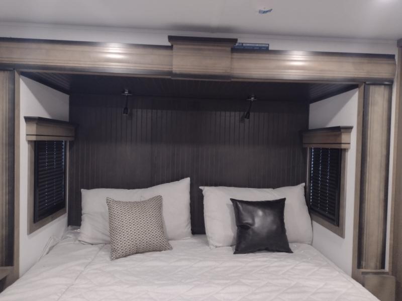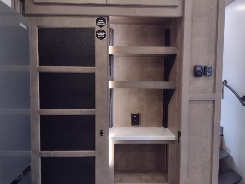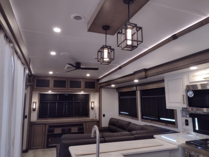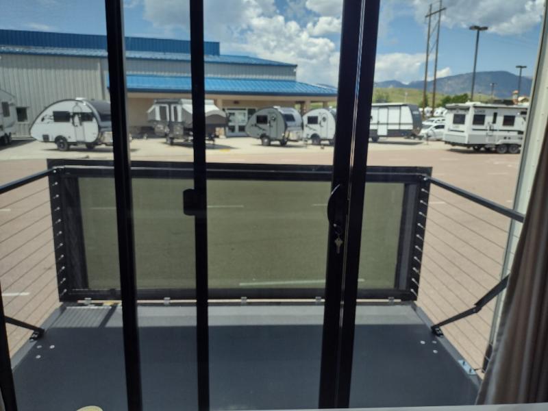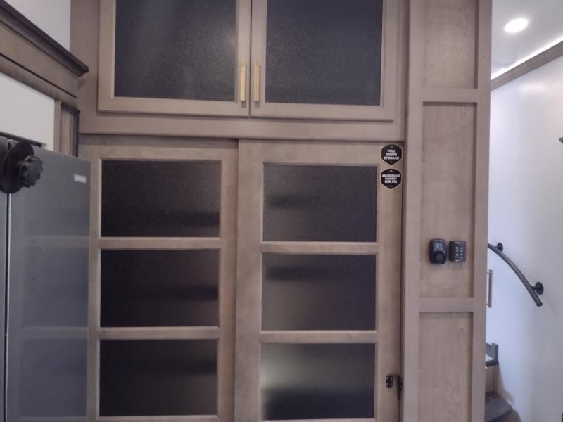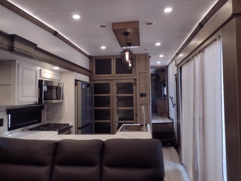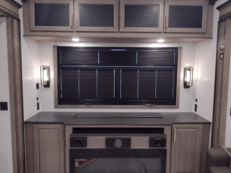 Luxury abounds throughout this fifth wheel starting in the centrally located kitchen featuring an L-shaped counter, a large floor to ceiling pantry with sliding glass doors, a 24" range with an overhead convection microwave, and an 18 cu. ft. residential refrigerator with ice an maker. Just up the steps to the right of the entry, you will find a spacious bathroom featuring a 48" x 30" fiberglass shower with a seat, decorative glass enclosure, linen cabinet, and skylight above it for more natural lighting. Sleep like a baby in the front private bedroom on the king bed slide with storage underneath, and keep your clothes looking their best with the front closets. The rear entertainment living area offers true relaxation with L-shaped seating including a hide-a-bed sofa along the roadside, and powered theater seating facing the entertainment center with a 5,000 BTU decorative fireplace heater and Smart TV to watch your favorite movies! And don't overlook the best part, the powered side patio to entertain guests!