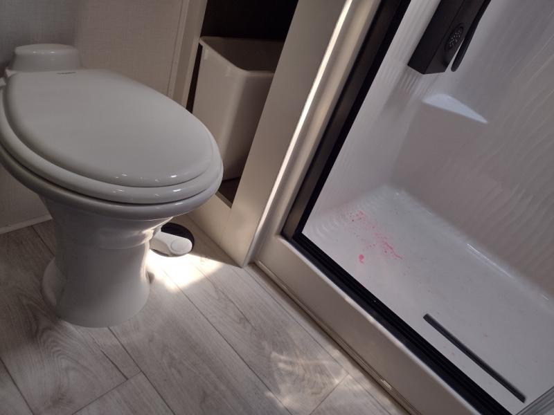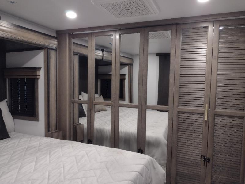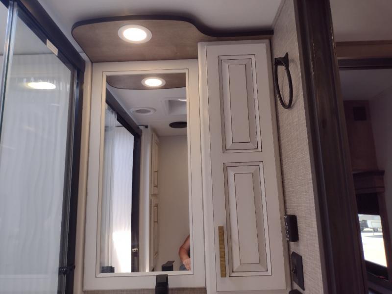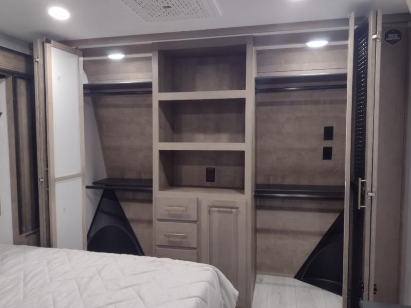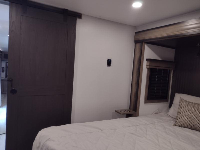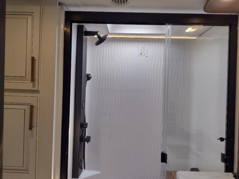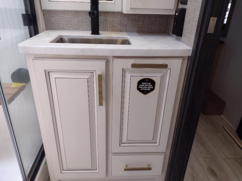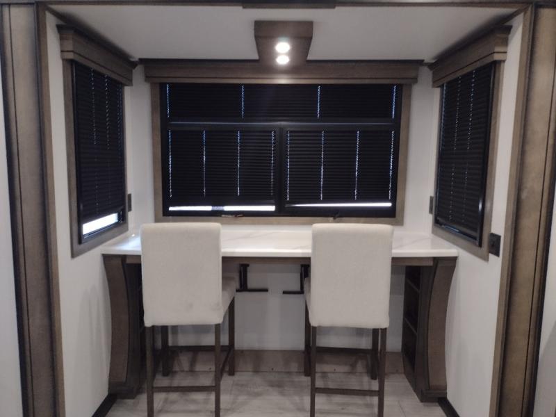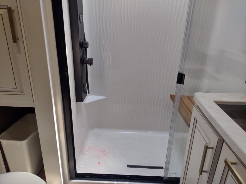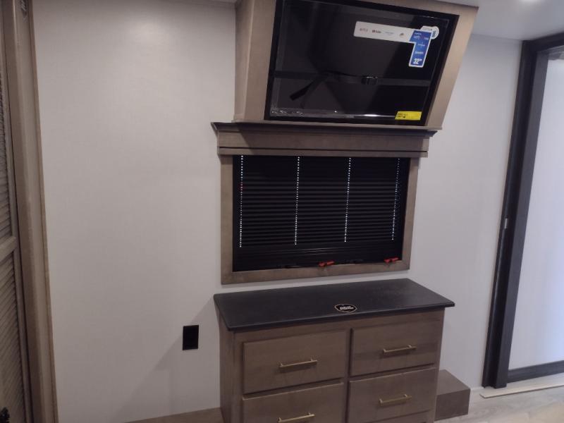 Luxury abounds throughout this fifth wheel starting in the centrally located kitchen featuring an L-shaped counter, a large floor to ceiling pantry with sliding glass doors, a 24" range with an overhead convection microwave, and an 18 cu. ft. residential refrigerator with ice an maker. Just up the steps to the right of the entry, you will find a spacious bathroom featuring a 48" x 30" fiberglass shower with a seat, decorative glass enclosure, linen cabinet, and skylight above it for more natural lighting. Sleep like a baby in the front private bedroom on the king bed slide with storage underneath, and keep your clothes looking their best with the front closets. The rear entertainment living area offers true relaxation with L-shaped seating including a hide-a-bed sofa along the roadside, and powered theater seating facing the entertainment center with a 5,000 BTU decorative fireplace heater and Smart TV to watch your favorite movies! And don't overlook the best part, the powered side patio to entertain guests!