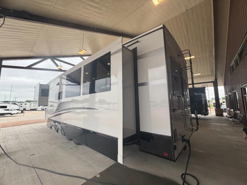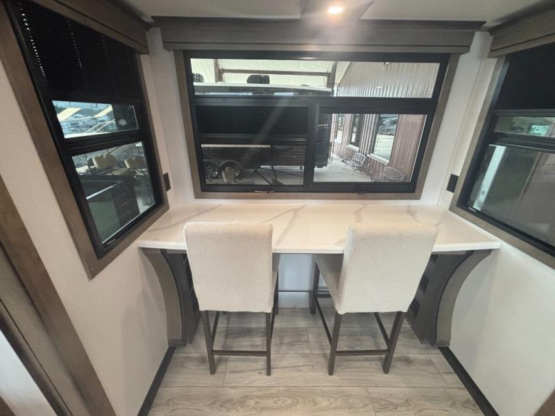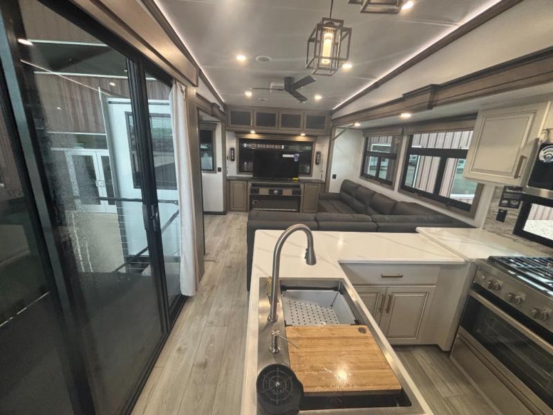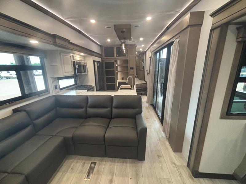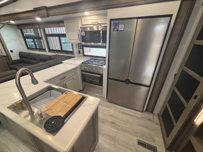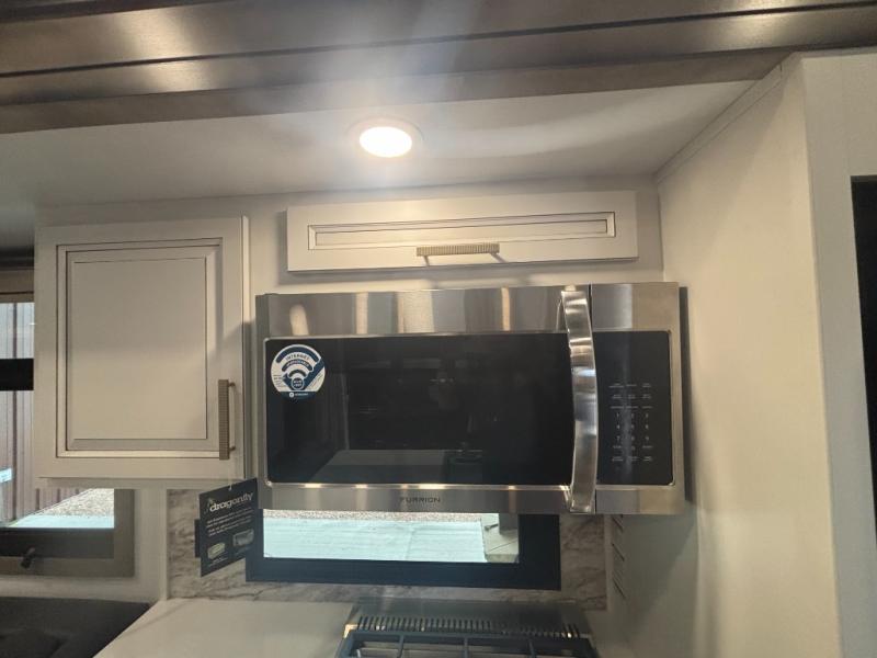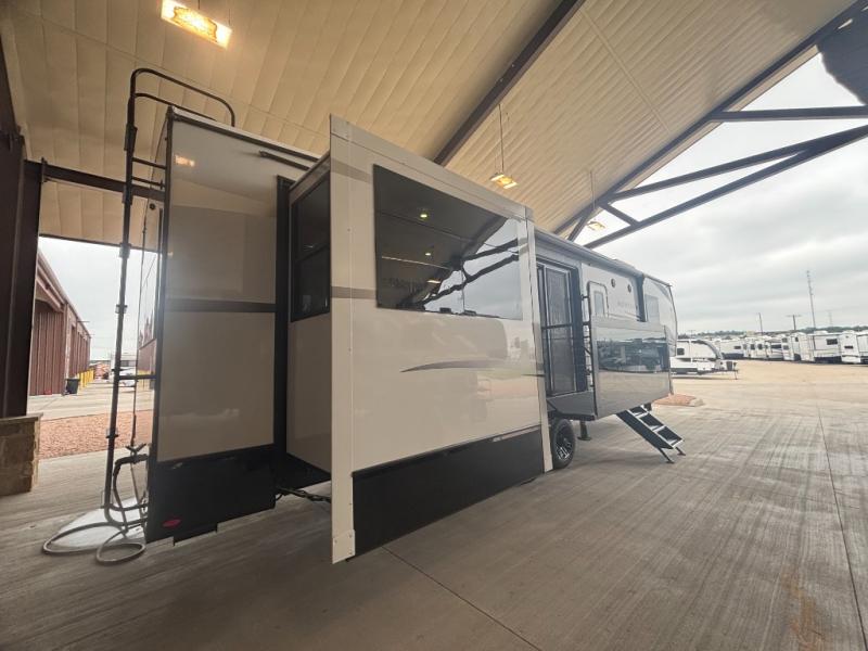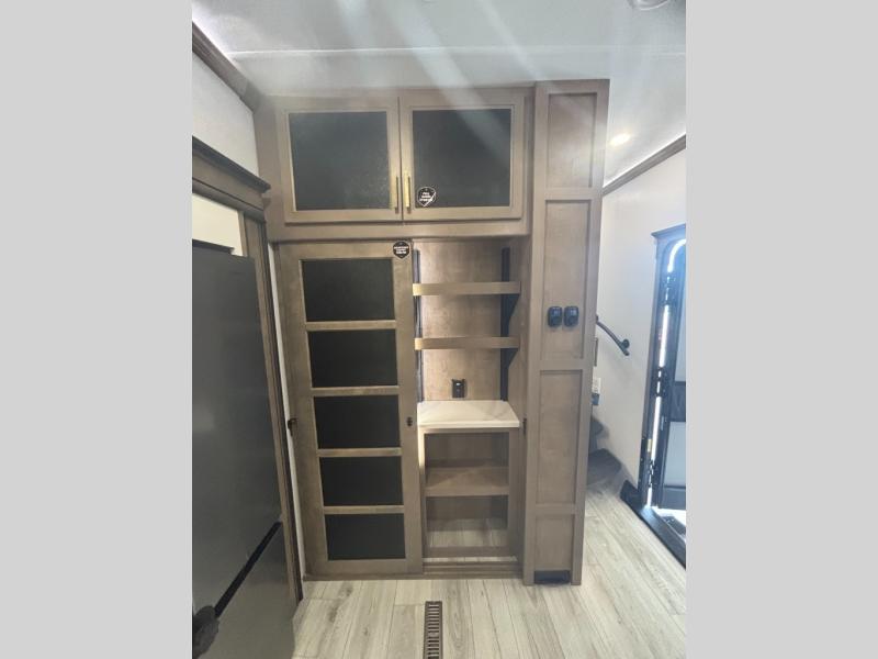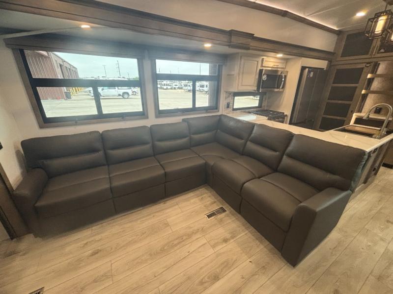 Luxury abounds throughout this fifth wheel starting in the centrally located kitchen featuring an L-shaped counter, a large floor to ceiling pantry with sliding glass doors, a 24" range with an overhead convection microwave, and an 18 cu. ft. residential refrigerator with ice an maker. Just up the steps to the right of the entry, you will find a spacious bathroom featuring a 48" x 30" fiberglass shower with a seat, decorative glass enclosure, linen cabinet, and skylight above it for more natural lighting. Sleep like a baby in the front private bedroom on the king bed slide with storage underneath, and keep your clothes looking their best with the front closets. The rear entertainment living area offers true relaxation with L-shaped seating including a hide-a-bed sofa along the roadside, and powered theater seating facing the entertainment center with a 5,000 BTU decorative fireplace heater and Smart TV to watch your favorite movies! And don't overlook the best part, the powered side patio to entertain guests!
