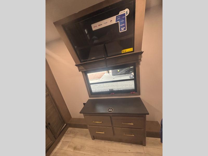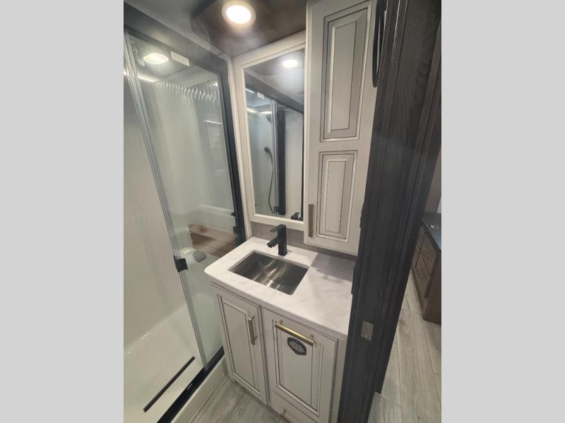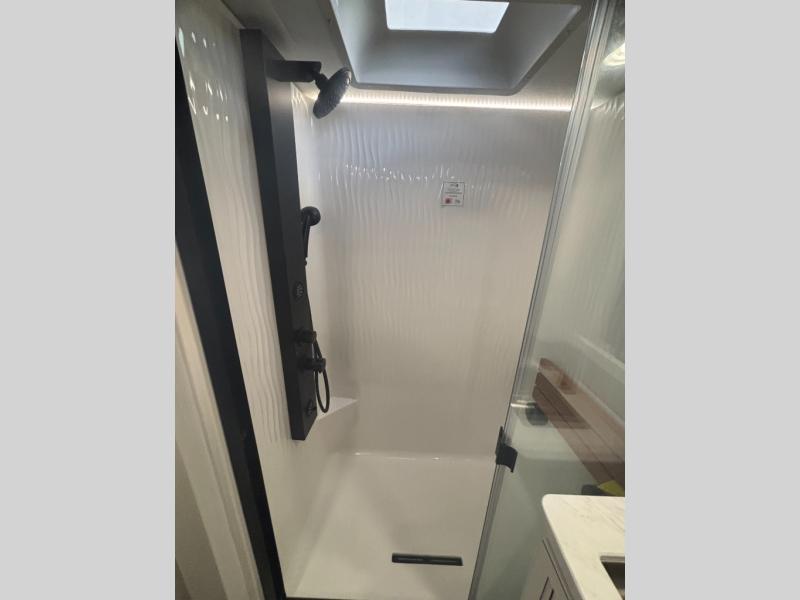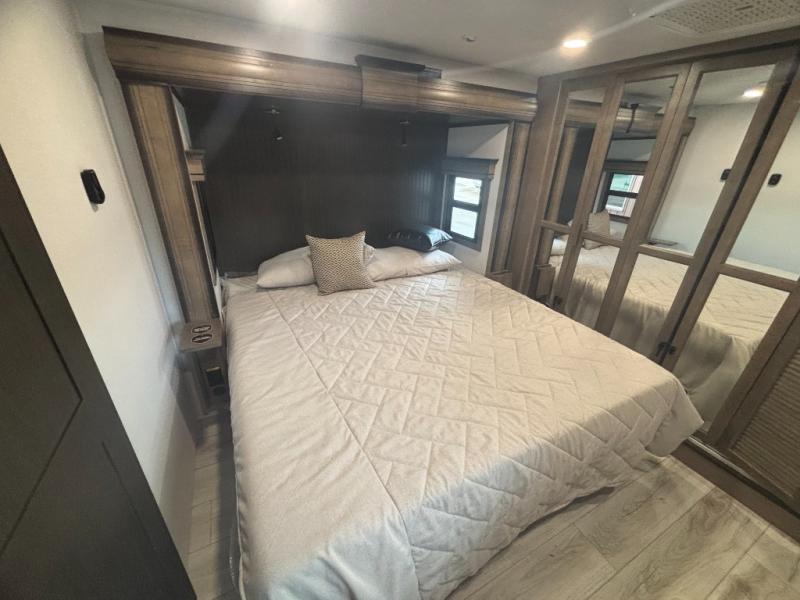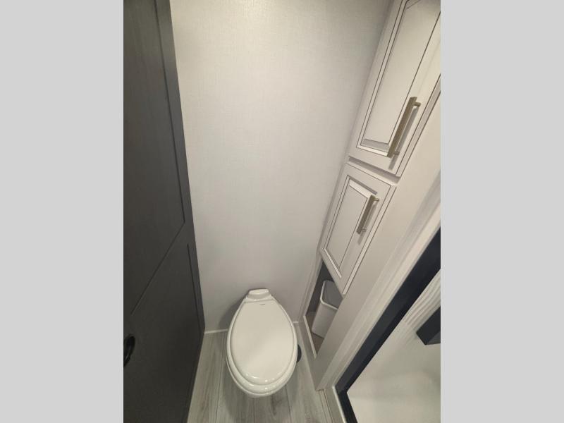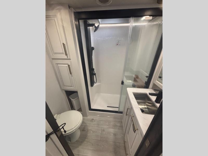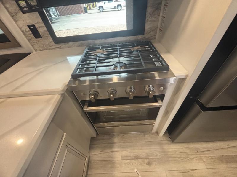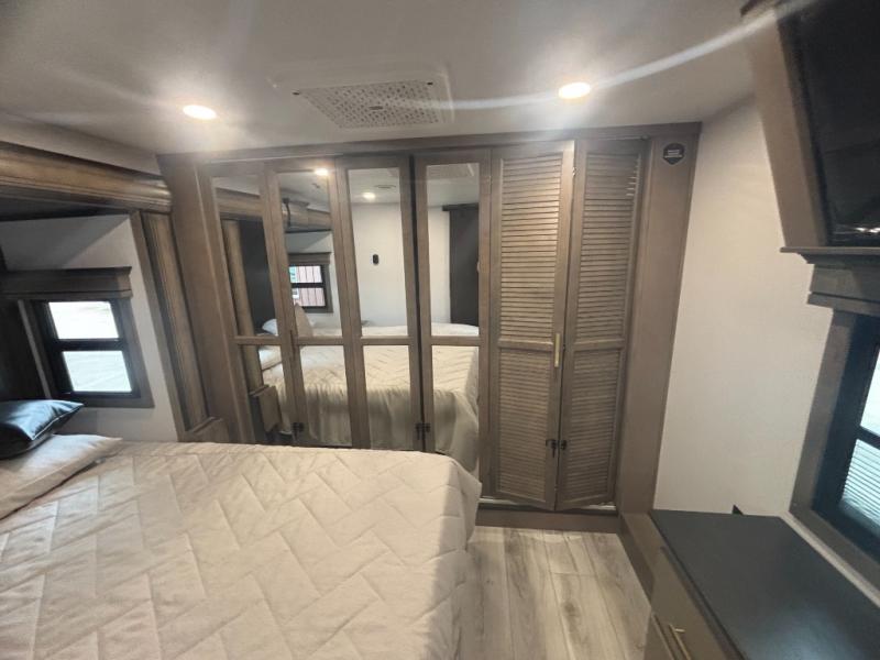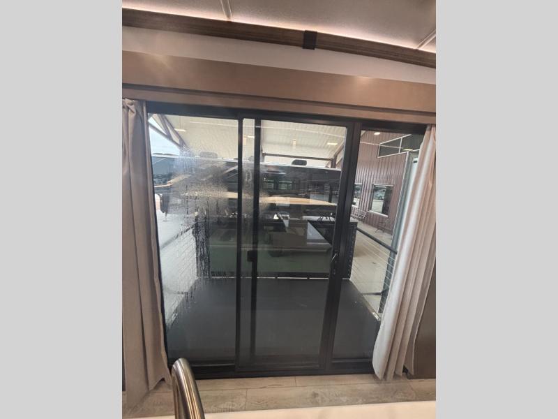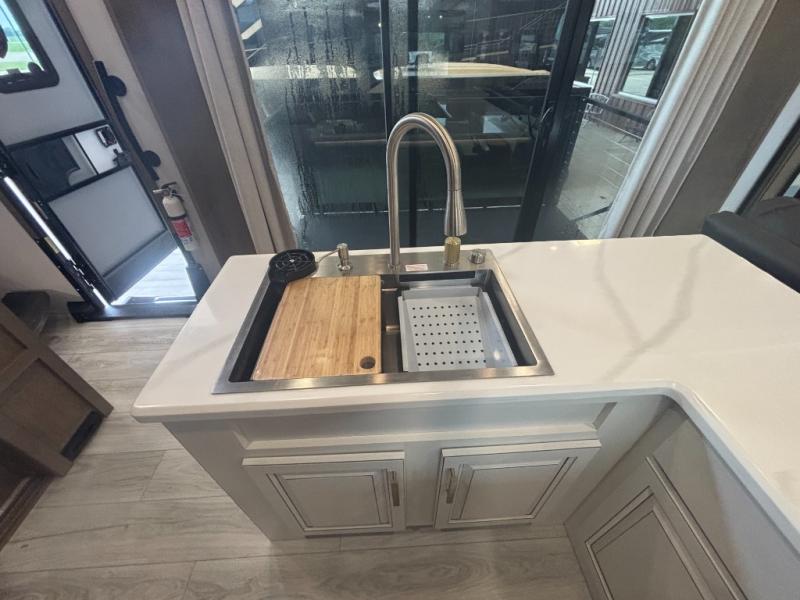 Luxury abounds throughout this fifth wheel starting in the centrally located kitchen featuring an L-shaped counter, a large floor to ceiling pantry with sliding glass doors, a 24" range with an overhead convection microwave, and an 18 cu. ft. residential refrigerator with ice an maker. Just up the steps to the right of the entry, you will find a spacious bathroom featuring a 48" x 30" fiberglass shower with a seat, decorative glass enclosure, linen cabinet, and skylight above it for more natural lighting. Sleep like a baby in the front private bedroom on the king bed slide with storage underneath, and keep your clothes looking their best with the front closets. The rear entertainment living area offers true relaxation with L-shaped seating including a hide-a-bed sofa along the roadside, and powered theater seating facing the entertainment center with a 5,000 BTU decorative fireplace heater and Smart TV to watch your favorite movies! And don't overlook the best part, the powered side patio to entertain guests!