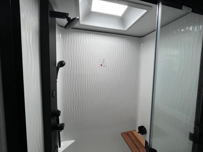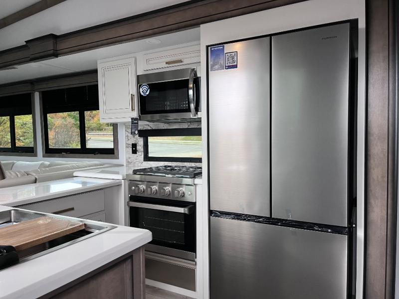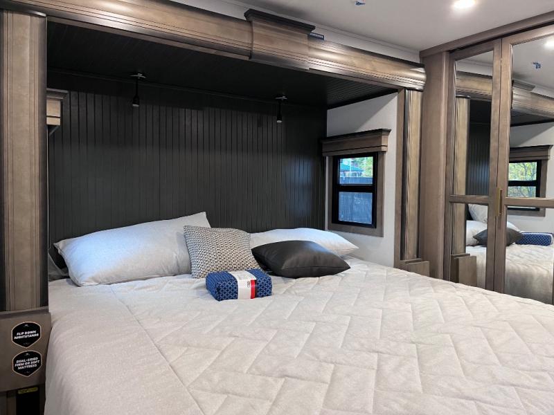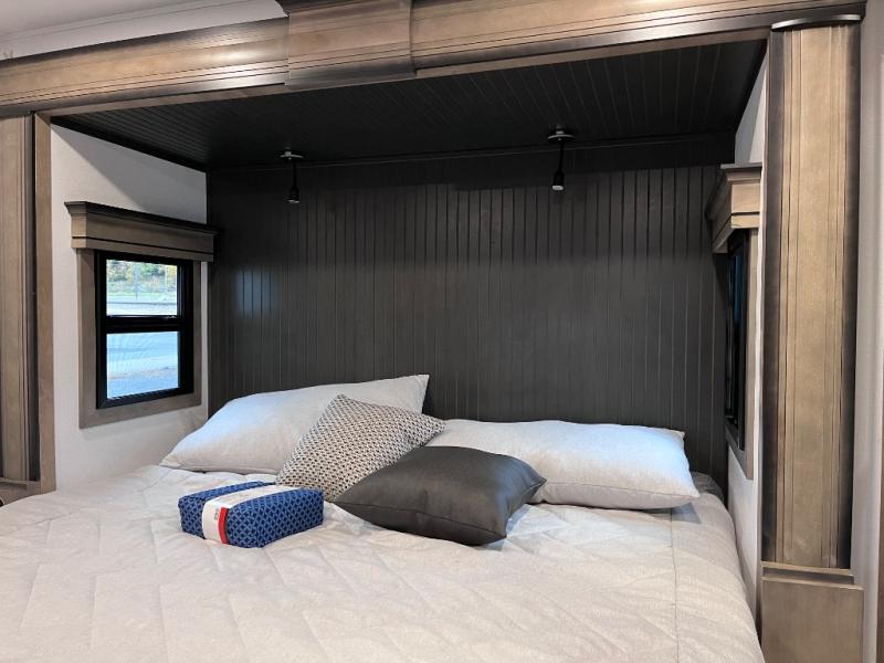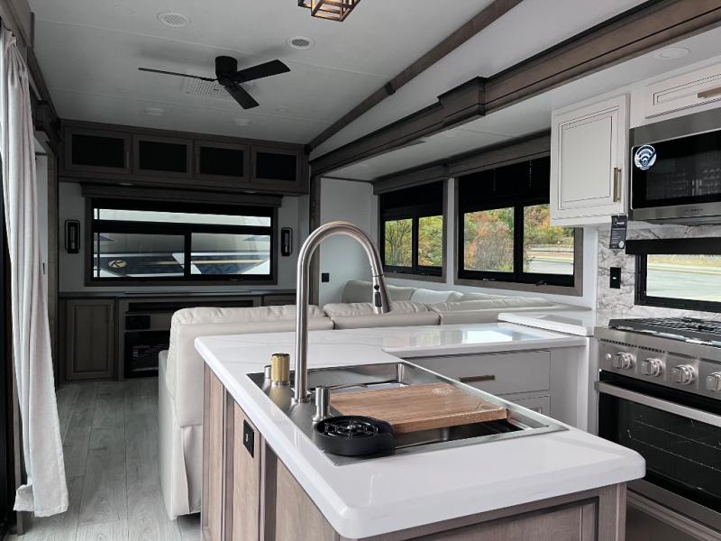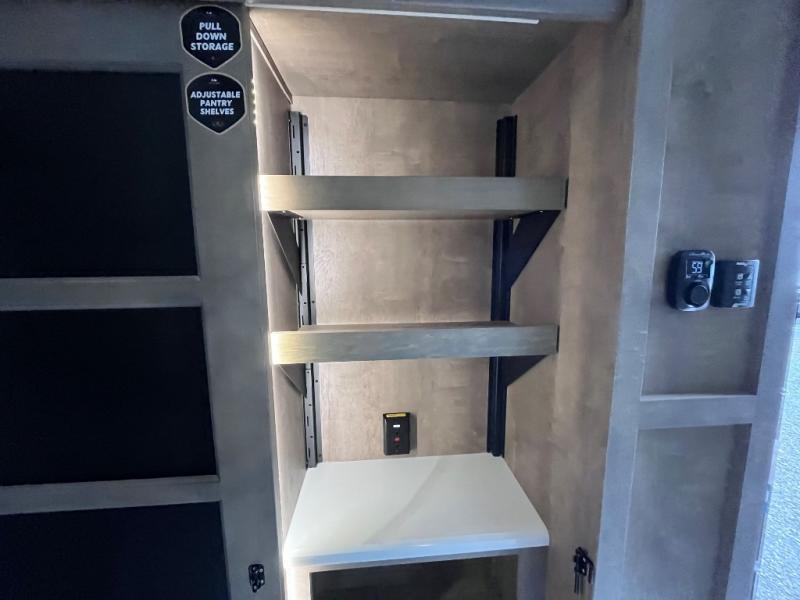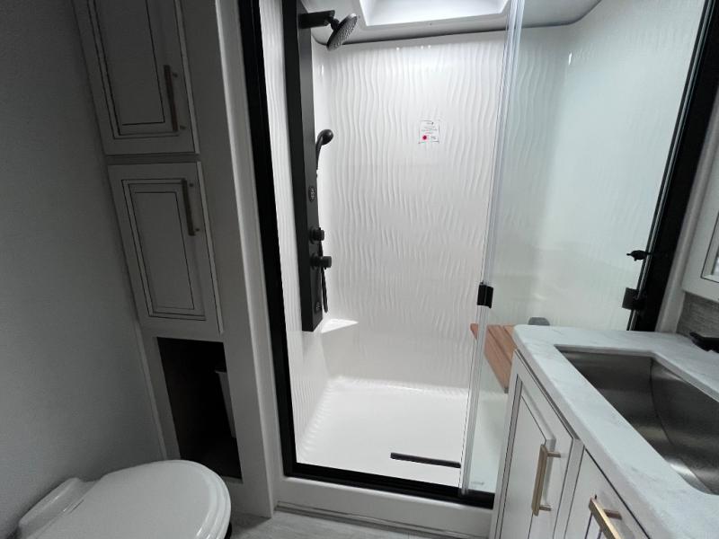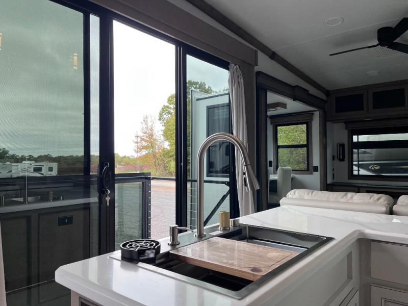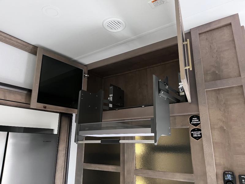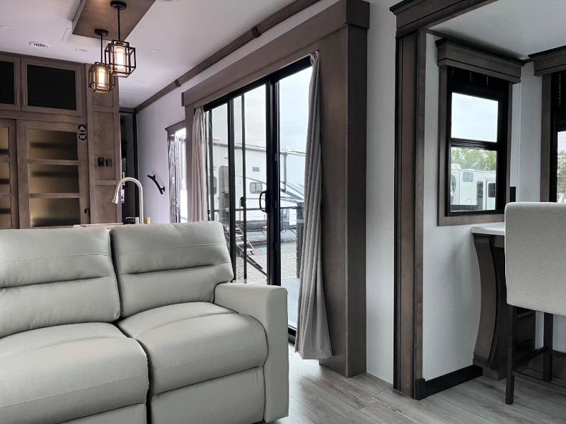 Luxury abounds throughout this fifth wheel starting in the centrally located kitchen featuring an L-shaped counter, a large floor to ceiling pantry with sliding glass doors, a 24" range with an overhead convection microwave, and an 18 cu. ft. residential refrigerator with ice an maker. Just up the steps to the right of the entry, you will find a spacious bathroom featuring a 48" x 30" fiberglass shower with a seat, decorative glass enclosure, linen cabinet, and skylight above it for more natural lighting. Sleep like a baby in the front private bedroom on the king bed slide with storage underneath, and keep your clothes looking their best with the front closets. The rear entertainment living area offers true relaxation with L-shaped seating including a hide-a-bed sofa along the roadside, and powered theater seating facing the entertainment center with a 5,000 BTU decorative fireplace heater and Smart TV to watch your favorite movies! And don't overlook the best part, the powered side patio to entertain guests!