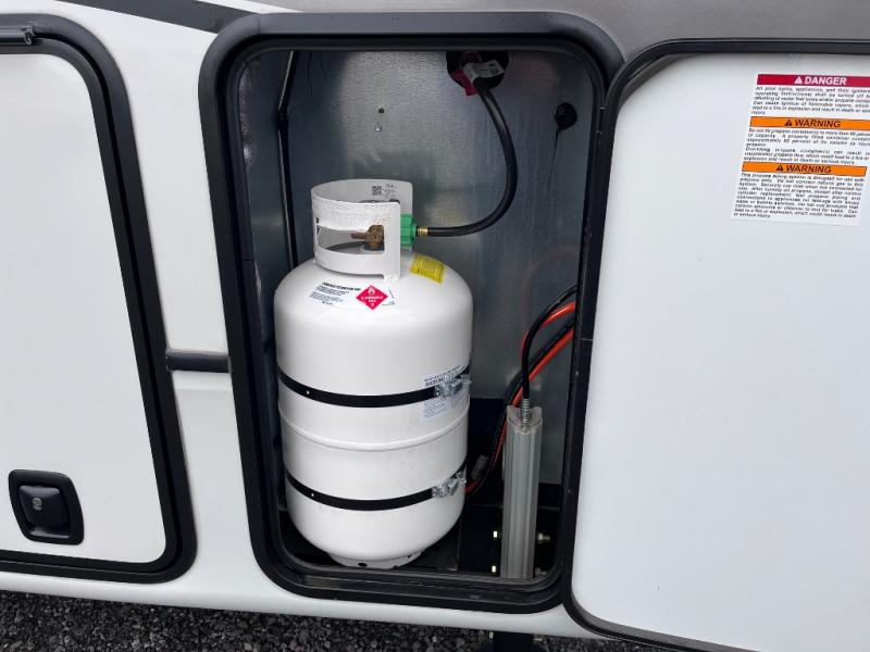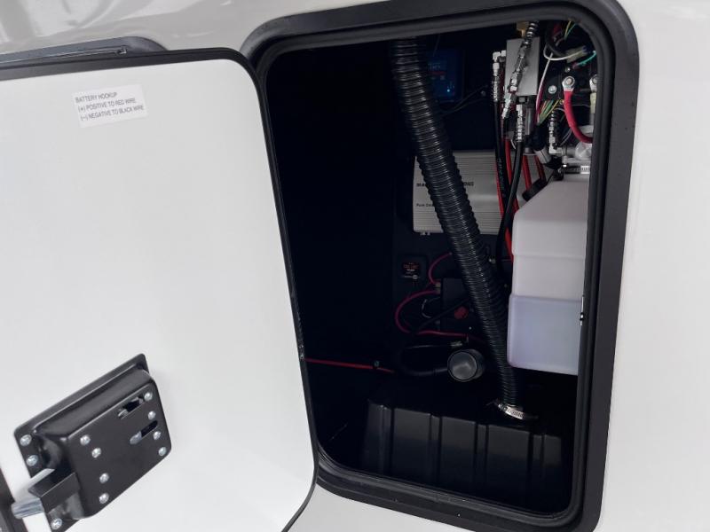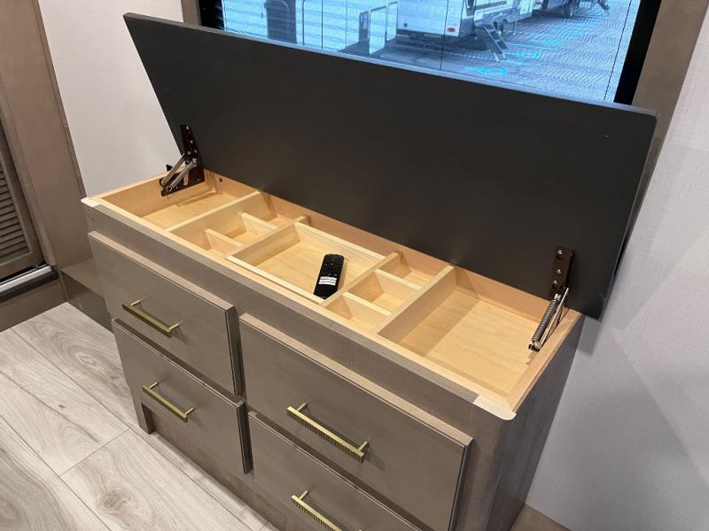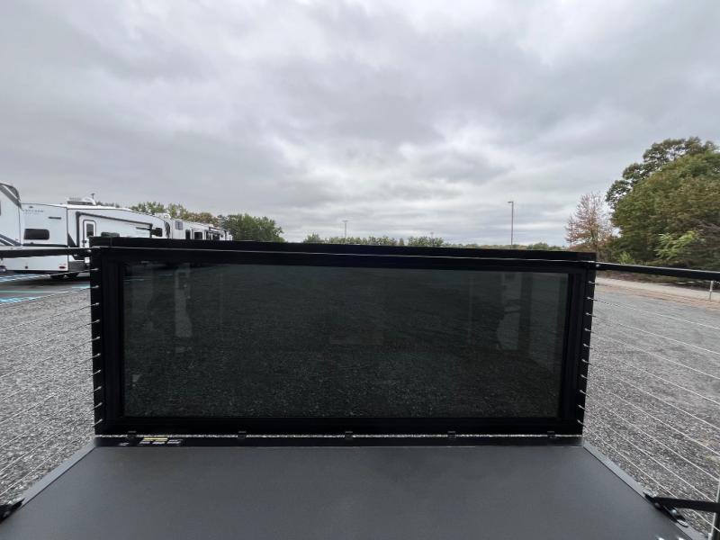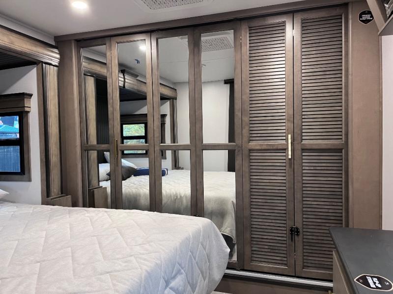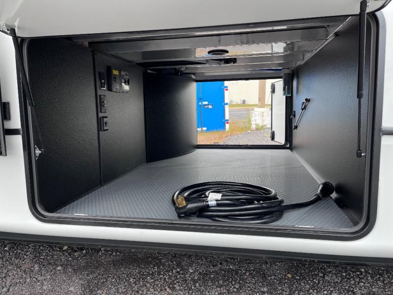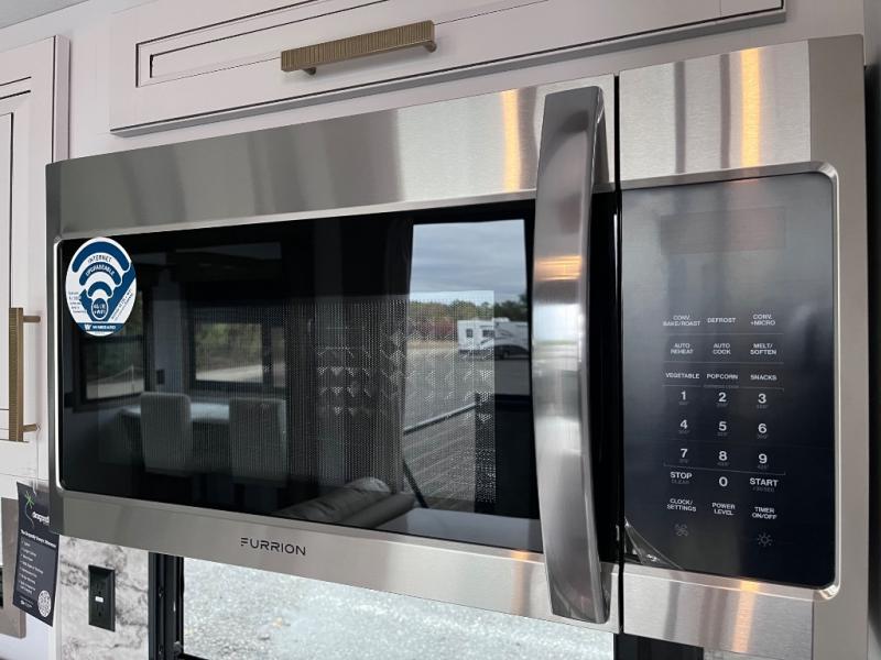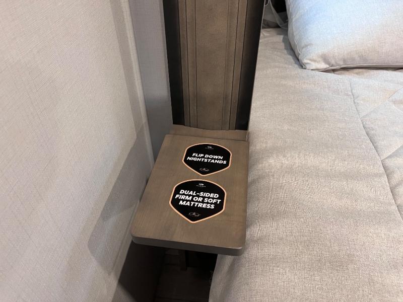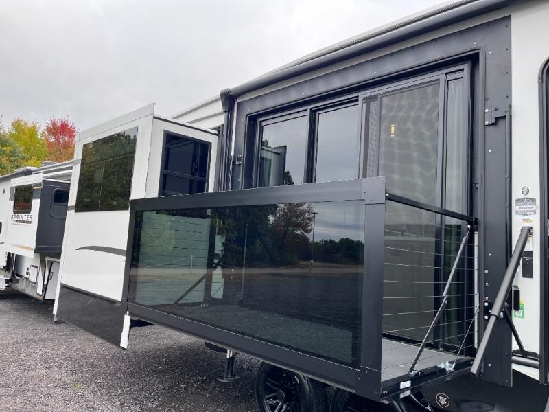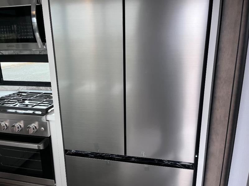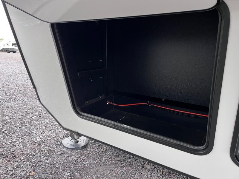 Luxury abounds throughout this fifth wheel starting in the centrally located kitchen featuring an L-shaped counter, a large floor to ceiling pantry with sliding glass doors, a 24" range with an overhead convection microwave, and an 18 cu. ft. residential refrigerator with ice an maker. Just up the steps to the right of the entry, you will find a spacious bathroom featuring a 48" x 30" fiberglass shower with a seat, decorative glass enclosure, linen cabinet, and skylight above it for more natural lighting. Sleep like a baby in the front private bedroom on the king bed slide with storage underneath, and keep your clothes looking their best with the front closets. The rear entertainment living area offers true relaxation with L-shaped seating including a hide-a-bed sofa along the roadside, and powered theater seating facing the entertainment center with a 5,000 BTU decorative fireplace heater and Smart TV to watch your favorite movies! And don't overlook the best part, the powered side patio to entertain guests!