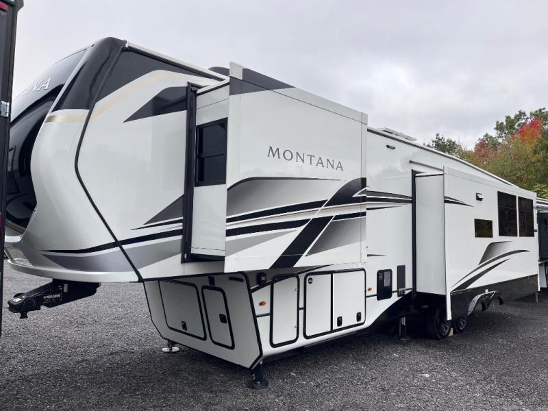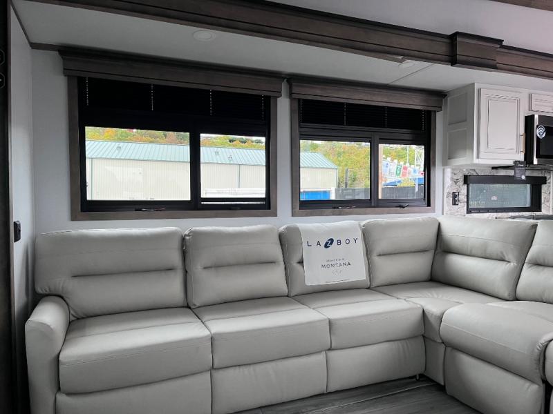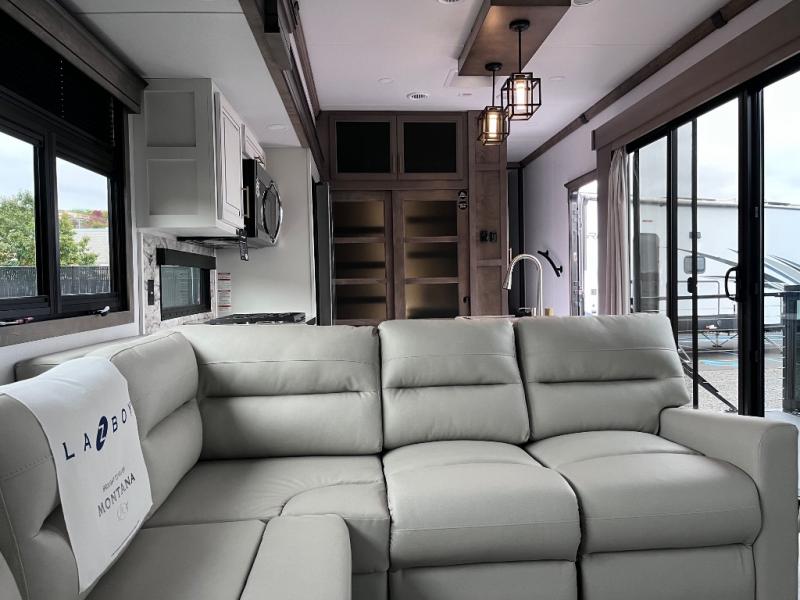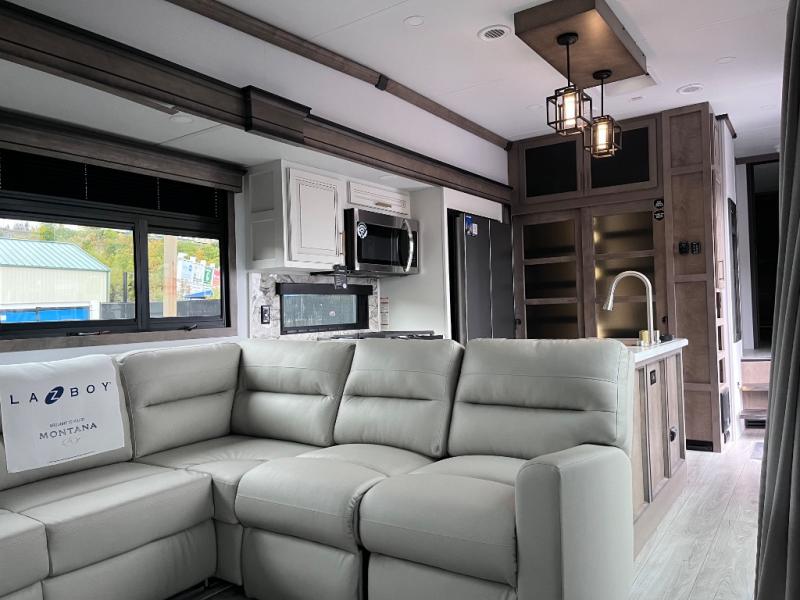 Enjoy luxury, innovation, and the outdoors in any one of Montana's finest fifth wheels. Each set the standard with exceptional features, and exciting factory installed options to provide you a great home on the road. Keystone's exclusive 12" I-beam chassis with z-frame technology has been reengineered to be stronger, lighter and built for "the long haul". A few other construction features you will appreciate include a Road Armor suspension, 2" thick, dual-layered lauan high gloss fiberglass sidewalls, a MaxTurn front cap with KeyShield automotive-grade paint, and a fully walkable roof with an Alpha seamless TPO membrane system. Each feature stylish interiors with two decor choices paired with beautiful hardwood cabinetry, vinyl flooring throughout, central vacuum, plus a La-Z-Boy furniture package for all-around comfort!