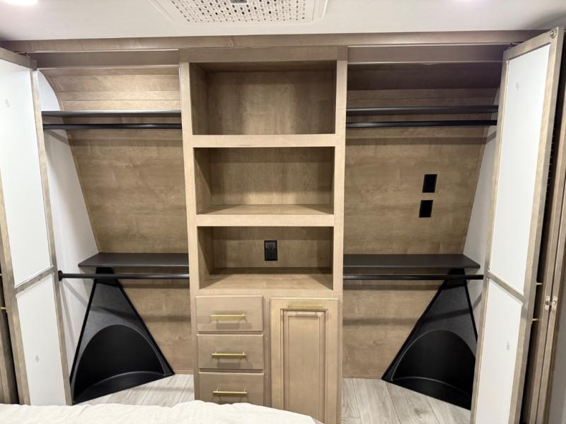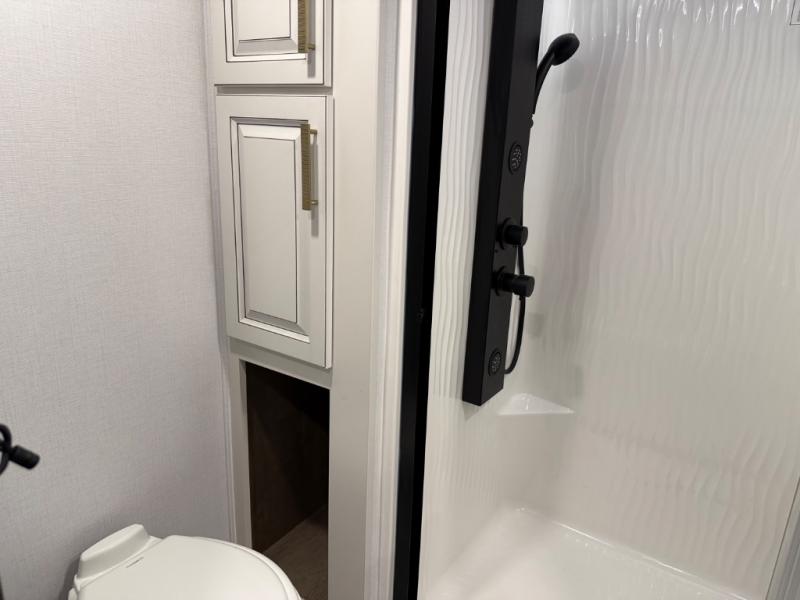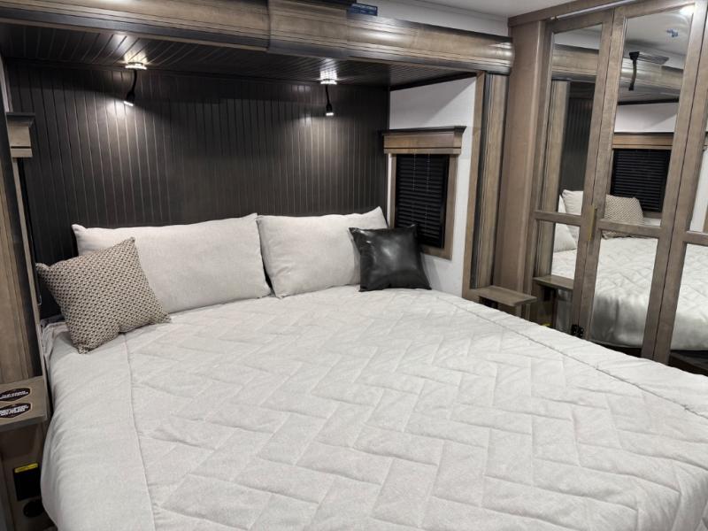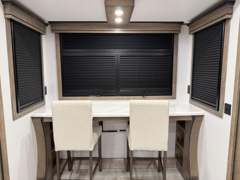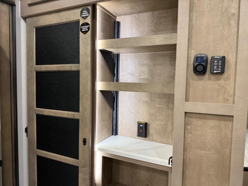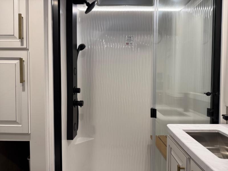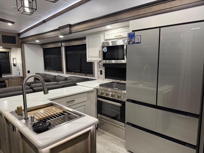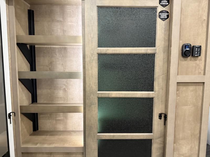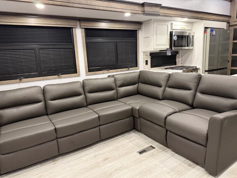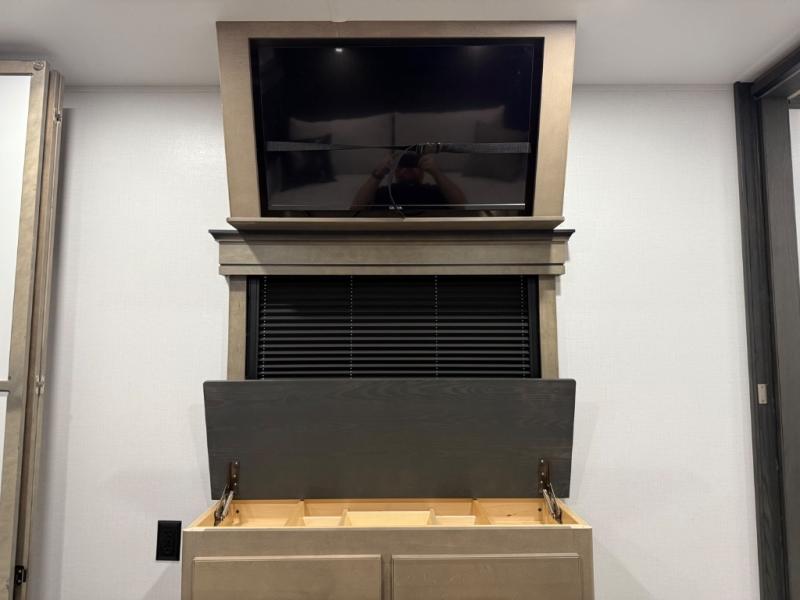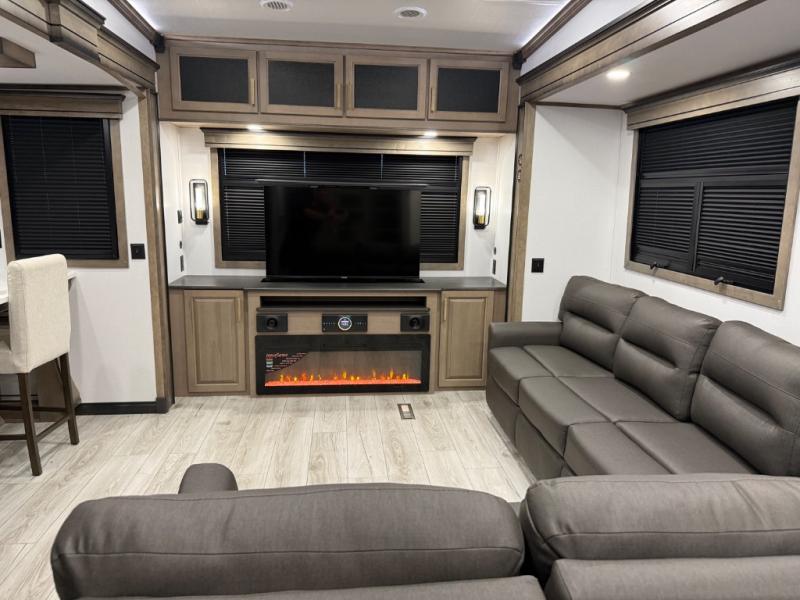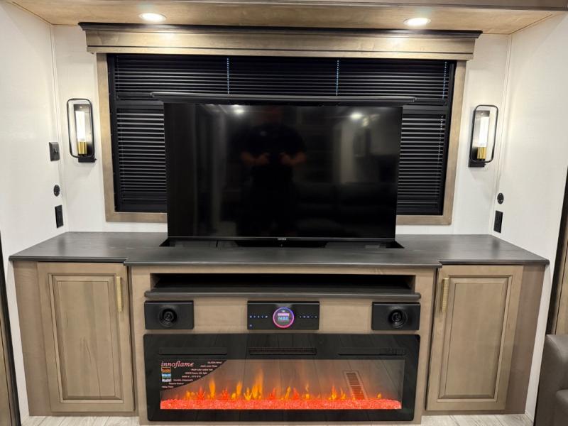 Luxury abounds throughout this fifth wheel starting in the centrally located kitchen featuring an L-shaped counter, a large floor to ceiling pantry with sliding glass doors, a 24" range with an overhead convection microwave, and an 18 cu. ft. residential refrigerator with ice an maker. Just up the steps to the right of the entry, you will find a spacious bathroom featuring a 48" x 30" fiberglass shower with a seat, decorative glass enclosure, linen cabinet, and skylight above it for more natural lighting. Sleep like a baby in the front private bedroom on the king bed slide with storage underneath, and keep your clothes looking their best with the front closets. The rear entertainment living area offers true relaxation with L-shaped seating including a hide-a-bed sofa along the roadside, and powered theater seating facing the entertainment center with a 5,000 BTU decorative fireplace heater and Smart TV to watch your favorite movies! And don't overlook the best part, the powered side patio to entertain guests!