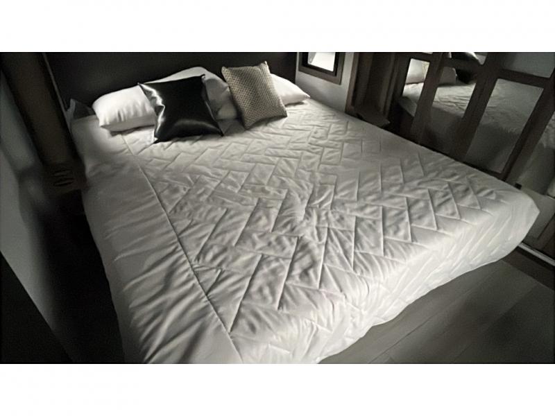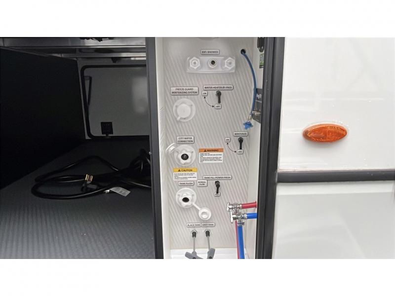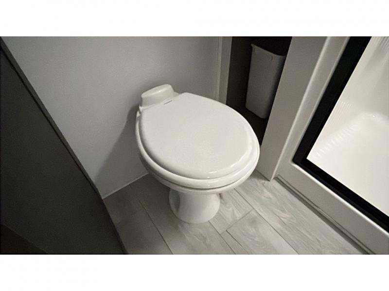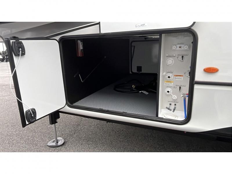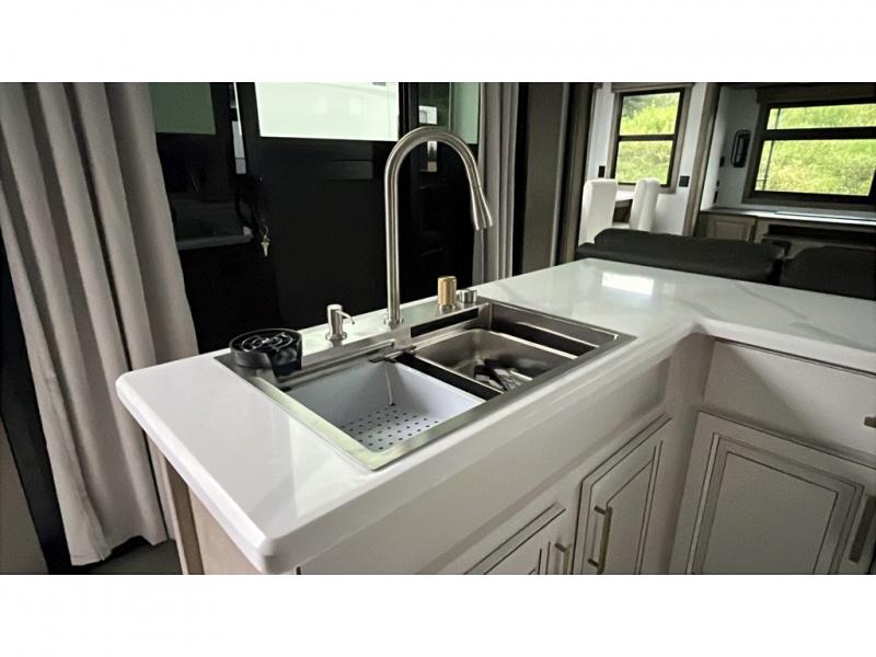 Luxury abounds throughout this fifth wheel starting in the centrally located kitchen featuring an L-shaped counter, a large floor to ceiling pantry with sliding glass doors, a 24" range with an overhead convection microwave, and an 18 cu. ft. residential refrigerator with ice an maker. Just up the steps to the right of the entry, you will find a spacious bathroom featuring a 48" x 30" fiberglass shower with a seat, decorative glass enclosure, linen cabinet, and skylight above it for more natural lighting. Sleep like a baby in the front private bedroom on the king bed slide with storage underneath, and keep your clothes looking their best with the front closets. The rear entertainment living area offers true relaxation with L-shaped seating including a hide-a-bed sofa along the roadside, and powered theater seating facing the entertainment center with a 5,000 BTU decorative fireplace heater and Smart TV to watch your favorite movies! And don't overlook the best part, the powered side patio to entertain guests!