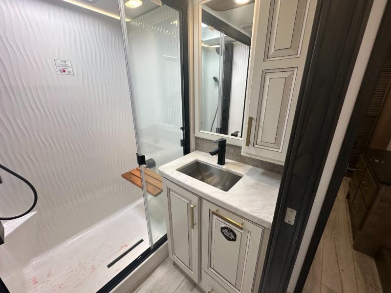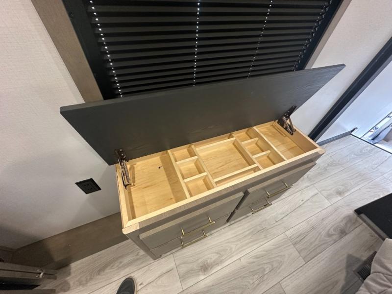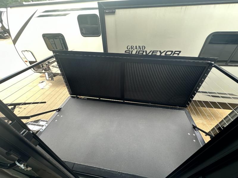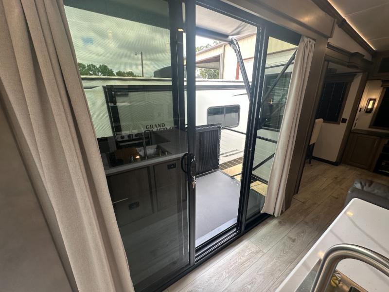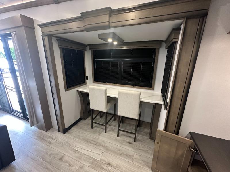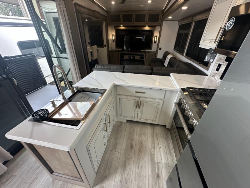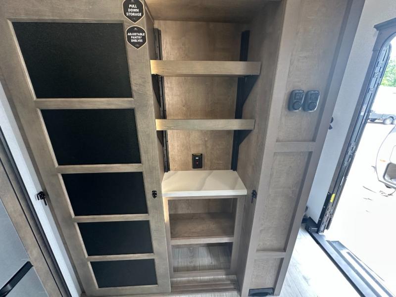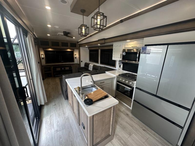Luxury abounds throughout this fifth wheel starting in the centrally located kitchen featuring an L-shaped counter, a large floor to ceiling pantry with sliding glass doors, a 24" range with an overhead convection microwave, and an 18 cu. ft. residential refrigerator with ice an maker. Just up the steps to the right of the entry, you will find a spacious bathroom featuring a 48" x 30" fiberglass shower with a seat, decorative glass enclosure, linen cabinet, and skylight above it for more natural lighting. Sleep like a baby in the front private bedroom on the king bed slide with storage underneath, and keep your clothes looking their best with the front closets. The rear entertainment living area offers true relaxation with L-shaped seating including a hide-a-bed sofa along the roadside, and powered theater seating facing the entertainment center with a 5,000 BTU decorative fireplace heater and Smart TV to watch your favorite movies! And don't overlook the best part, the powered side patio to entertain guests!
