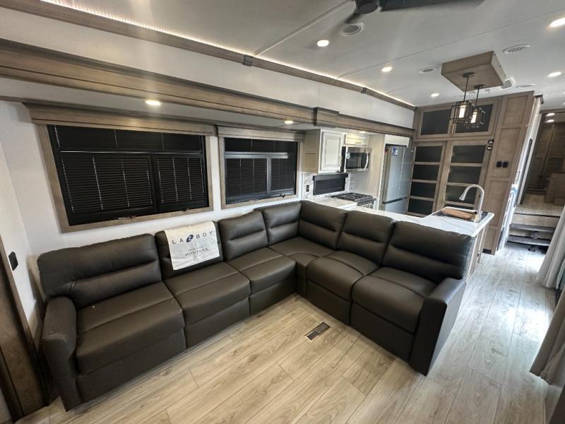 Enjoy luxury, innovation, and the outdoors in any one of Montana's finest fifth wheels. Each set the standard with exceptional features, and exciting factory installed options to provide you a great home on the road. Keystone's exclusive 12" I-beam chassis with z-frame technology has been reengineered to be stronger, lighter and built for "the long haul". A few other construction features you will appreciate include a Road Armor suspension, 2" thick, dual-layered lauan high gloss fiberglass sidewalls, a MaxTurn front cap with KeyShield automotive-grade paint, and a fully walkable roof with an Alpha seamless TPO membrane system. Each feature stylish interiors with two decor choices paired with beautiful hardwood cabinetry, vinyl flooring throughout, central vacuum, plus a La-Z-Boy furniture package for all-around comfort!