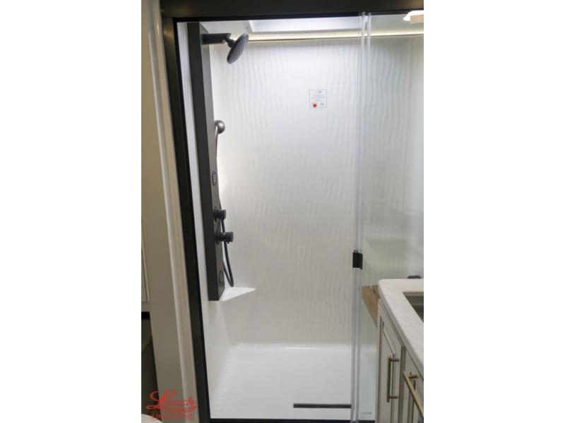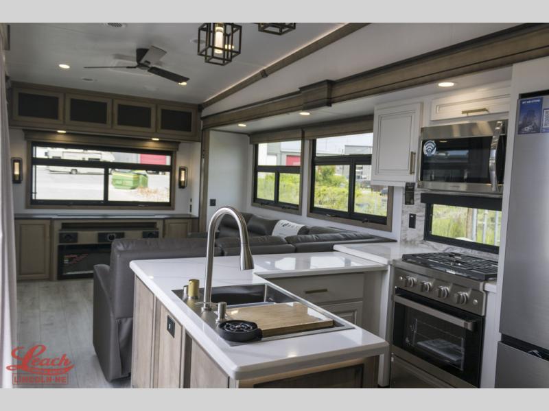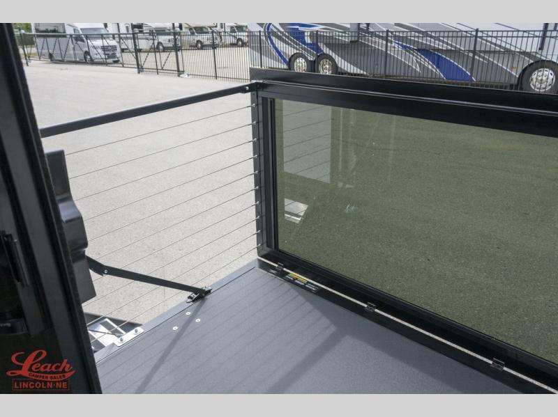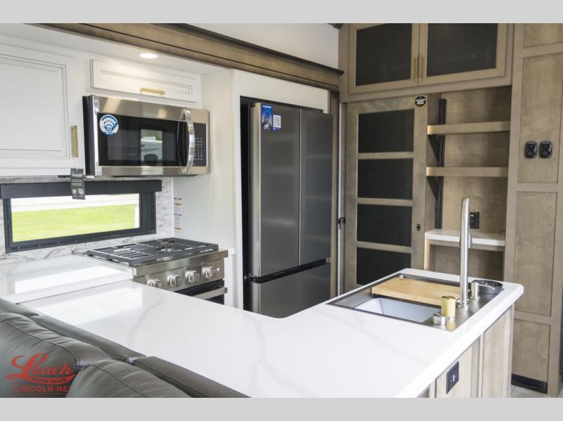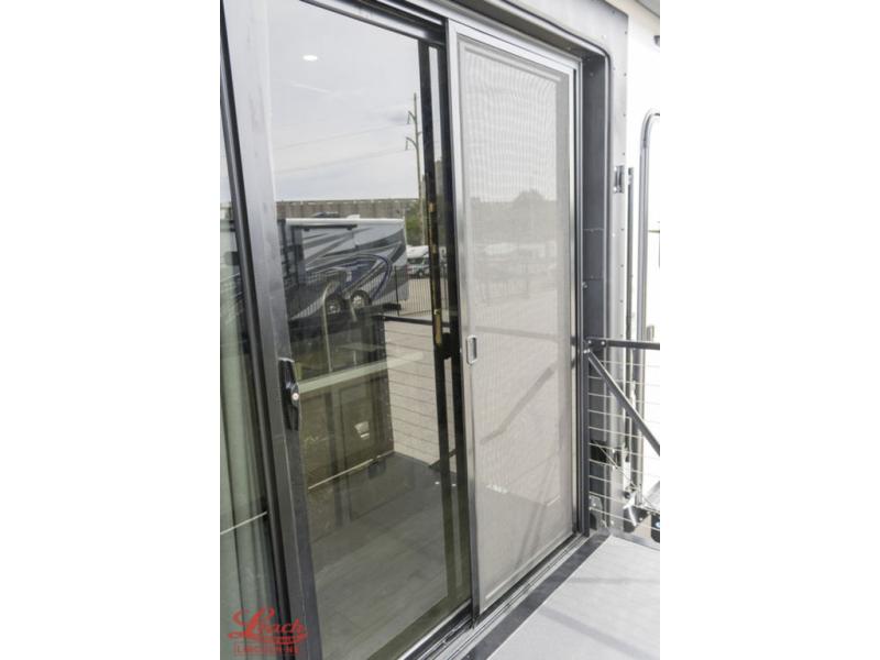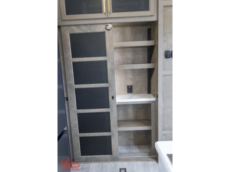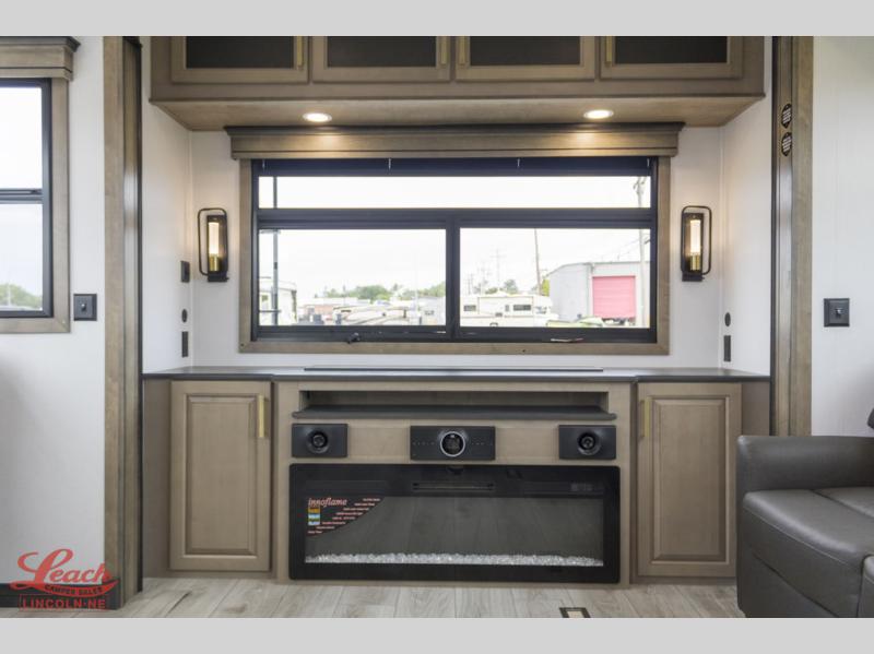 Luxury abounds throughout this fifth wheel starting in the centrally located kitchen featuring an L-shaped counter, a large floor to ceiling pantry with sliding glass doors, a 24" range with an overhead convection microwave, and an 18 cu. ft. residential refrigerator with ice an maker. Just up the steps to the right of the entry, you will find a spacious bathroom featuring a 48" x 30" fiberglass shower with a seat, decorative glass enclosure, linen cabinet, and skylight above it for more natural lighting. Sleep like a baby in the front private bedroom on the king bed slide with storage underneath, and keep your clothes looking their best with the front closets. The rear entertainment living area offers true relaxation with L-shaped seating including a hide-a-bed sofa along the roadside, and powered theater seating facing the entertainment center with a 5,000 BTU decorative fireplace heater and Smart TV to watch your favorite movies! And don't overlook the best part, the powered side patio to entertain guests!
