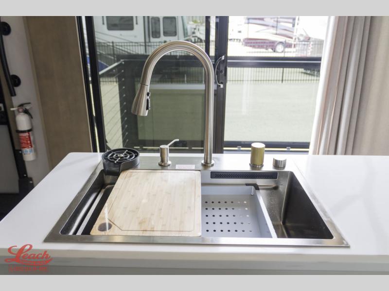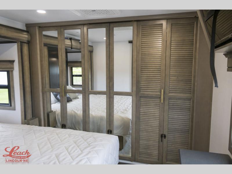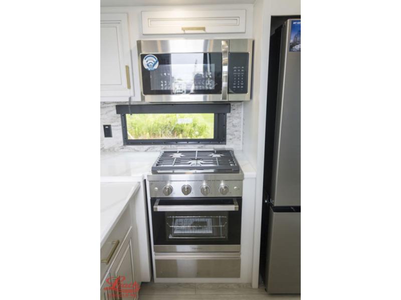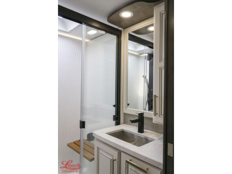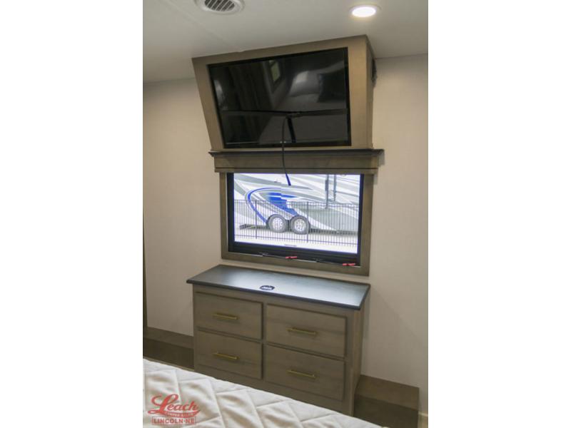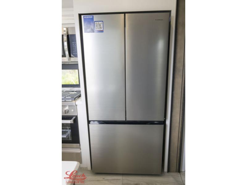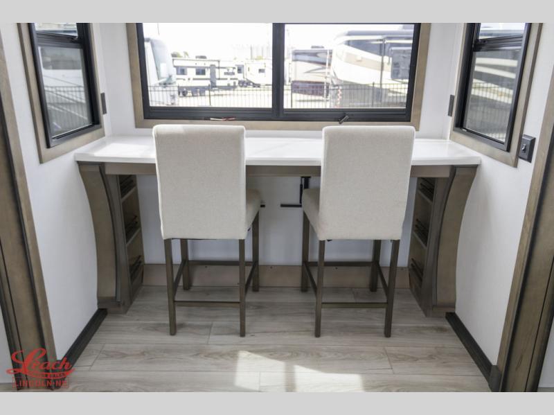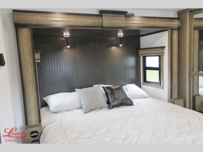 Luxury abounds throughout this fifth wheel starting in the centrally located kitchen featuring an L-shaped counter, a large floor to ceiling pantry with sliding glass doors, a 24" range with an overhead convection microwave, and an 18 cu. ft. residential refrigerator with ice an maker. Just up the steps to the right of the entry, you will find a spacious bathroom featuring a 48" x 30" fiberglass shower with a seat, decorative glass enclosure, linen cabinet, and skylight above it for more natural lighting. Sleep like a baby in the front private bedroom on the king bed slide with storage underneath, and keep your clothes looking their best with the front closets. The rear entertainment living area offers true relaxation with L-shaped seating including a hide-a-bed sofa along the roadside, and powered theater seating facing the entertainment center with a 5,000 BTU decorative fireplace heater and Smart TV to watch your favorite movies! And don't overlook the best part, the powered side patio to entertain guests!