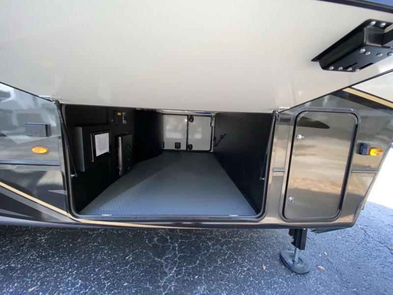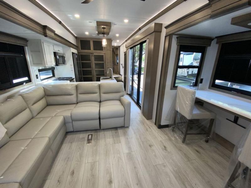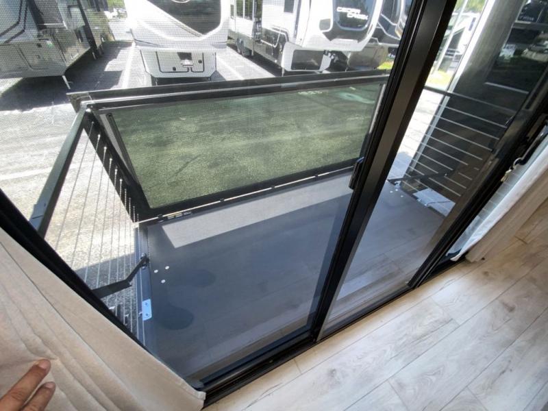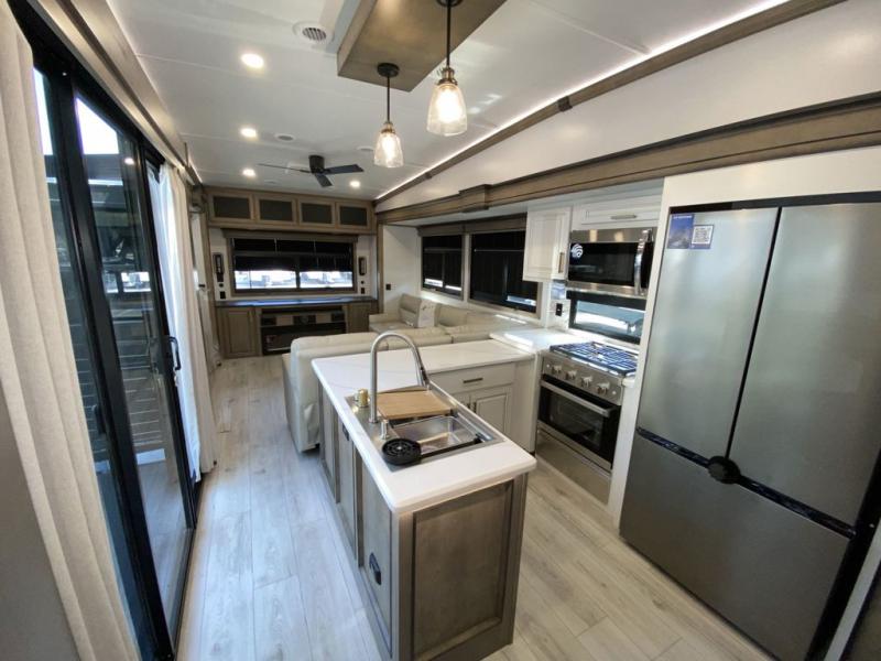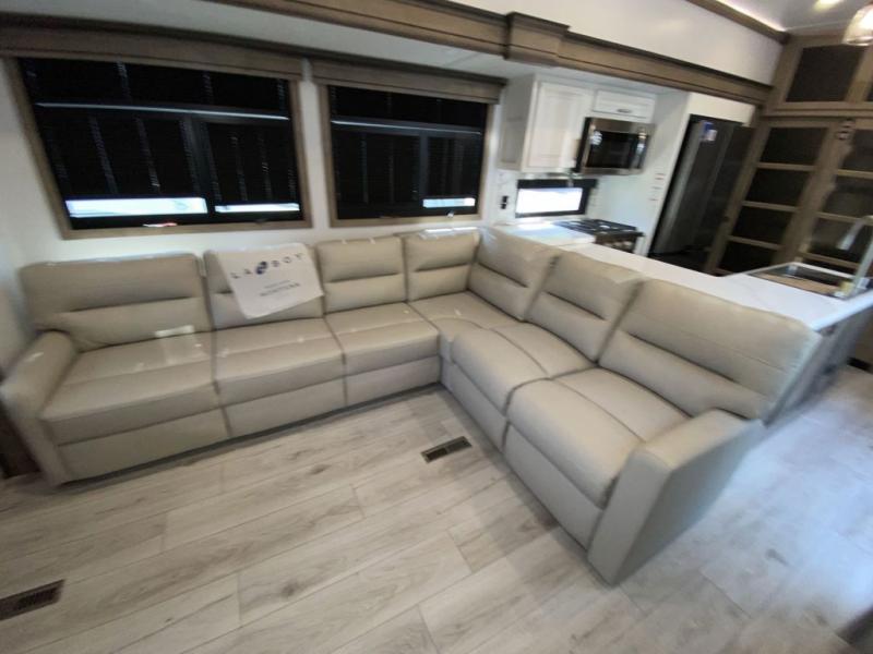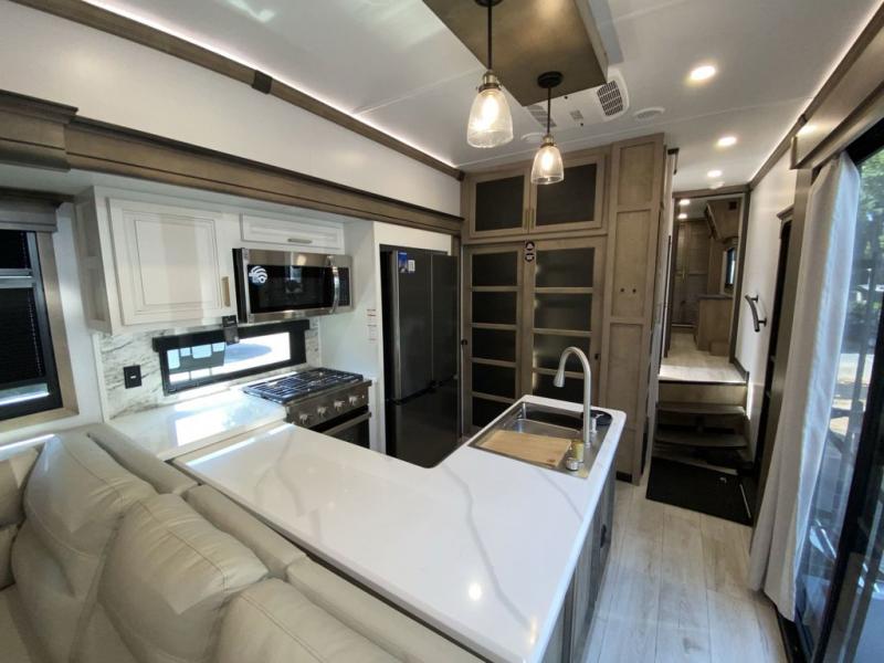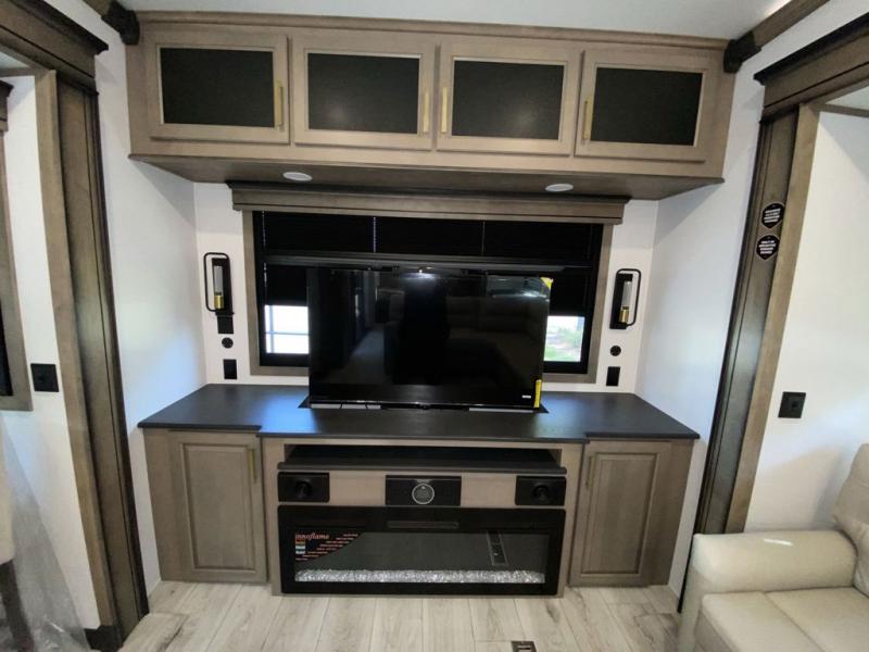 Luxury abounds throughout this fifth wheel starting in the centrally located kitchen featuring an L-shaped counter, a large floor to ceiling pantry with sliding glass doors, a 24" range with an overhead convection microwave, and an 18 cu. ft. residential refrigerator with ice an maker. Just up the steps to the right of the entry, you will find a spacious bathroom featuring a 48" x 30" fiberglass shower with a seat, decorative glass enclosure, linen cabinet, and skylight above it for more natural lighting. Sleep like a baby in the front private bedroom on the king bed slide with storage underneath, and keep your clothes looking their best with the front closets. The rear entertainment living area offers true relaxation with L-shaped seating including a hide-a-bed sofa along the roadside, and powered theater seating facing the entertainment center with a 5,000 BTU decorative fireplace heater and Smart TV to watch your favorite movies! And don't overlook the best part, the powered side patio to entertain guests!