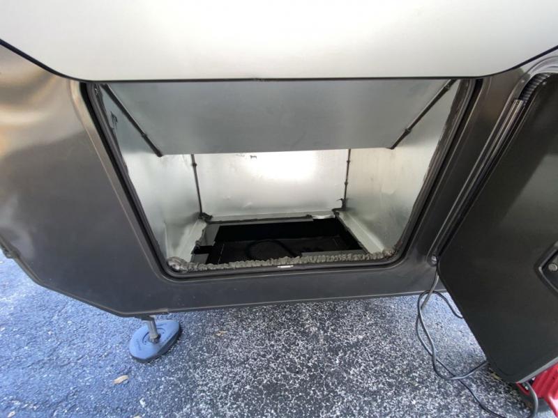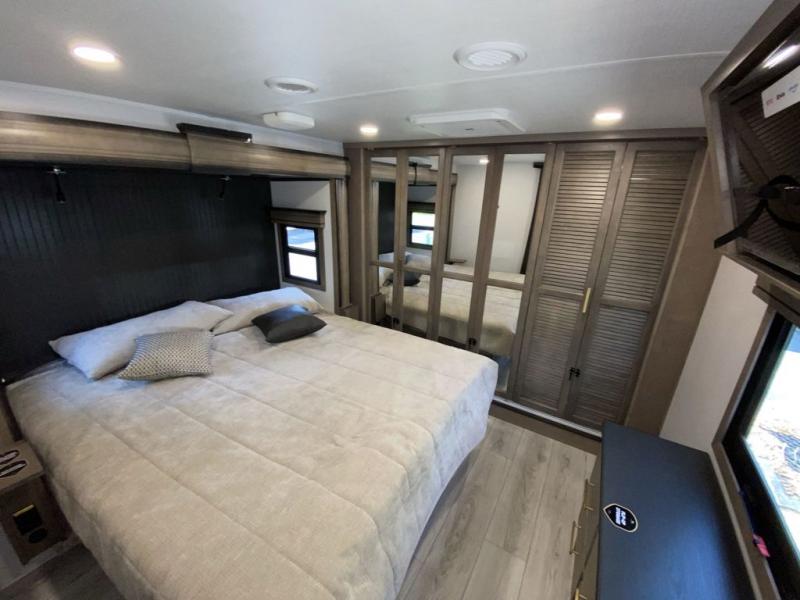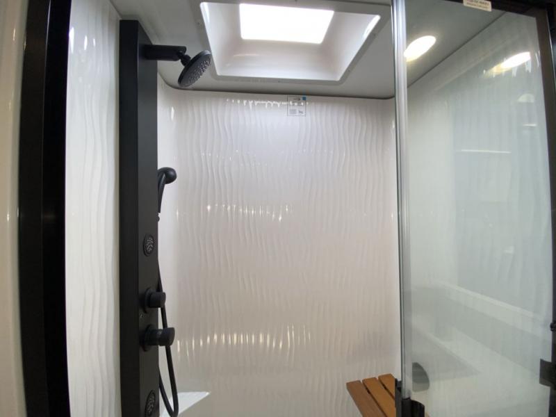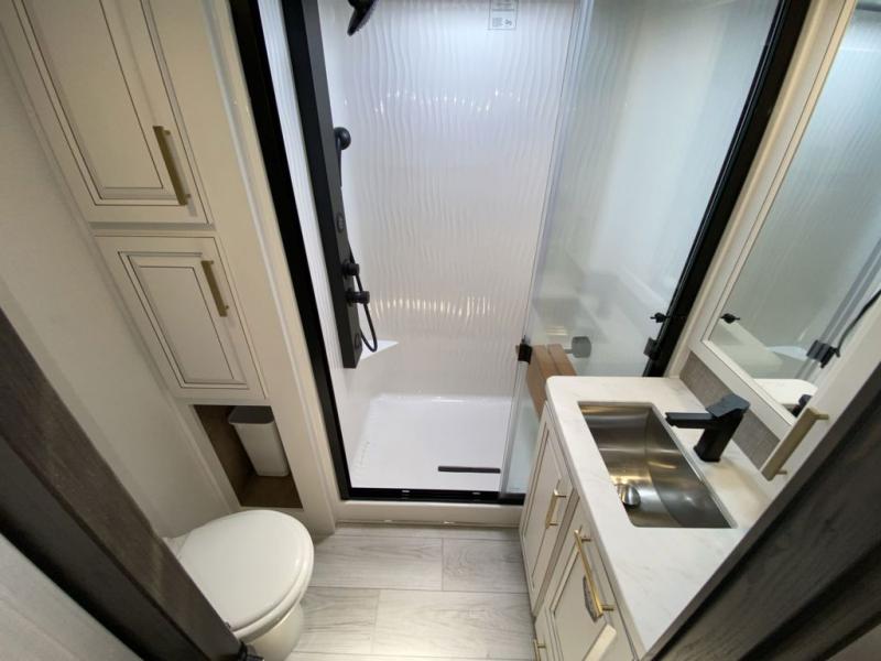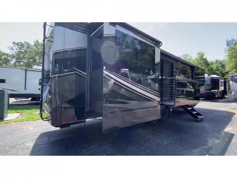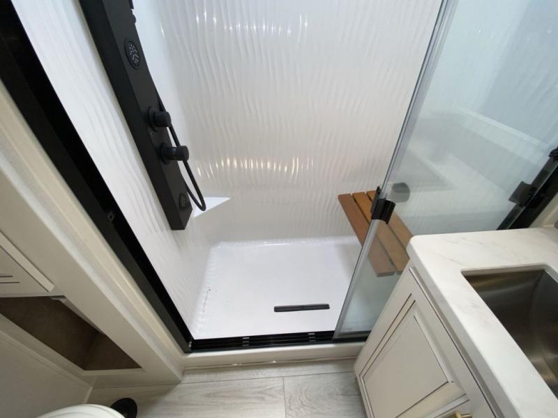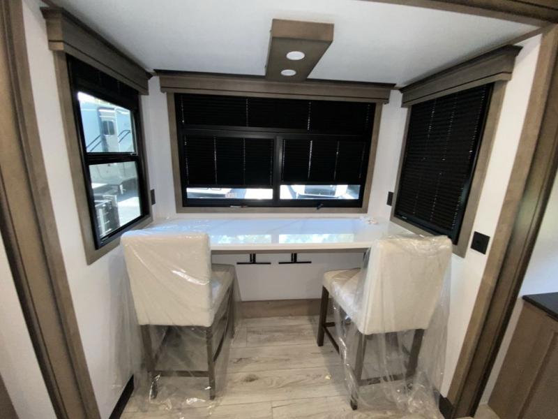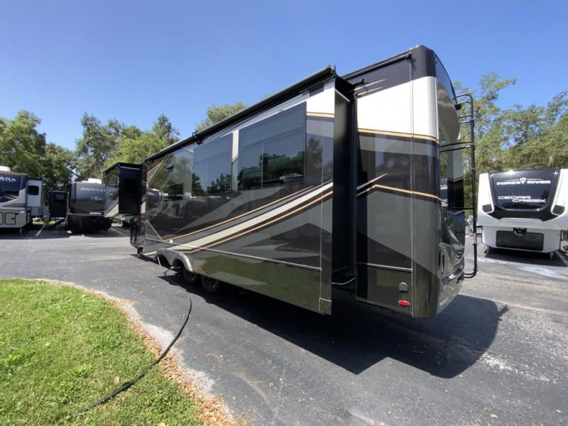 Luxury abounds throughout this fifth wheel starting in the centrally located kitchen featuring an L-shaped counter, a large floor to ceiling pantry with sliding glass doors, a 24" range with an overhead convection microwave, and an 18 cu. ft. residential refrigerator with ice an maker. Just up the steps to the right of the entry, you will find a spacious bathroom featuring a 48" x 30" fiberglass shower with a seat, decorative glass enclosure, linen cabinet, and skylight above it for more natural lighting. Sleep like a baby in the front private bedroom on the king bed slide with storage underneath, and keep your clothes looking their best with the front closets. The rear entertainment living area offers true relaxation with L-shaped seating including a hide-a-bed sofa along the roadside, and powered theater seating facing the entertainment center with a 5,000 BTU decorative fireplace heater and Smart TV to watch your favorite movies! And don't overlook the best part, the powered side patio to entertain guests!