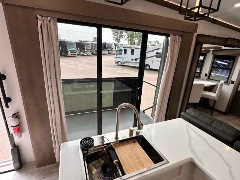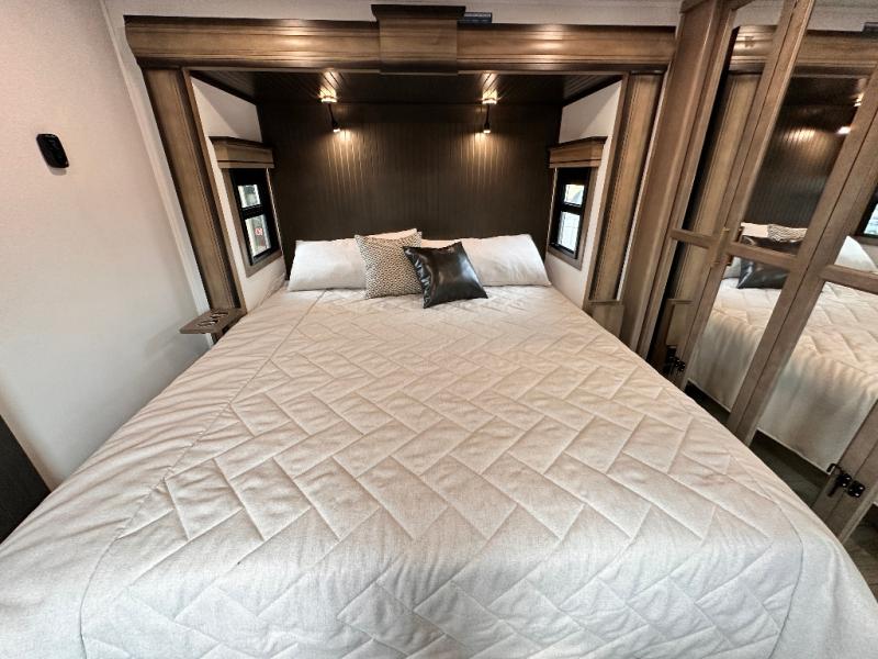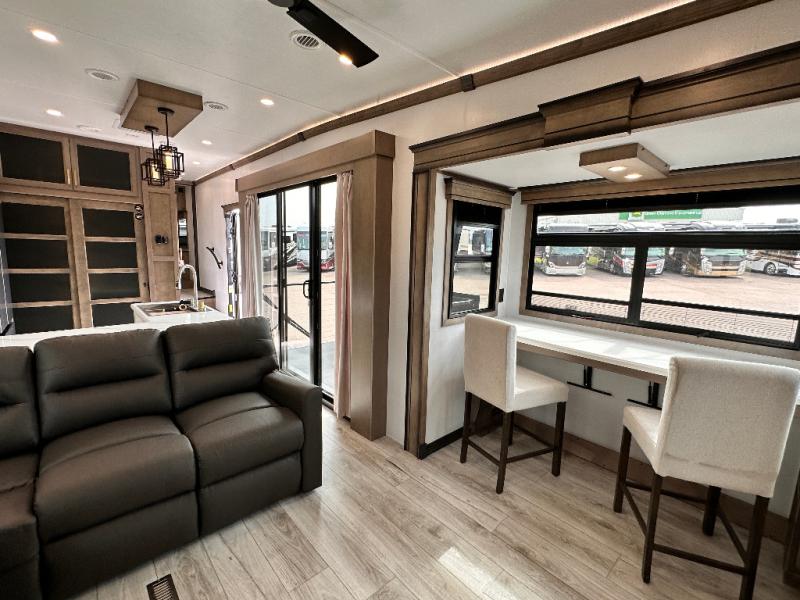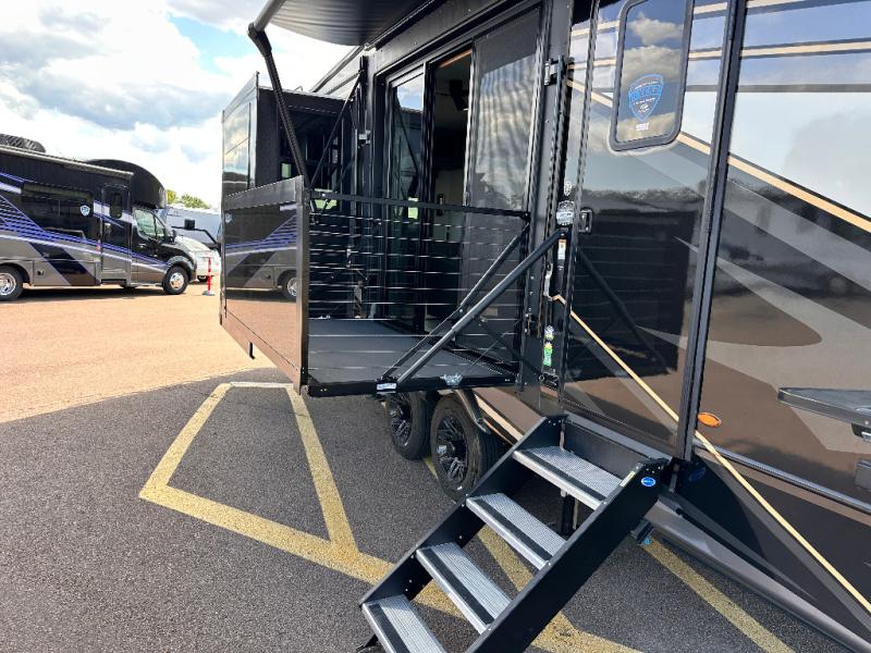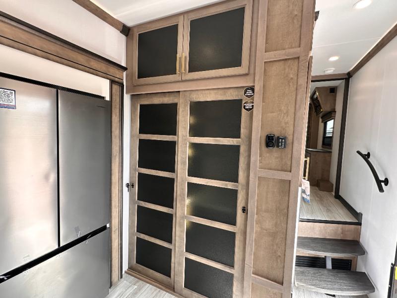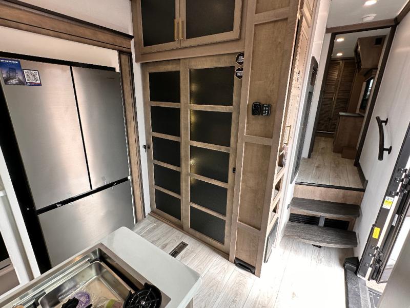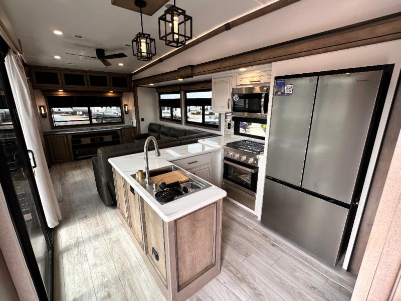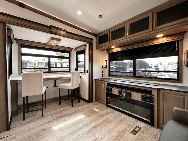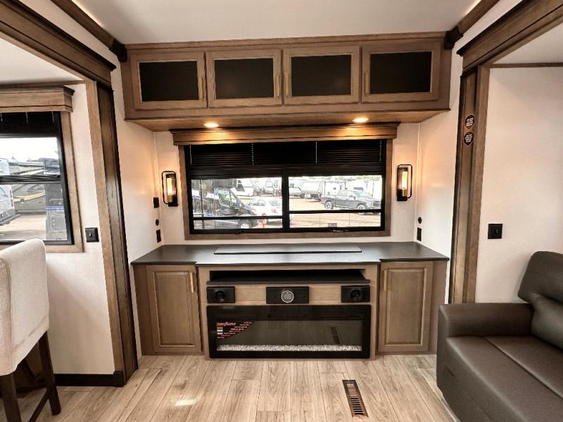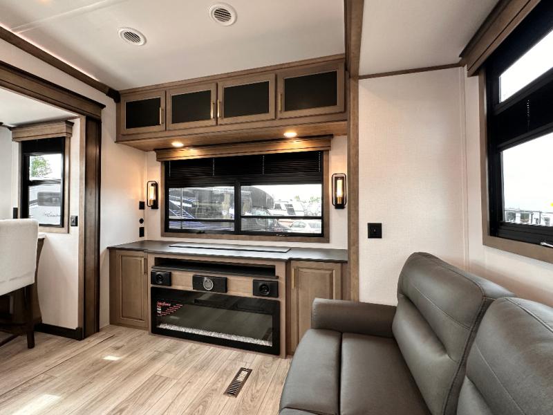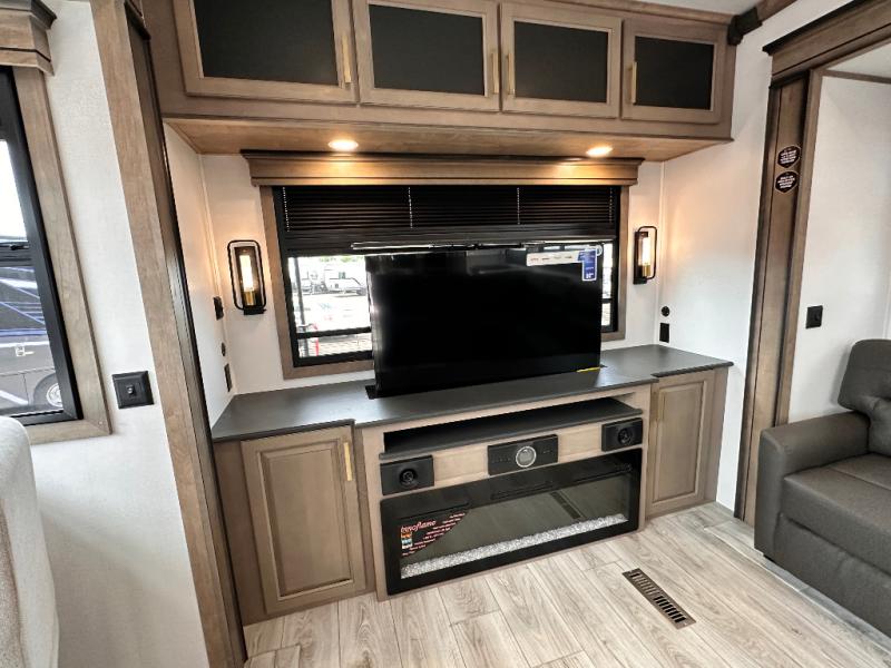 Luxury abounds throughout this fifth wheel starting in the centrally located kitchen featuring an L-shaped counter, a large floor to ceiling pantry with sliding glass doors, a 24" range with an overhead convection microwave, and an 18 cu. ft. residential refrigerator with ice an maker. Just up the steps to the right of the entry, you will find a spacious bathroom featuring a 48" x 30" fiberglass shower with a seat, decorative glass enclosure, linen cabinet, and skylight above it for more natural lighting. Sleep like a baby in the front private bedroom on the king bed slide with storage underneath, and keep your clothes looking their best with the front closets. The rear entertainment living area offers true relaxation with L-shaped seating including a hide-a-bed sofa along the roadside, and powered theater seating facing the entertainment center with a 5,000 BTU decorative fireplace heater and Smart TV to watch your favorite movies! And don't overlook the best part, the powered side patio to entertain guests!
