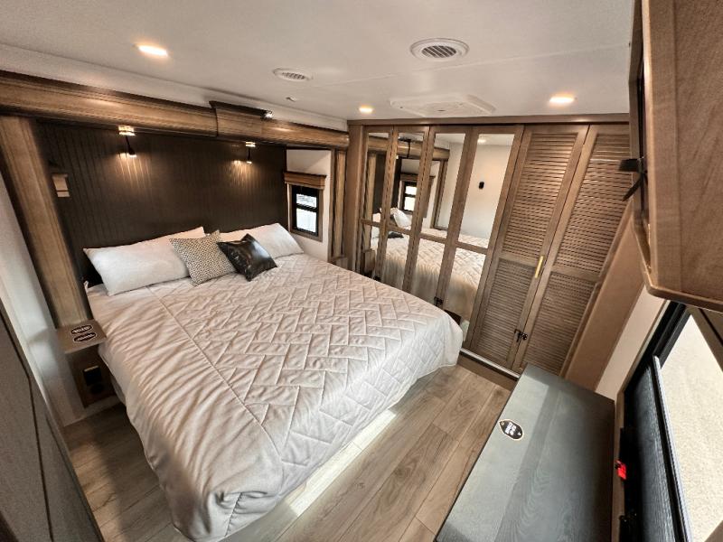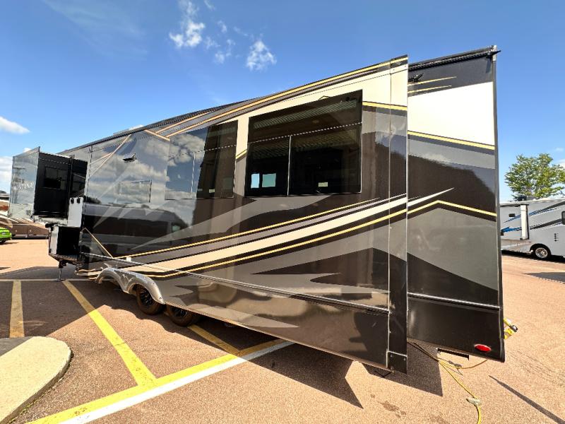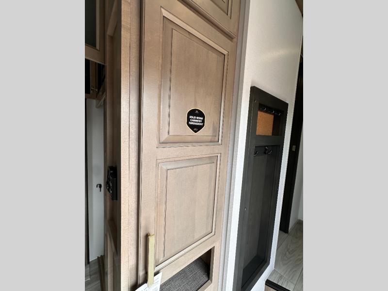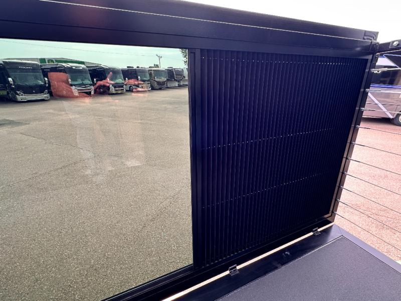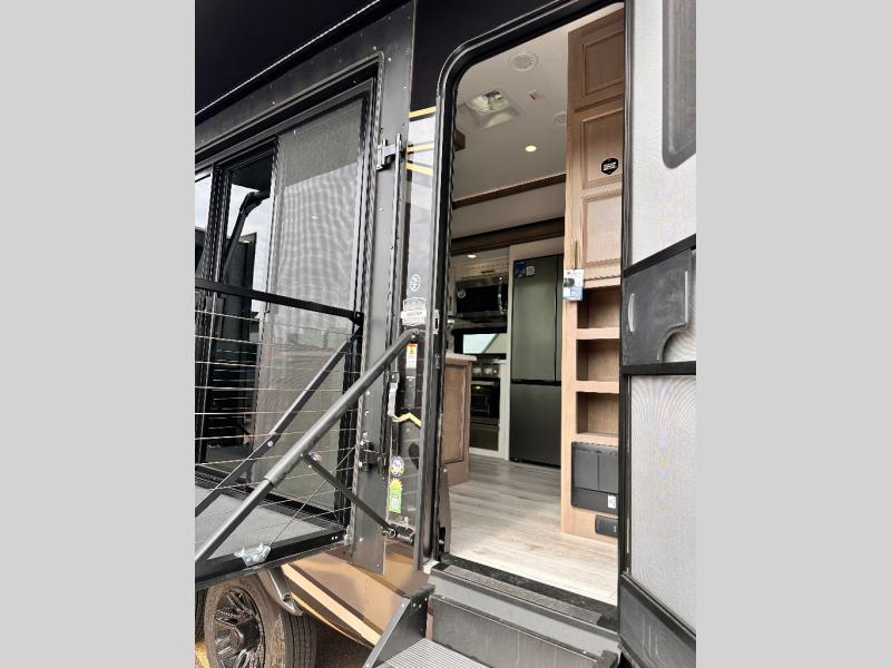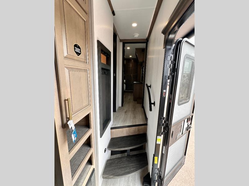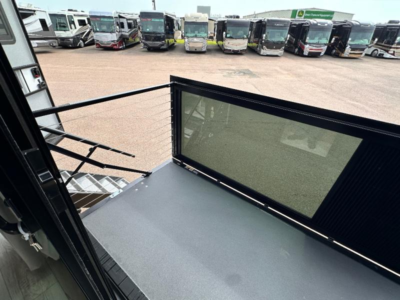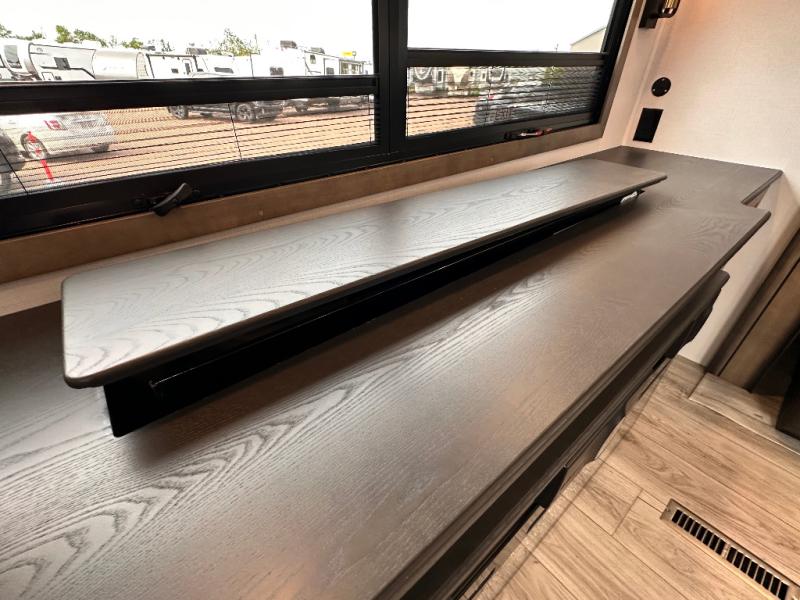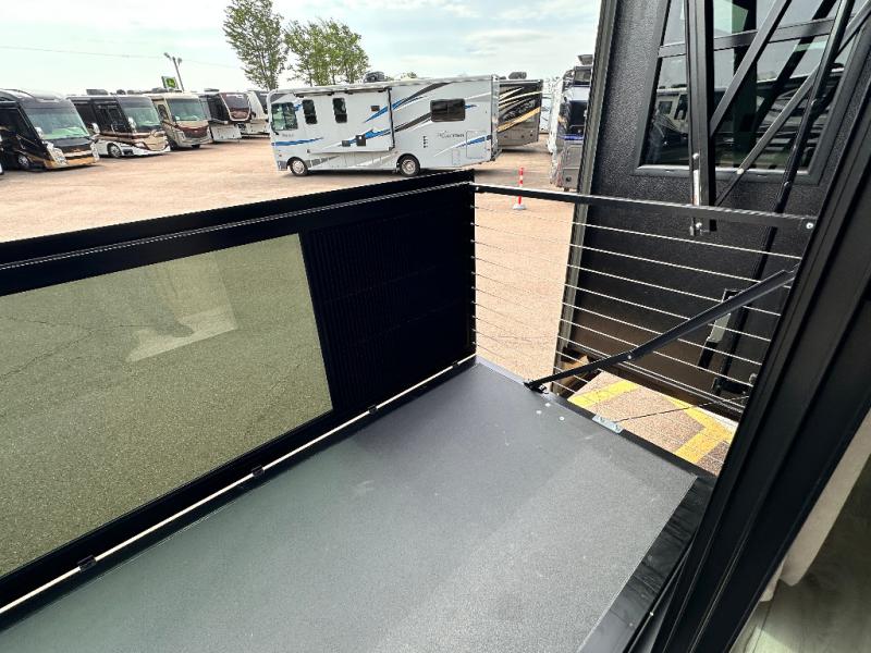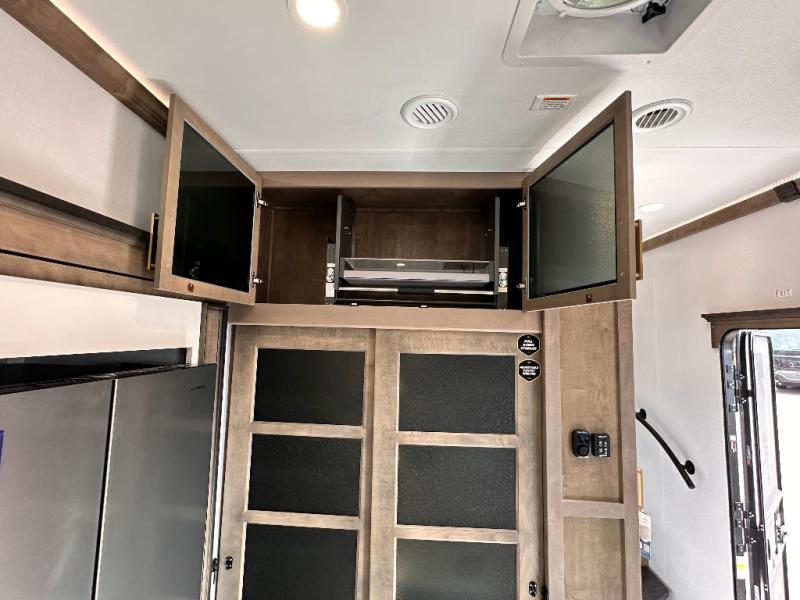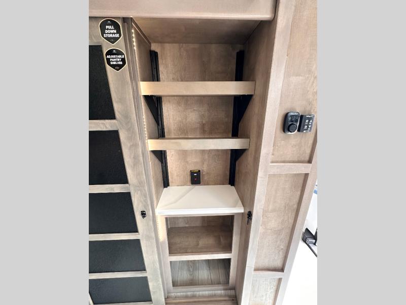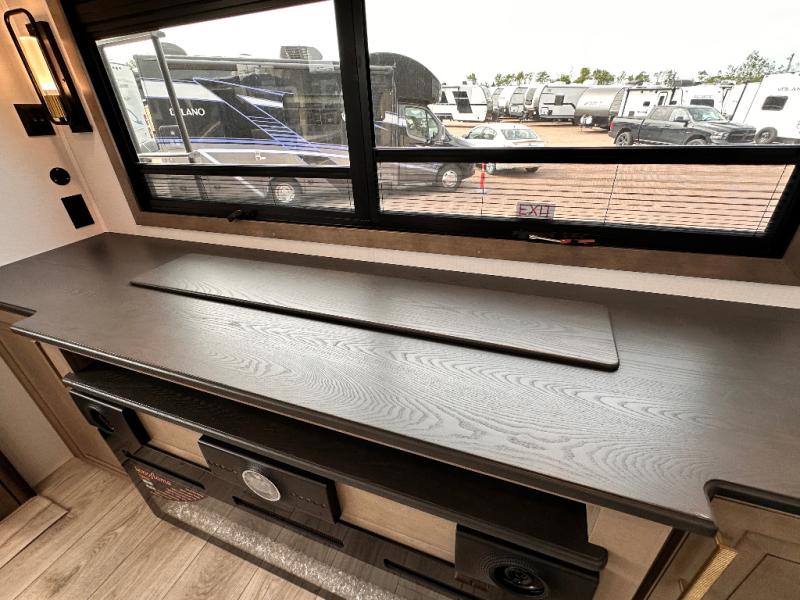 Luxury abounds throughout this fifth wheel starting in the centrally located kitchen featuring an L-shaped counter, a large floor to ceiling pantry with sliding glass doors, a 24" range with an overhead convection microwave, and an 18 cu. ft. residential refrigerator with ice an maker. Just up the steps to the right of the entry, you will find a spacious bathroom featuring a 48" x 30" fiberglass shower with a seat, decorative glass enclosure, linen cabinet, and skylight above it for more natural lighting. Sleep like a baby in the front private bedroom on the king bed slide with storage underneath, and keep your clothes looking their best with the front closets. The rear entertainment living area offers true relaxation with L-shaped seating including a hide-a-bed sofa along the roadside, and powered theater seating facing the entertainment center with a 5,000 BTU decorative fireplace heater and Smart TV to watch your favorite movies! And don't overlook the best part, the powered side patio to entertain guests!