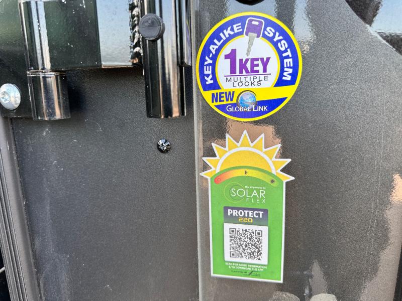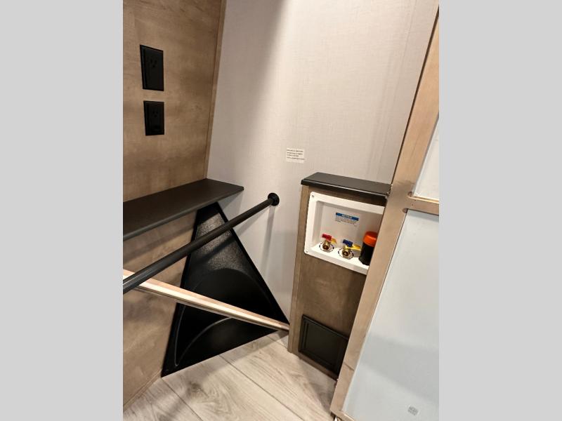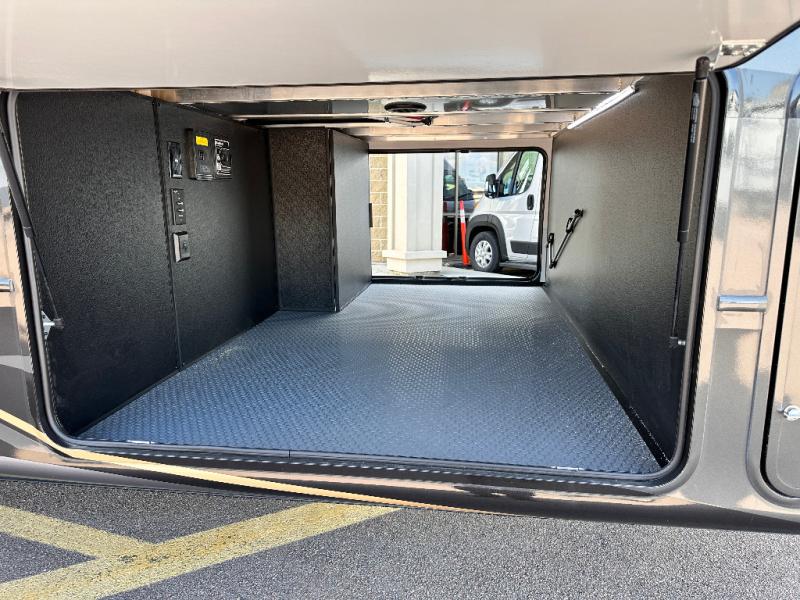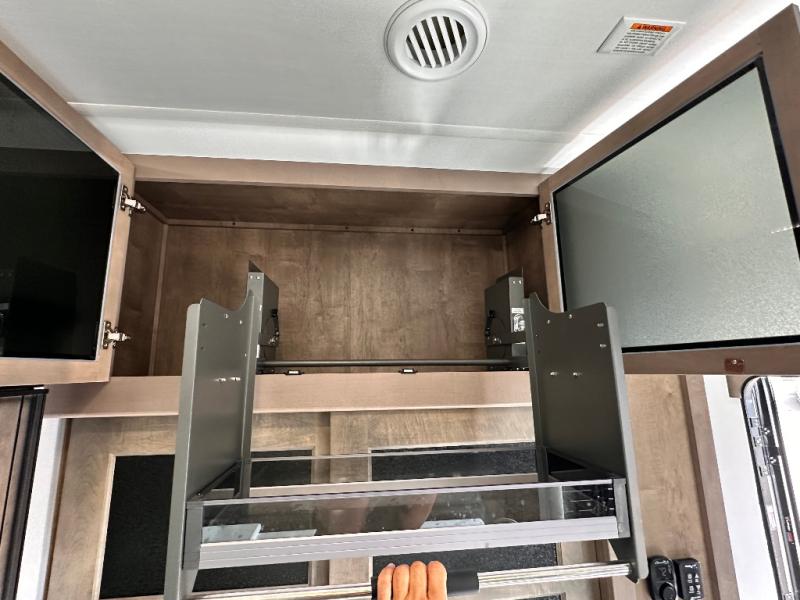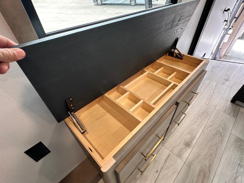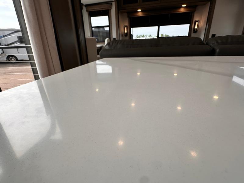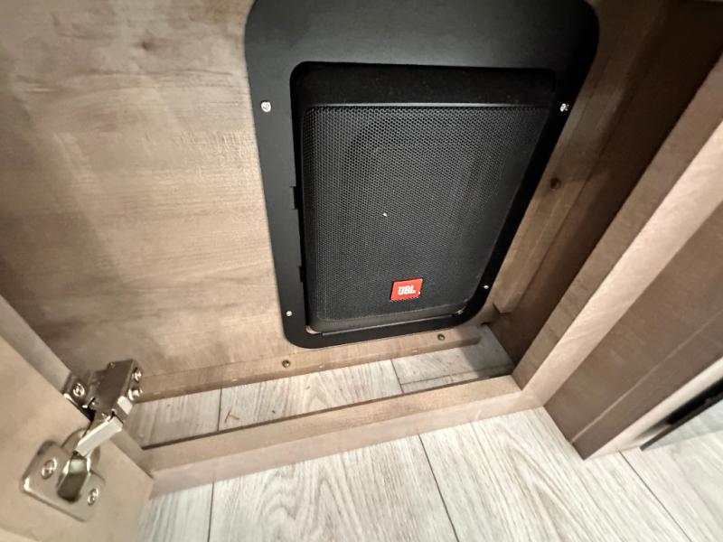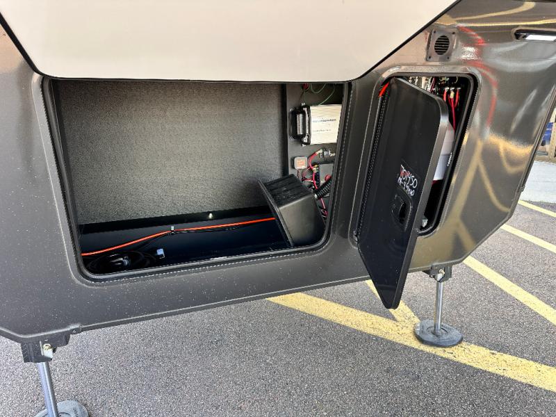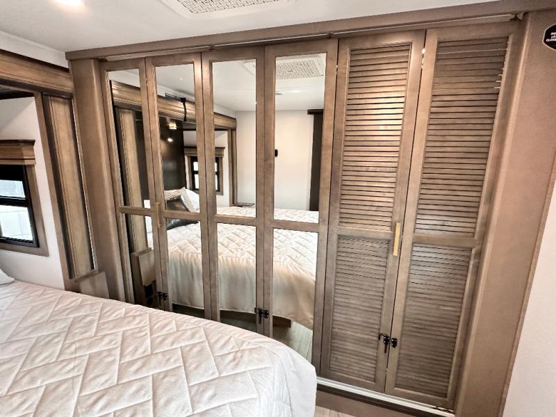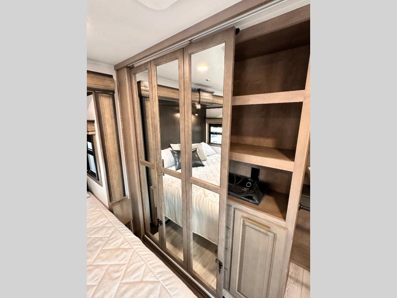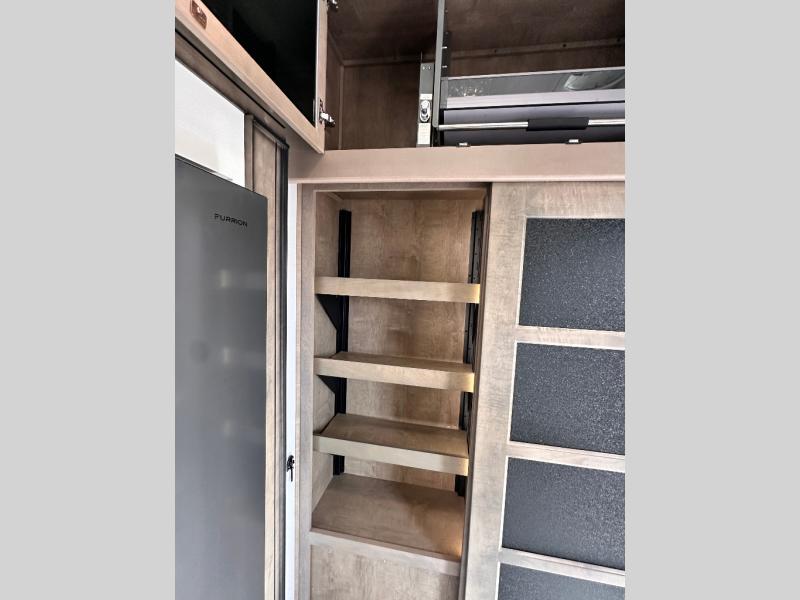 Luxury abounds throughout this fifth wheel starting in the centrally located kitchen featuring an L-shaped counter, a large floor to ceiling pantry with sliding glass doors, a 24" range with an overhead convection microwave, and an 18 cu. ft. residential refrigerator with ice an maker. Just up the steps to the right of the entry, you will find a spacious bathroom featuring a 48" x 30" fiberglass shower with a seat, decorative glass enclosure, linen cabinet, and skylight above it for more natural lighting. Sleep like a baby in the front private bedroom on the king bed slide with storage underneath, and keep your clothes looking their best with the front closets. The rear entertainment living area offers true relaxation with L-shaped seating including a hide-a-bed sofa along the roadside, and powered theater seating facing the entertainment center with a 5,000 BTU decorative fireplace heater and Smart TV to watch your favorite movies! And don't overlook the best part, the powered side patio to entertain guests!