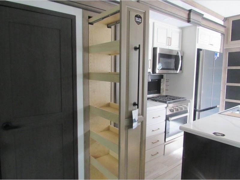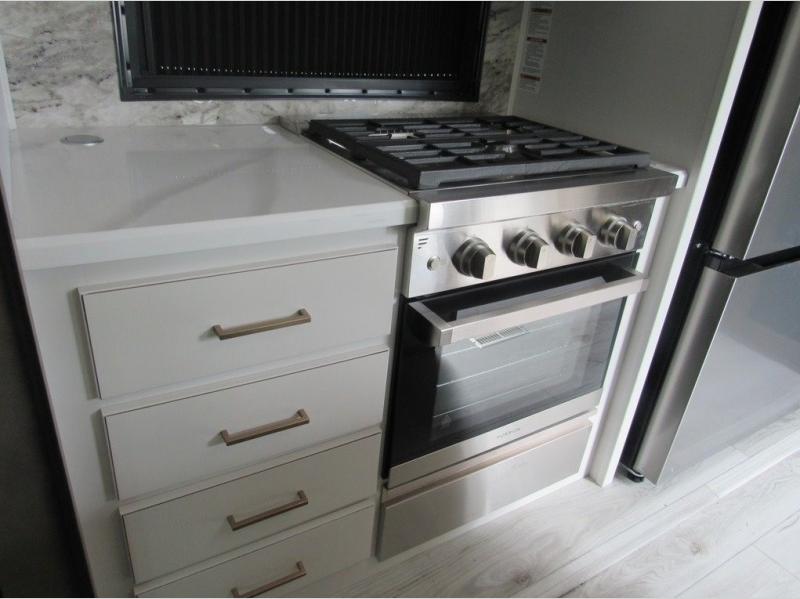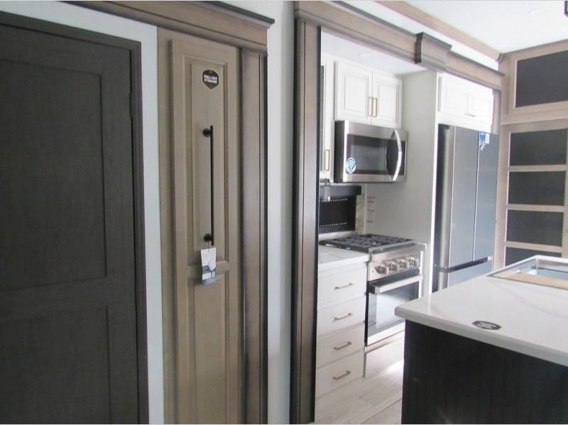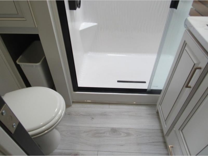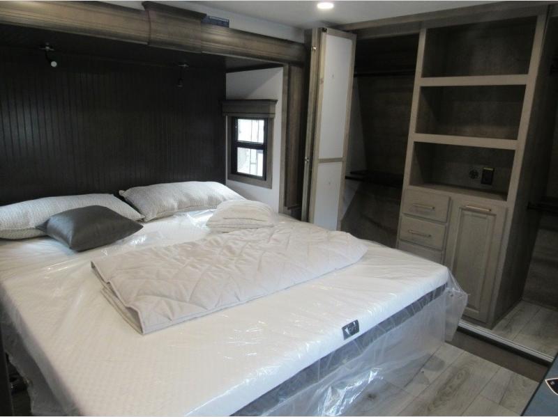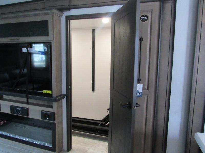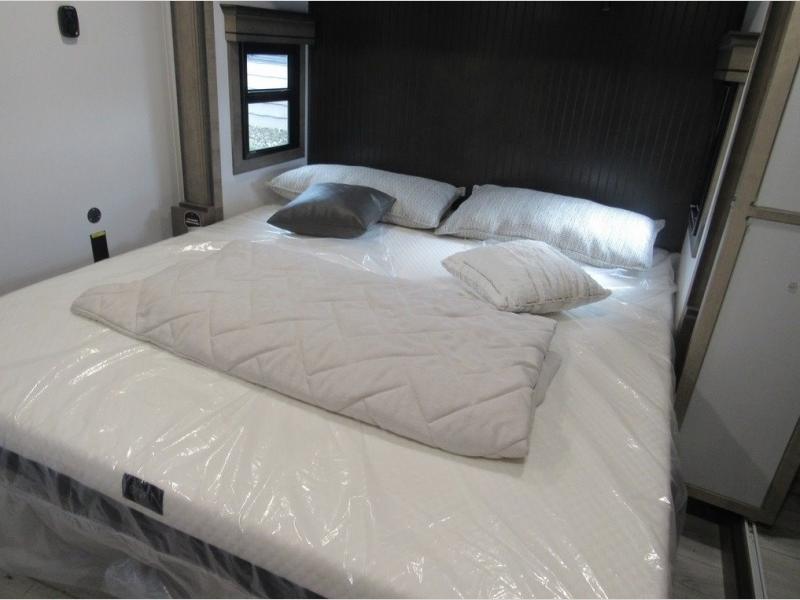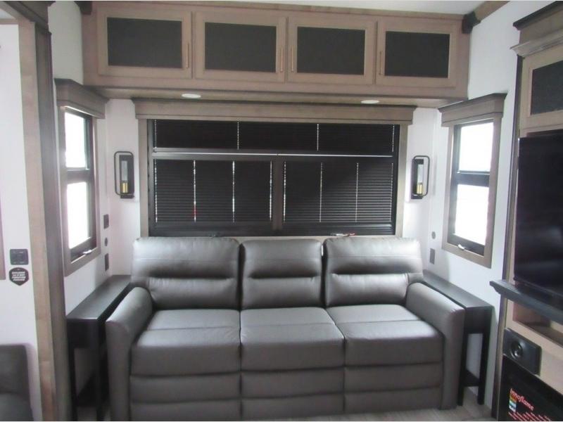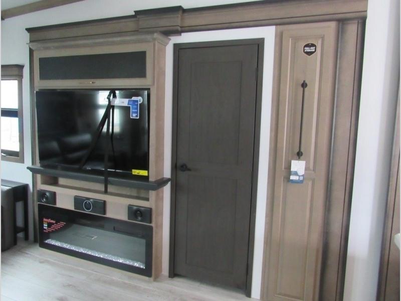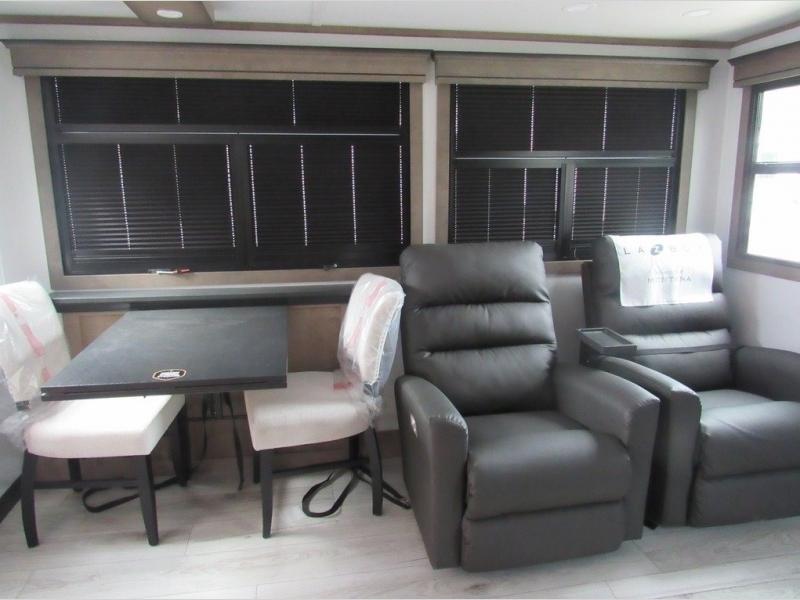 This fifth wheel has everything you need! The front private bedroom has a king bed slide across from a Smart HDTV with a dresser below it, plus a large front closet with a clothing hamper and stackable washer and dryer prep. Freshen up each morning in the full bathroom with the 48" x 30" fiberglass shower with a seat and skylight above for more natural lighting as you get ready. The kitchen has everything you need to prepare your best meals including extra countertop space on the kitchen island. Enjoy your meals at the dinette with storage and then relax on the rear hide-a-bed sofa or the power theater seating across from the entertainment center with a 5,000 BTU decorative fireplace heater and 50" Smart HDTV to watch your favorite movies!