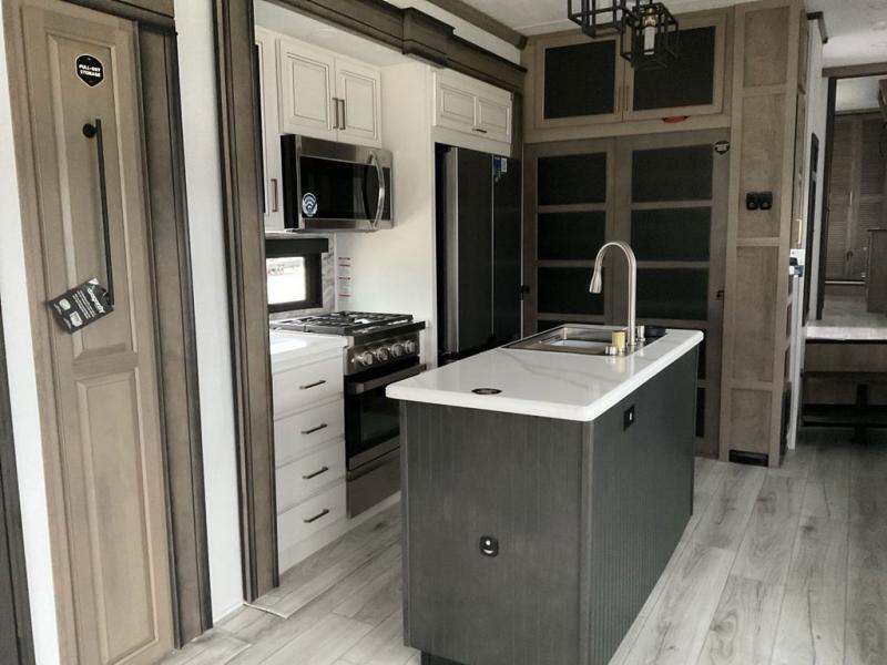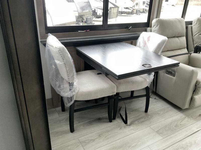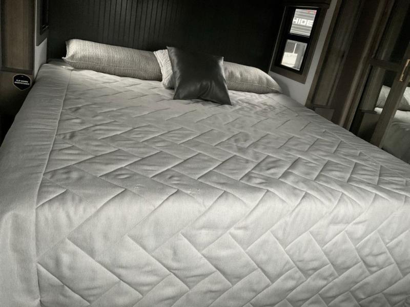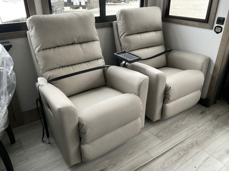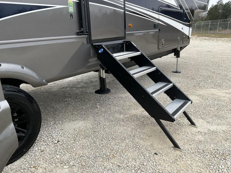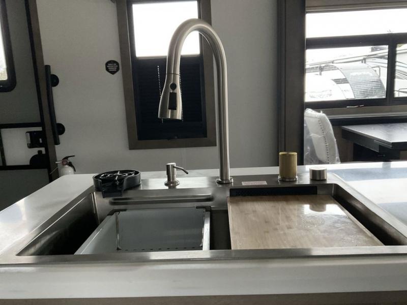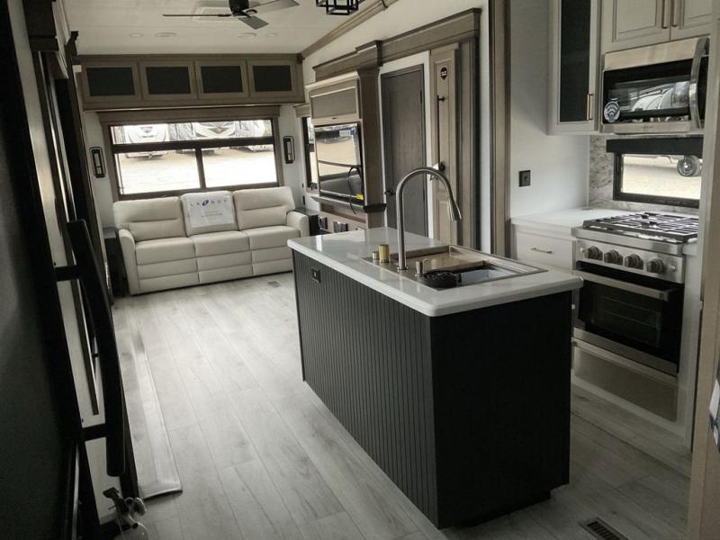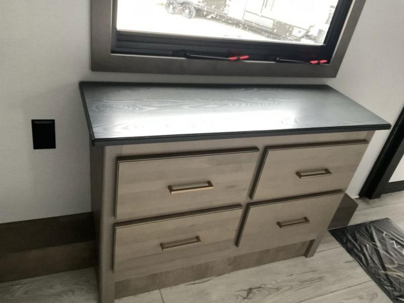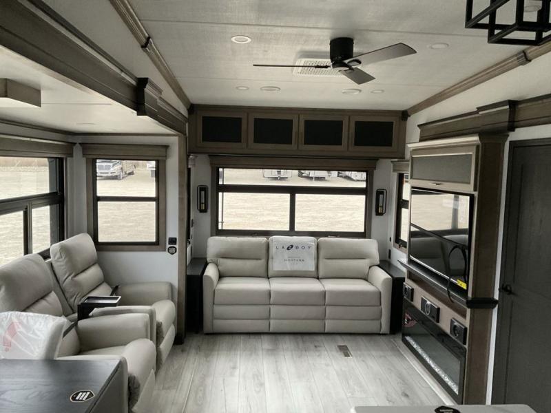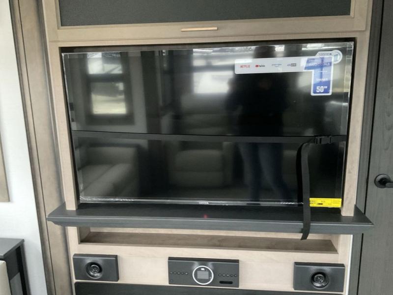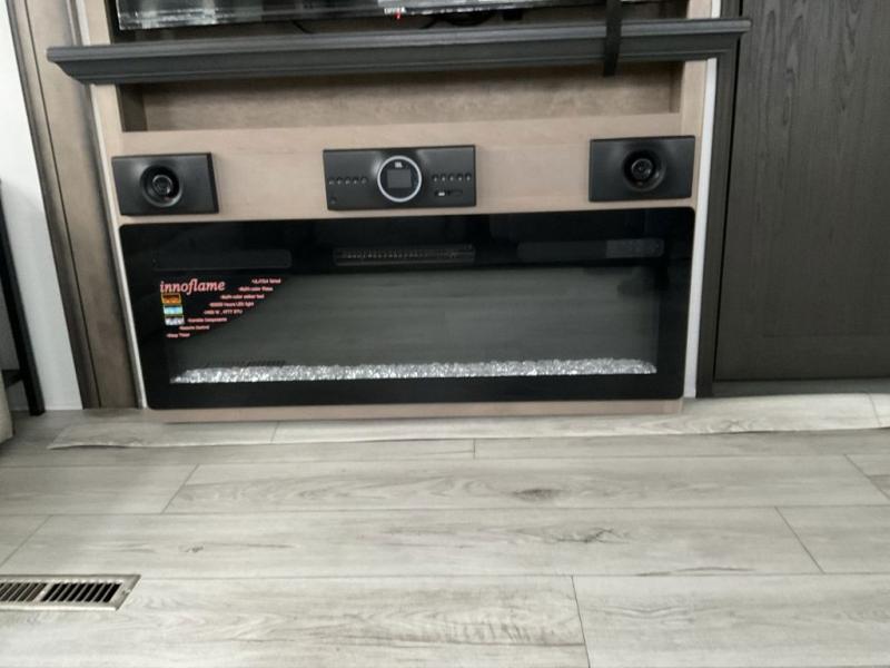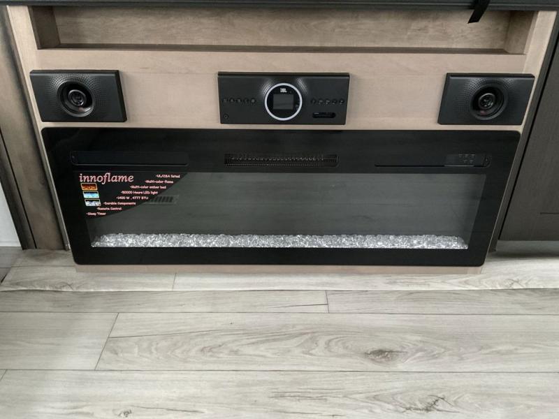 This fifth wheel has everything you need! The front private bedroom has a king bed slide across from a Smart HDTV with a dresser below it, plus a large front closet with a clothing hamper and stackable washer and dryer prep. Freshen up each morning in the full bathroom with the 48" x 30" fiberglass shower with a seat and skylight above for more natural lighting as you get ready. The kitchen has everything you need to prepare your best meals including extra countertop space on the kitchen island. Enjoy your meals at the dinette with storage and then relax on the rear hide-a-bed sofa or the power theater seating across from the entertainment center with a 5,000 BTU decorative fireplace heater and 50" Smart HDTV to watch your favorite movies!