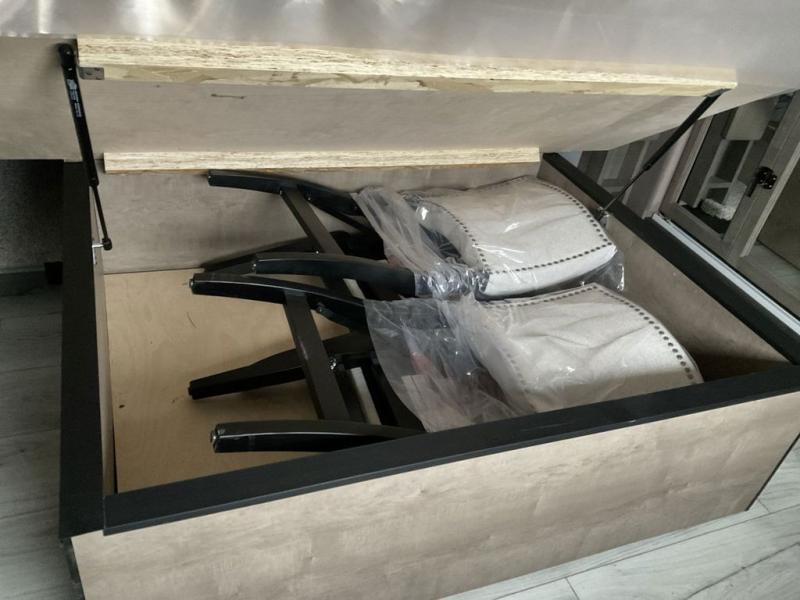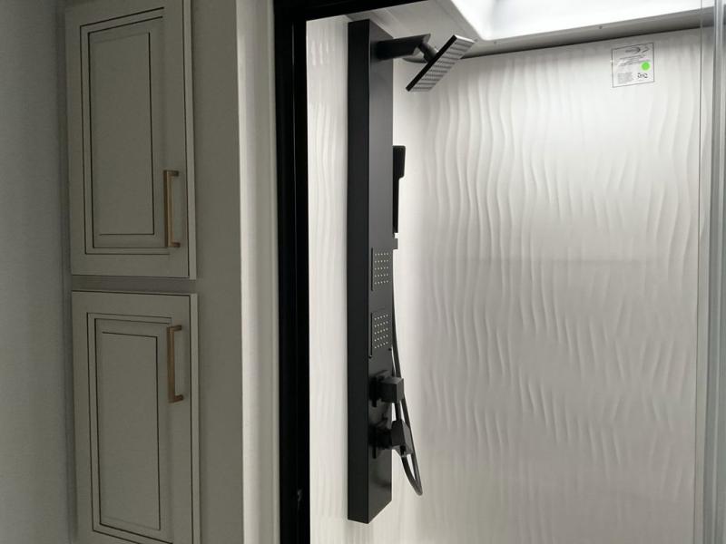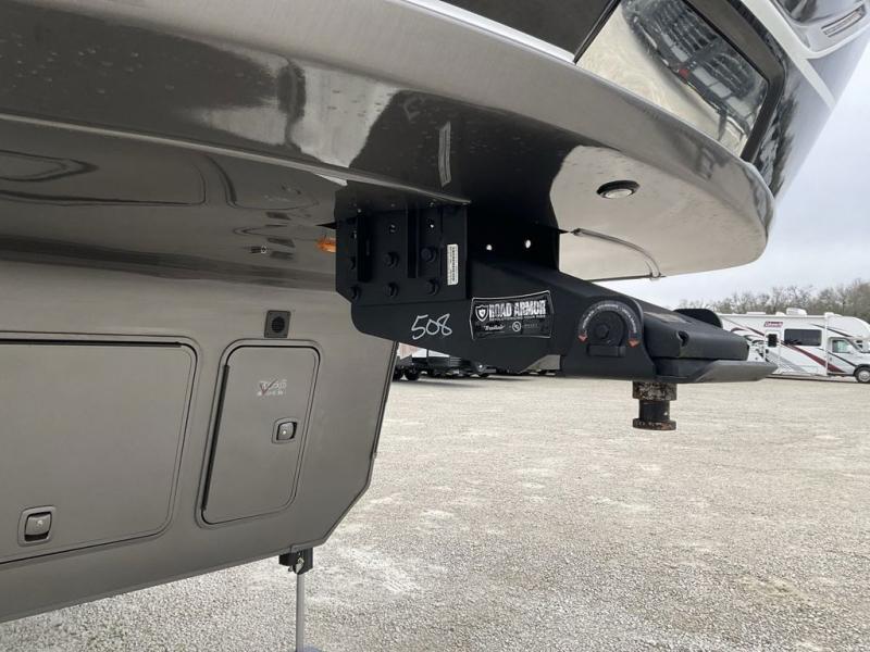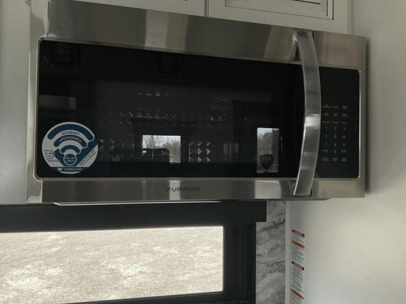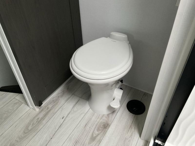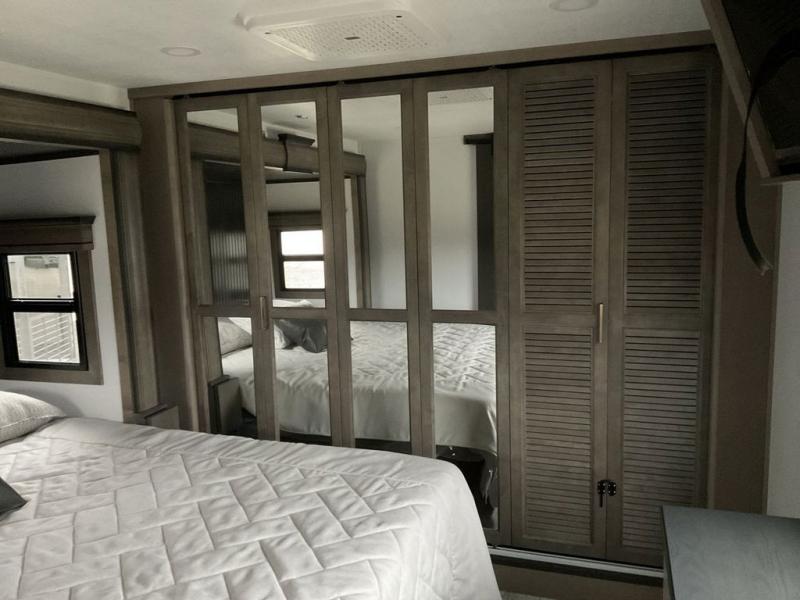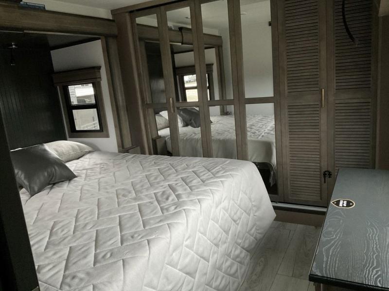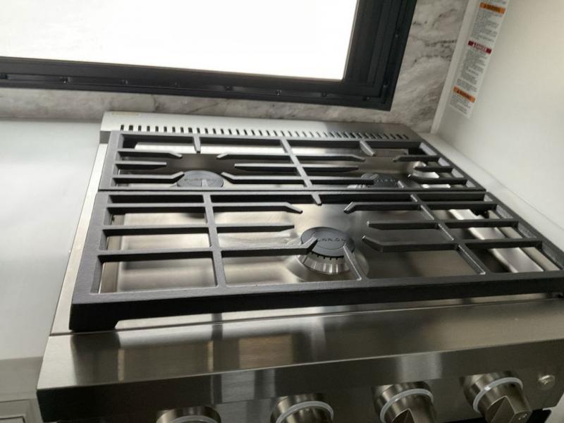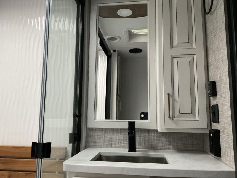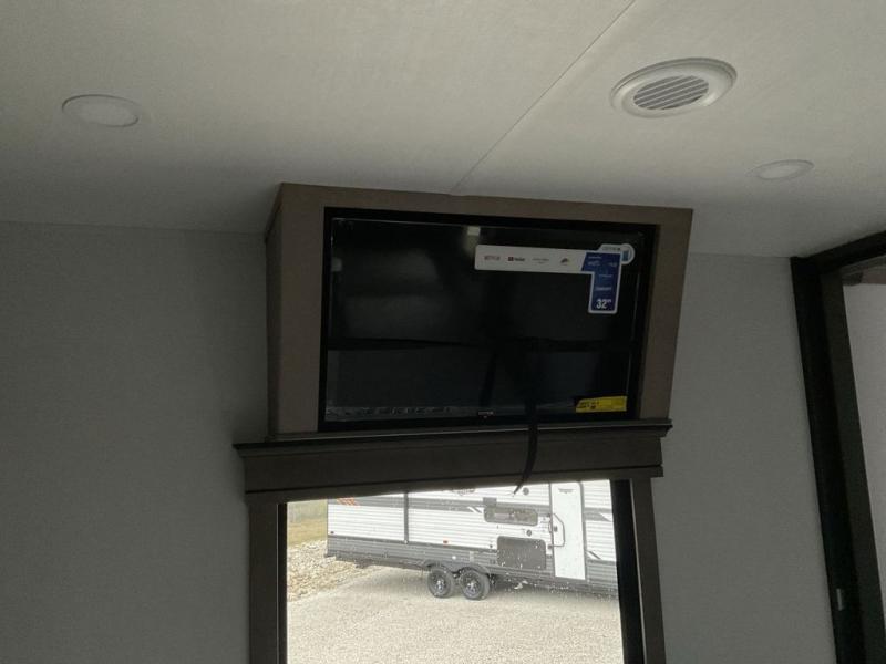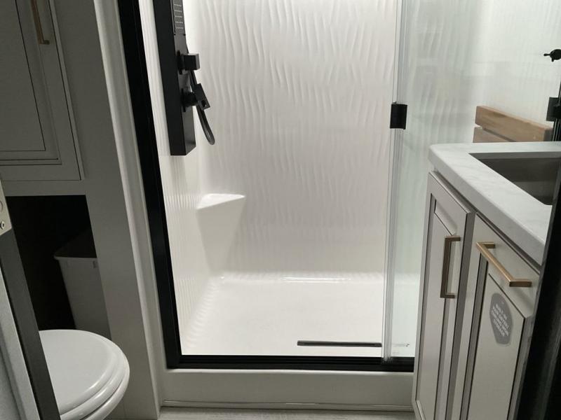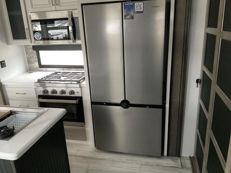This fifth wheel has everything you need! The front private bedroom has a king bed slide across from a Smart HDTV with a dresser below it, plus a large front closet with a clothing hamper and stackable washer and dryer prep. Freshen up each morning in the full bathroom with the 48" x 30" fiberglass shower with a seat and skylight above for more natural lighting as you get ready. The kitchen has everything you need to prepare your best meals including extra countertop space on the kitchen island. Enjoy your meals at the dinette with storage and then relax on the rear hide-a-bed sofa or the power theater seating across from the entertainment center with a 5,000 BTU decorative fireplace heater and 50" Smart HDTV to watch your favorite movies!