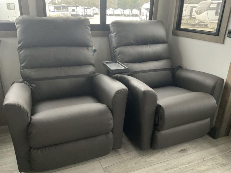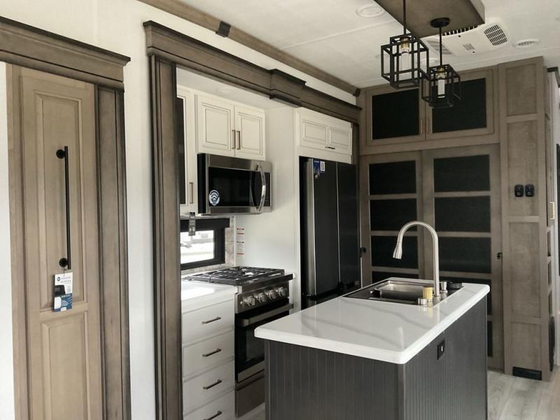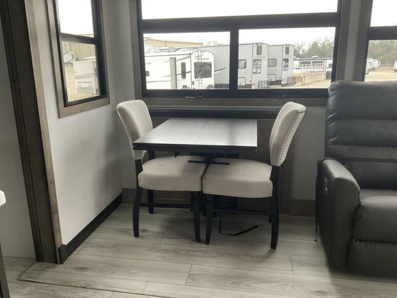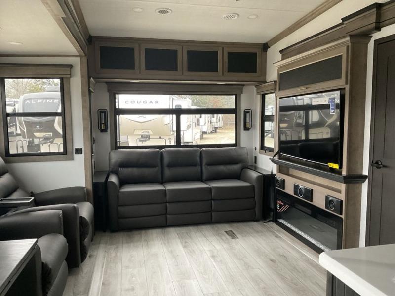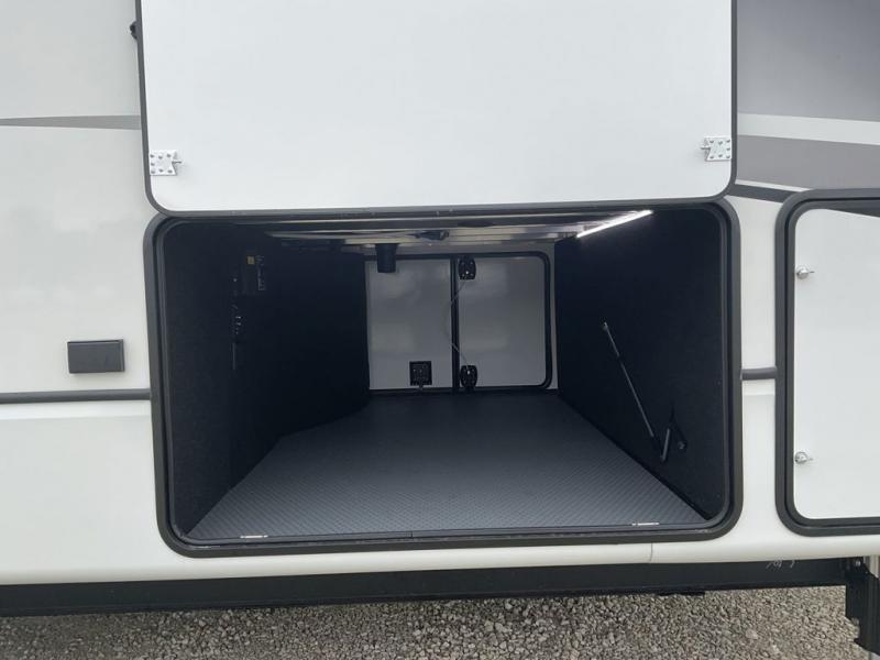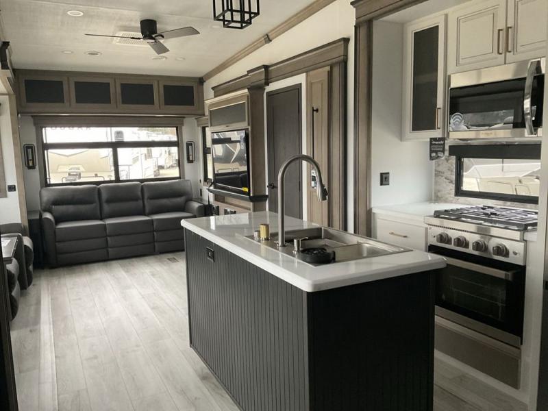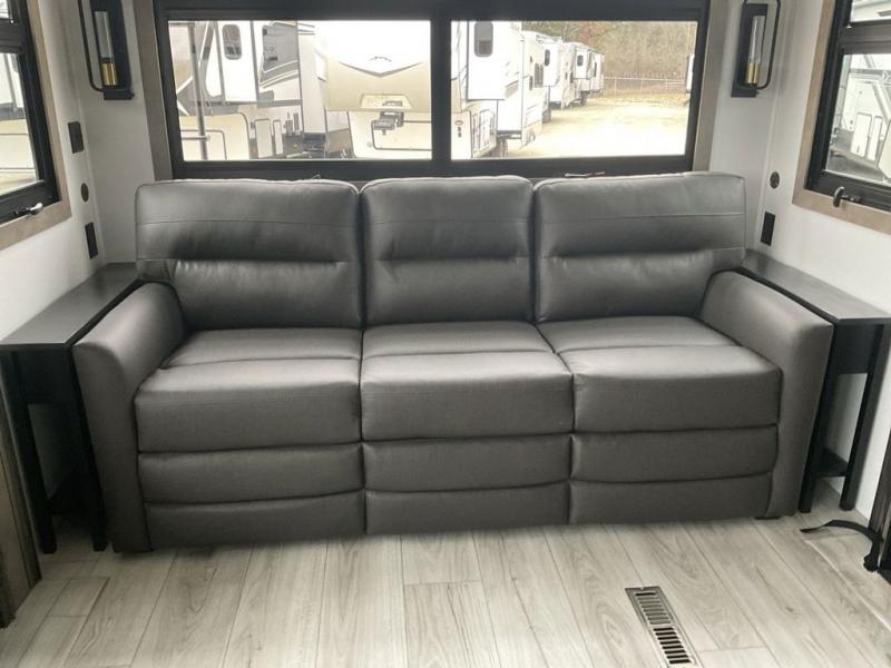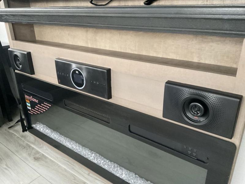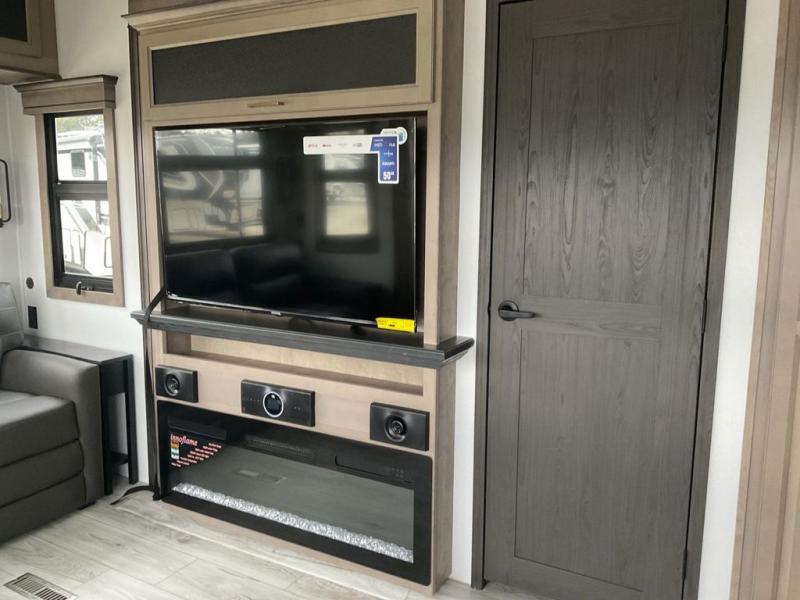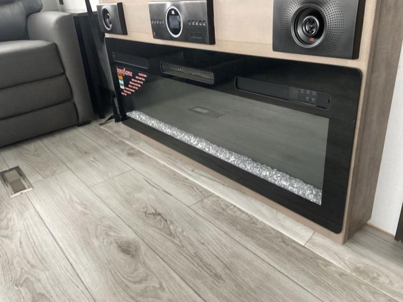 This fifth wheel has everything you need! The front private bedroom has a king bed slide across from a Smart HDTV with a dresser below it, plus a large front closet with a clothing hamper and stackable washer and dryer prep. Freshen up each morning in the full bathroom with the 48" x 30" fiberglass shower with a seat and skylight above for more natural lighting as you get ready. The kitchen has everything you need to prepare your best meals including extra countertop space on the kitchen island. Enjoy your meals at the dinette with storage and then relax on the rear hide-a-bed sofa or the power theater seating across from the entertainment center with a 5,000 BTU decorative fireplace heater and 50" Smart HDTV to watch your favorite movies!