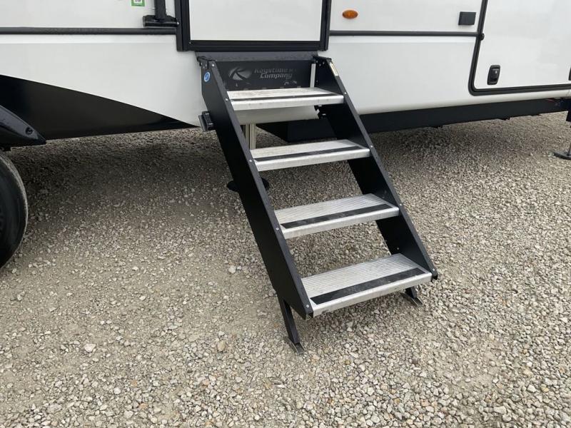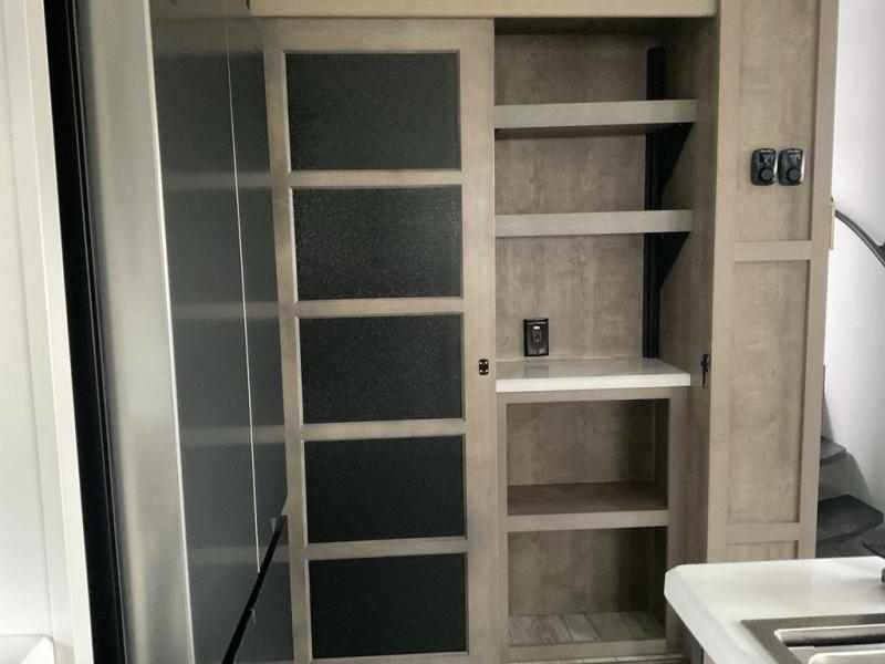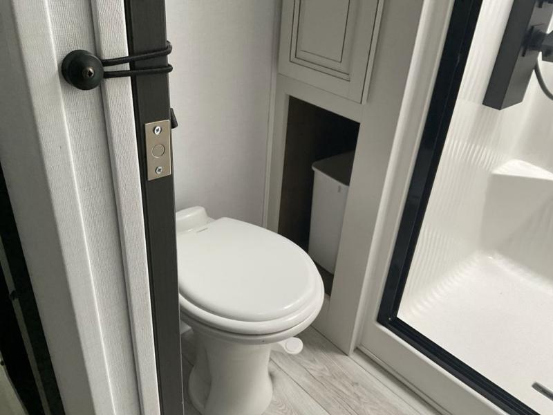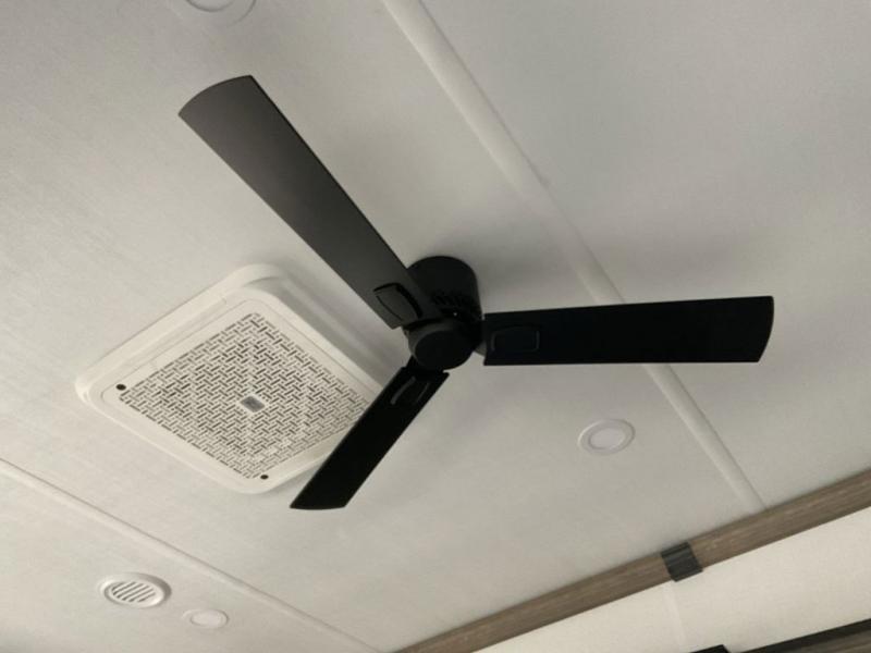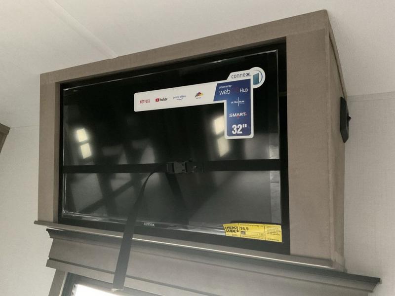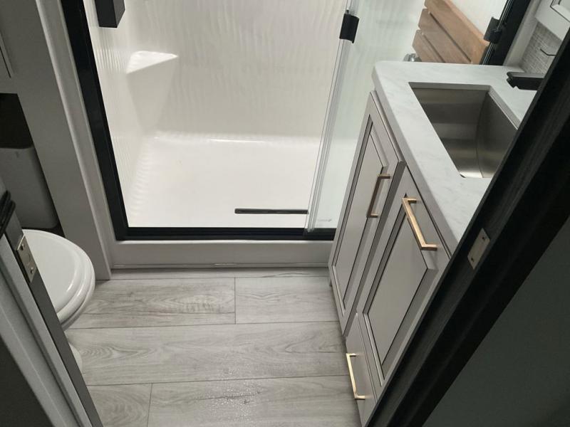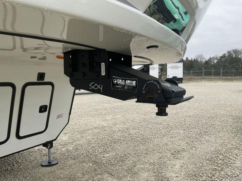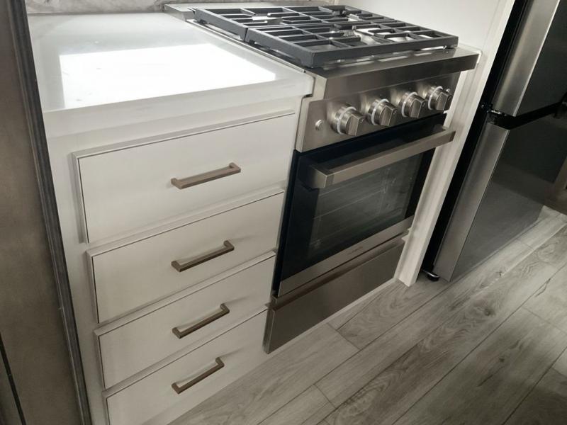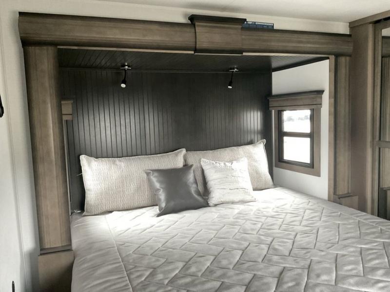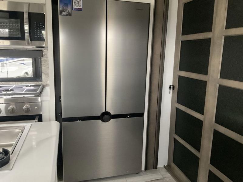 This fifth wheel has everything you need! The front private bedroom has a king bed slide across from a Smart HDTV with a dresser below it, plus a large front closet with a clothing hamper and stackable washer and dryer prep. Freshen up each morning in the full bathroom with the 48" x 30" fiberglass shower with a seat and skylight above for more natural lighting as you get ready. The kitchen has everything you need to prepare your best meals including extra countertop space on the kitchen island. Enjoy your meals at the dinette with storage and then relax on the rear hide-a-bed sofa or the power theater seating across from the entertainment center with a 5,000 BTU decorative fireplace heater and 50" Smart HDTV to watch your favorite movies!