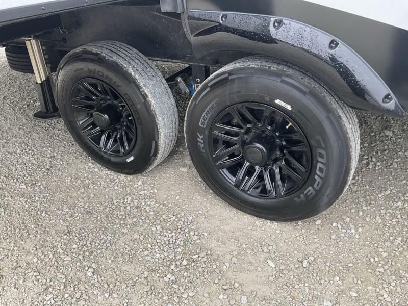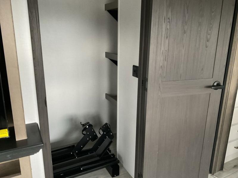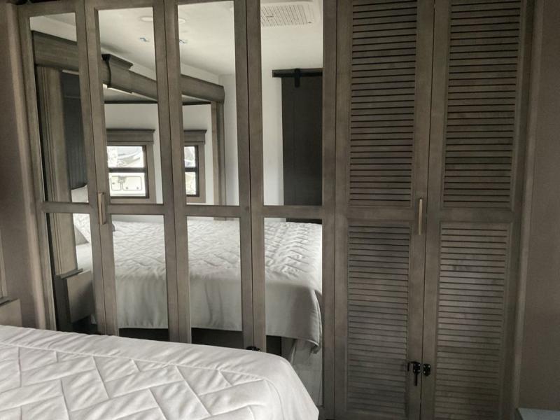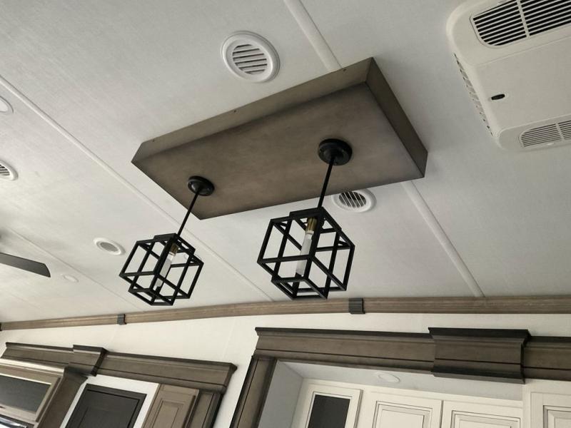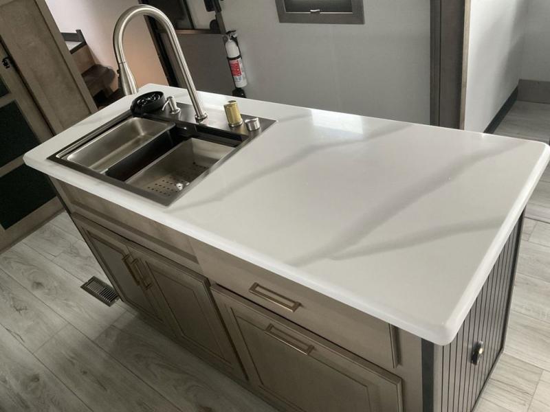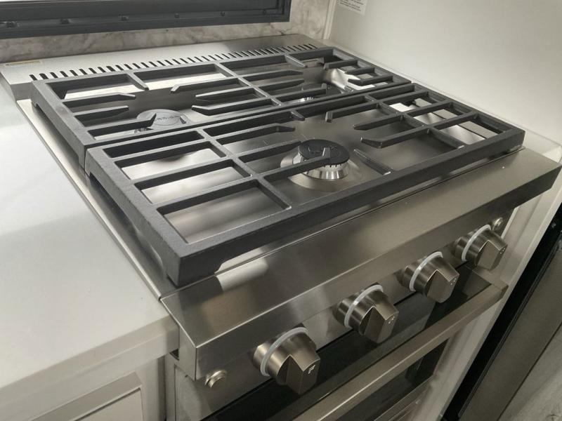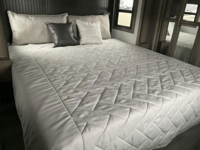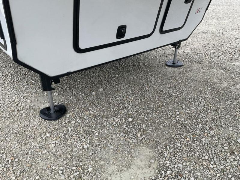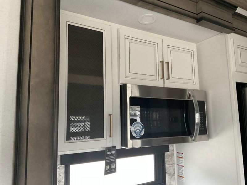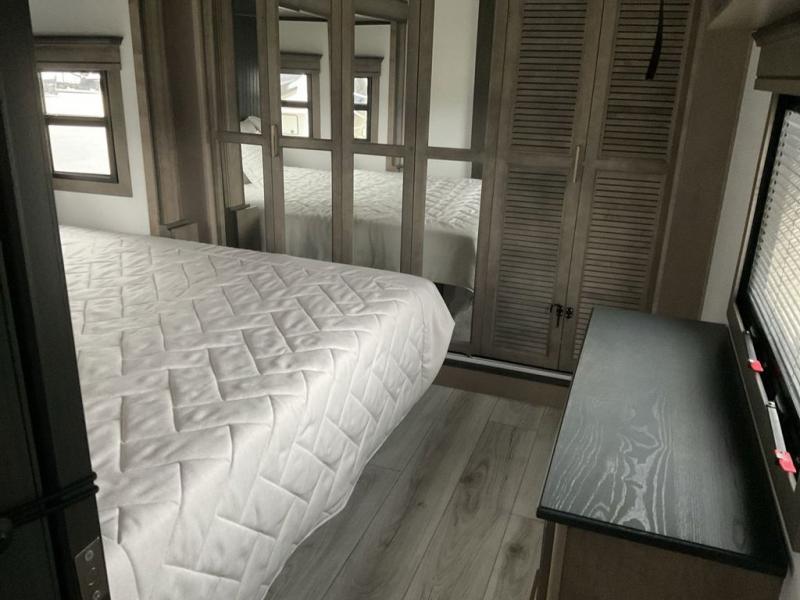This fifth wheel has everything you need! The front private bedroom has a king bed slide across from a Smart HDTV with a dresser below it, plus a large front closet with a clothing hamper and stackable washer and dryer prep. Freshen up each morning in the full bathroom with the 48" x 30" fiberglass shower with a seat and skylight above for more natural lighting as you get ready. The kitchen has everything you need to prepare your best meals including extra countertop space on the kitchen island. Enjoy your meals at the dinette with storage and then relax on the rear hide-a-bed sofa or the power theater seating across from the entertainment center with a 5,000 BTU decorative fireplace heater and 50" Smart HDTV to watch your favorite movies!