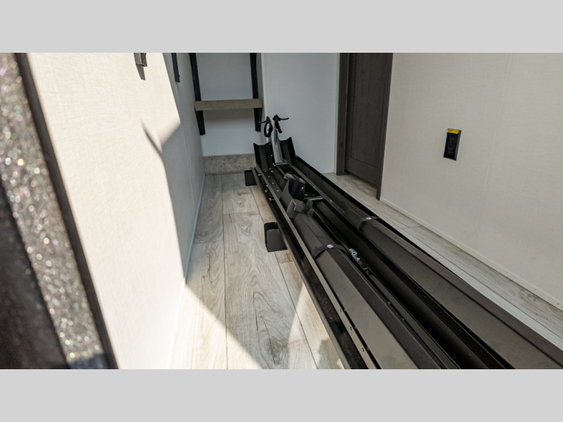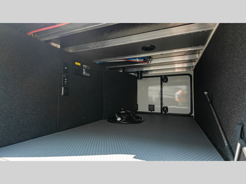 This floor plan features a front master suite, spacious rear lounge, and built-in bike garage—ideal for active campers, hobbyists, or explorers.