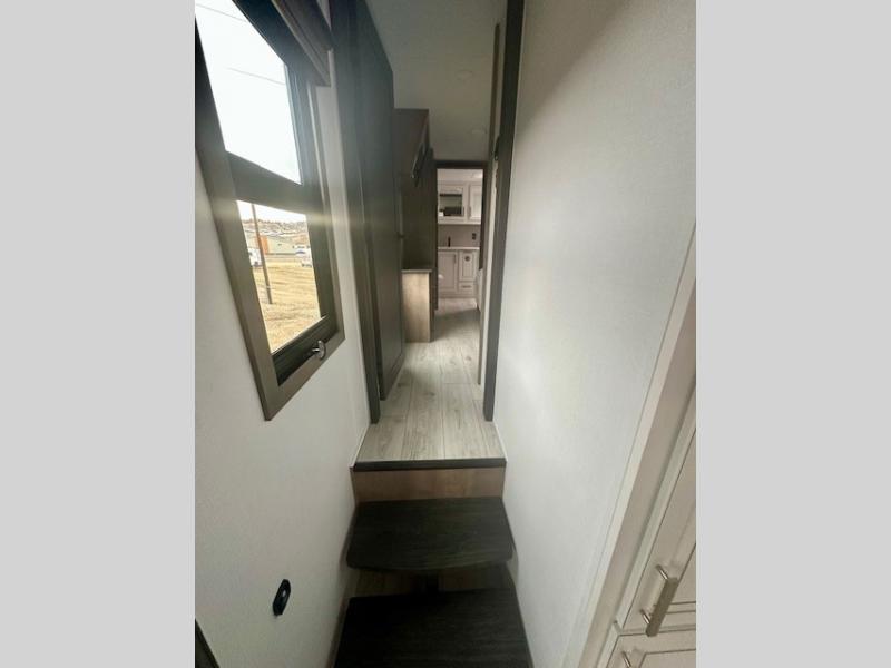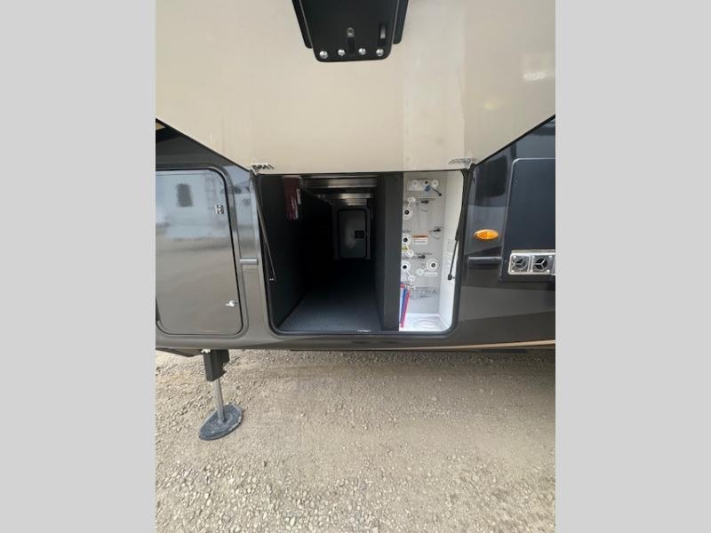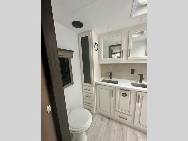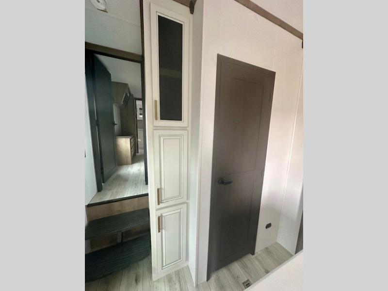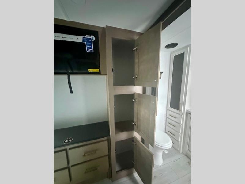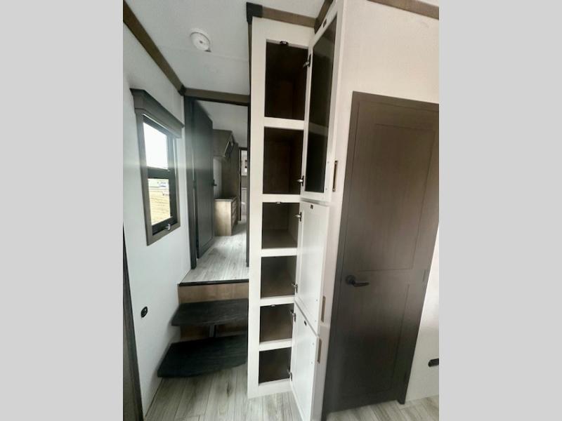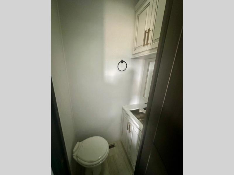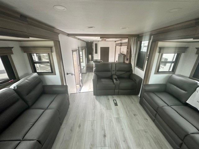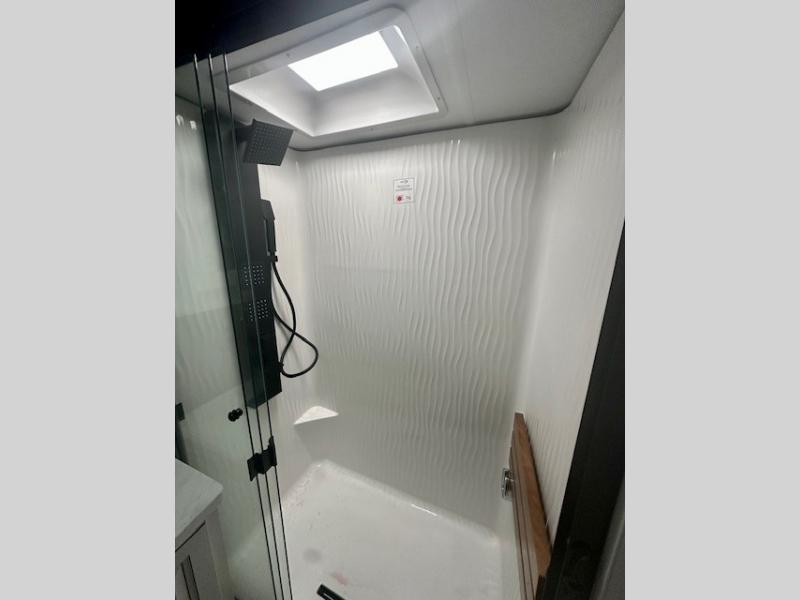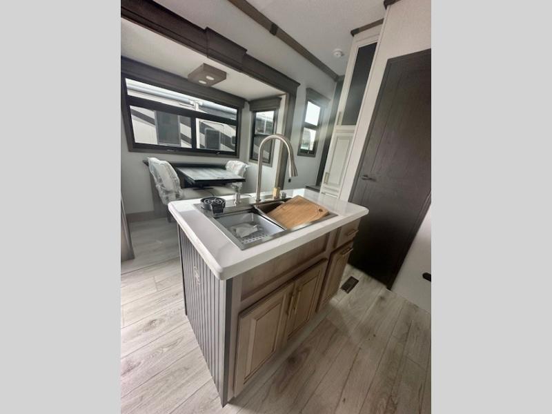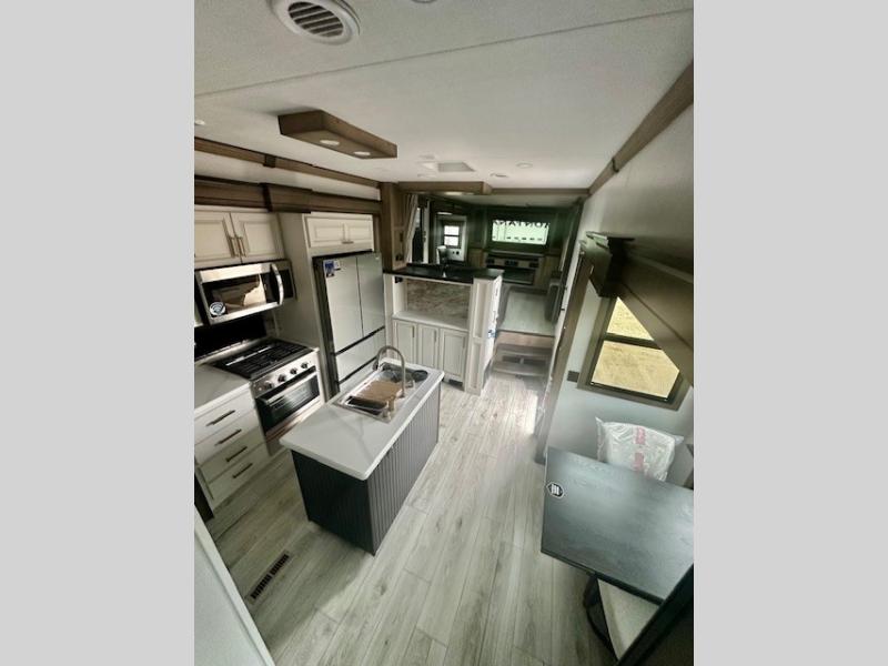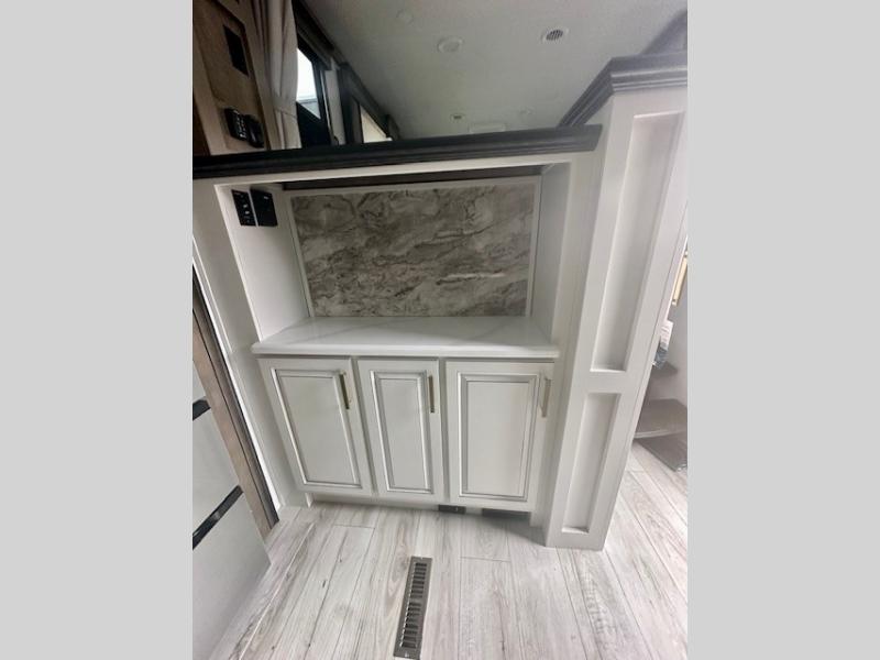Life will be easier at the campground in this fifth wheel with a bath and a half! The full rear bathroom has a 48" x 30" fiberglass shower with a seat and skylight above, a linen closet to keep your towels close, a dual sink vanity for two to get ready at once, and a barn door to close off the master suite. The bedroom also has a king bed slide with storage underneath across from a dresser with a 32" Smart TV and wardrobe, as well as a large closet with stackable washer and dryer prep. The chef can prepare their best meals with the kitchen island, convection microwave and 24" range, plus there is a pantry/buffet and a free standing legless dinette to enjoy your meals at. The front living area will have you feeling right at home with the front entertainment center that has a telescoping 50" Smart TV, a 5,000 BTU decorative fireplace heater, and storage on either side. There is also opposing hide-a-bed sofa slides for extra sleeping spaces and power theater seating for even more comfort!