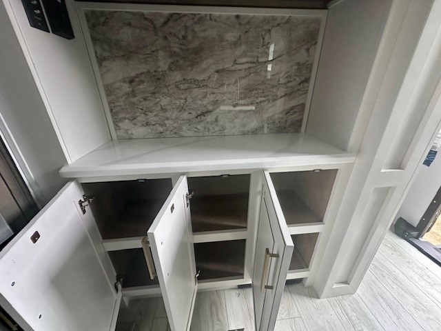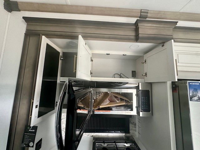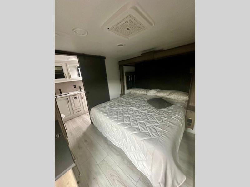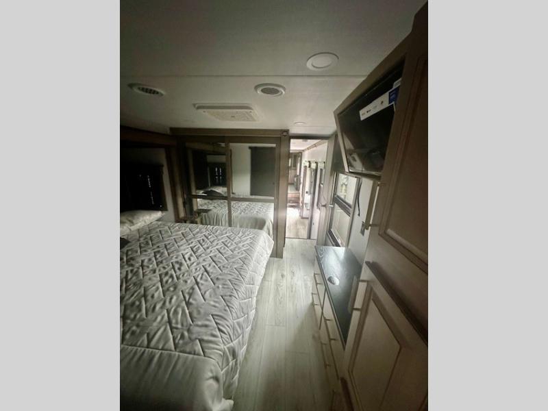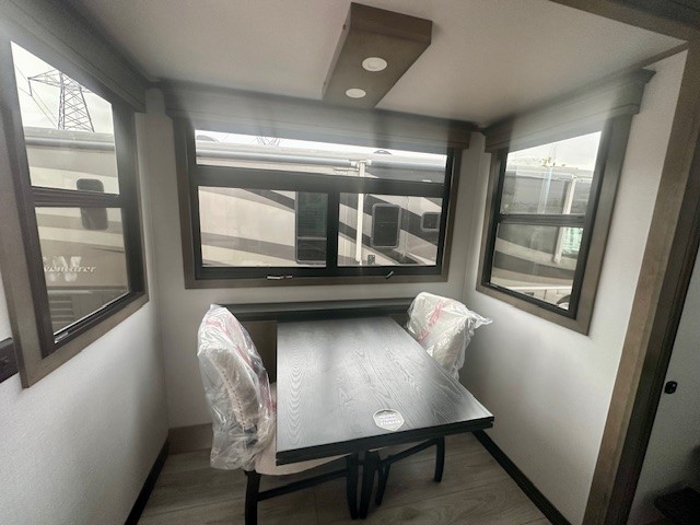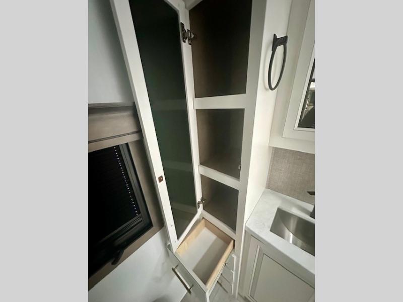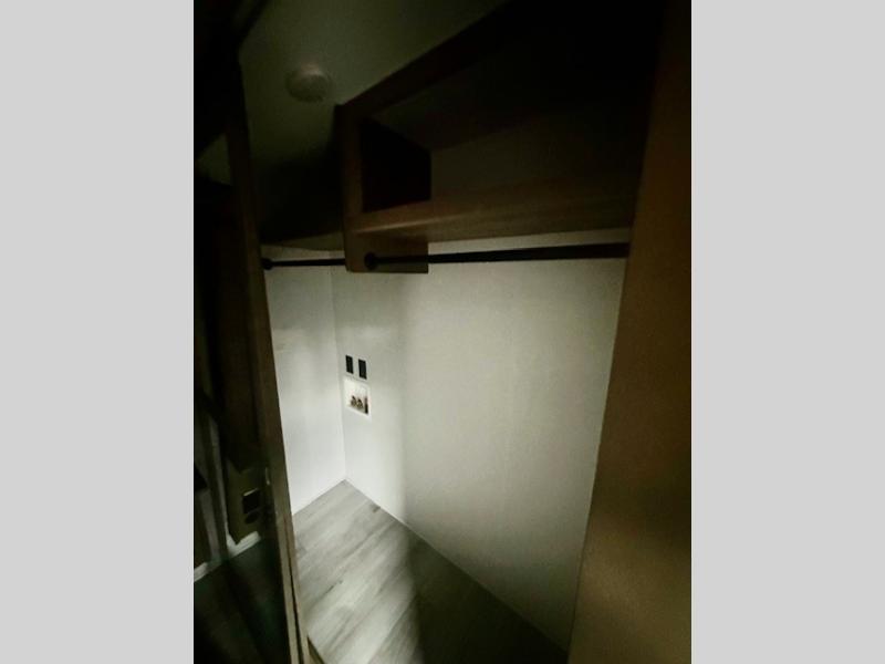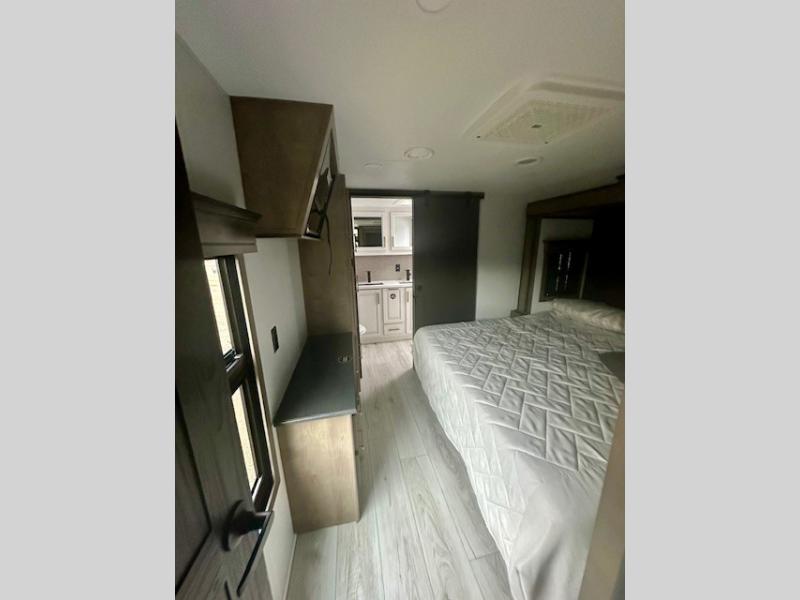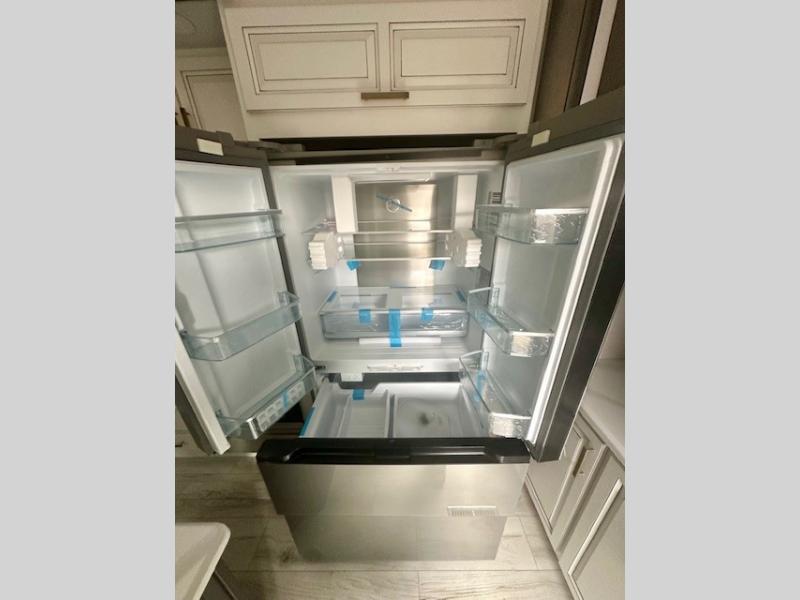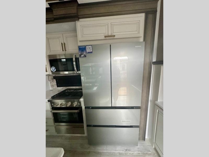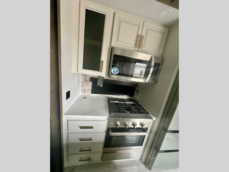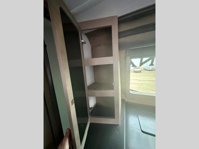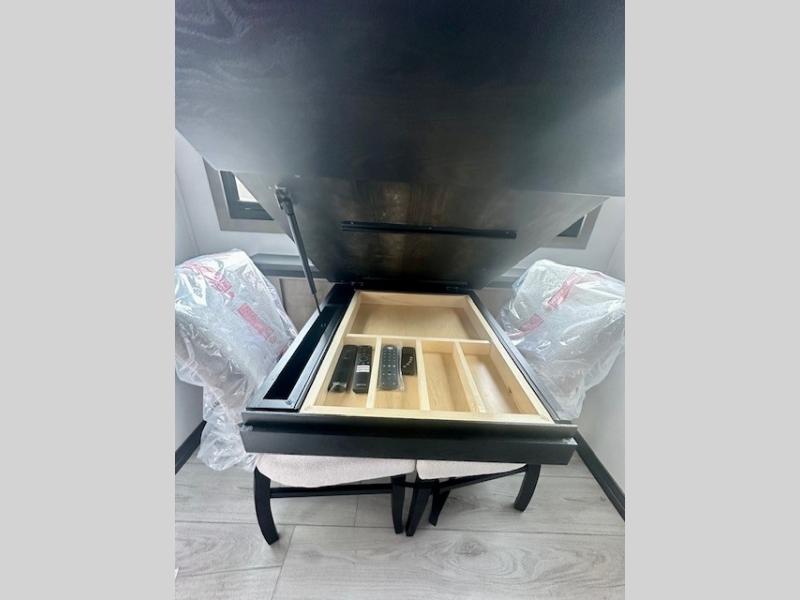 Life will be easier at the campground in this fifth wheel with a bath and a half! The full rear bathroom has a 48" x 30" fiberglass shower with a seat and skylight above, a linen closet to keep your towels close, a dual sink vanity for two to get ready at once, and a barn door to close off the master suite. The bedroom also has a king bed slide with storage underneath across from a dresser with a 32" Smart TV and wardrobe, as well as a large closet with stackable washer and dryer prep. The chef can prepare their best meals with the kitchen island, convection microwave and 24" range, plus there is a pantry/buffet and a free standing legless dinette to enjoy your meals at. The front living area will have you feeling right at home with the front entertainment center that has a telescoping 50" Smart TV, a 5,000 BTU decorative fireplace heater, and storage on either side. There is also opposing hide-a-bed sofa slides for extra sleeping spaces and power theater seating for even more comfort!