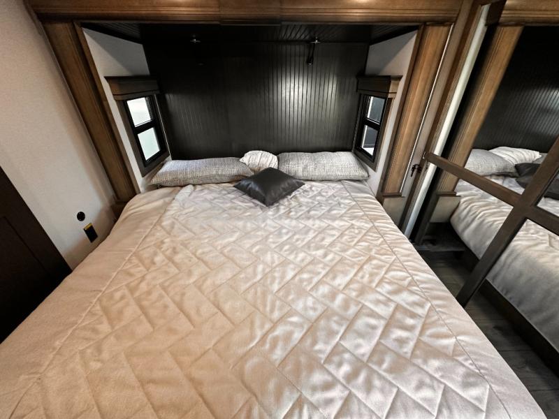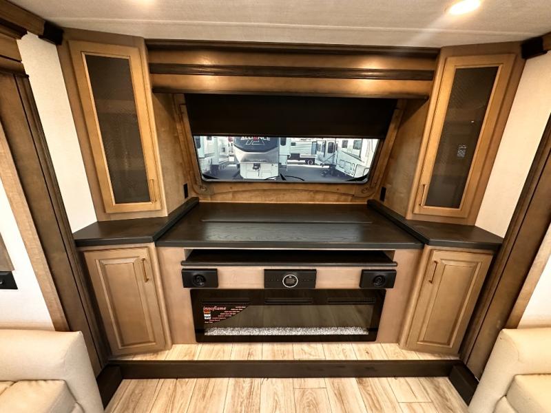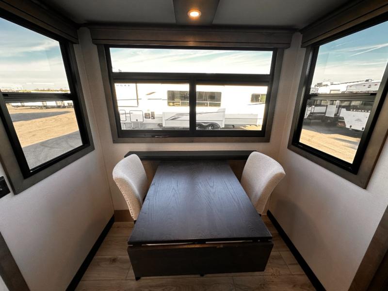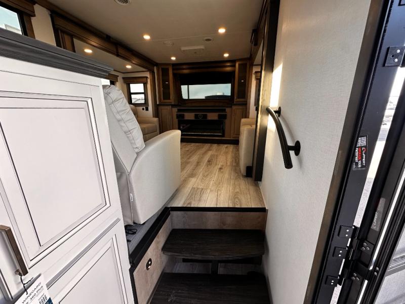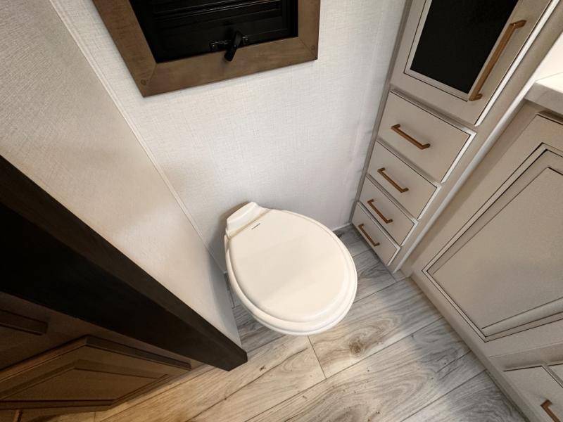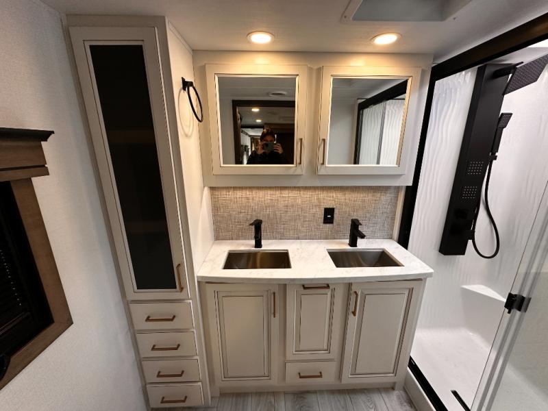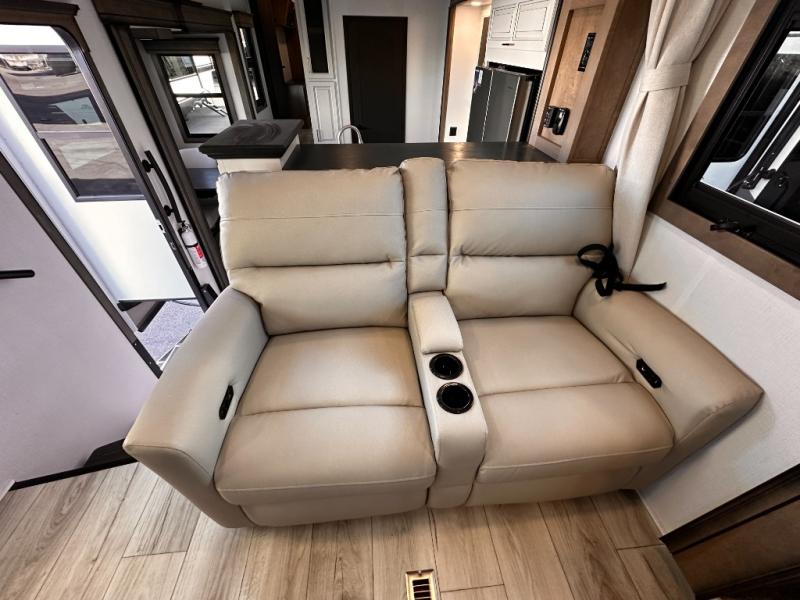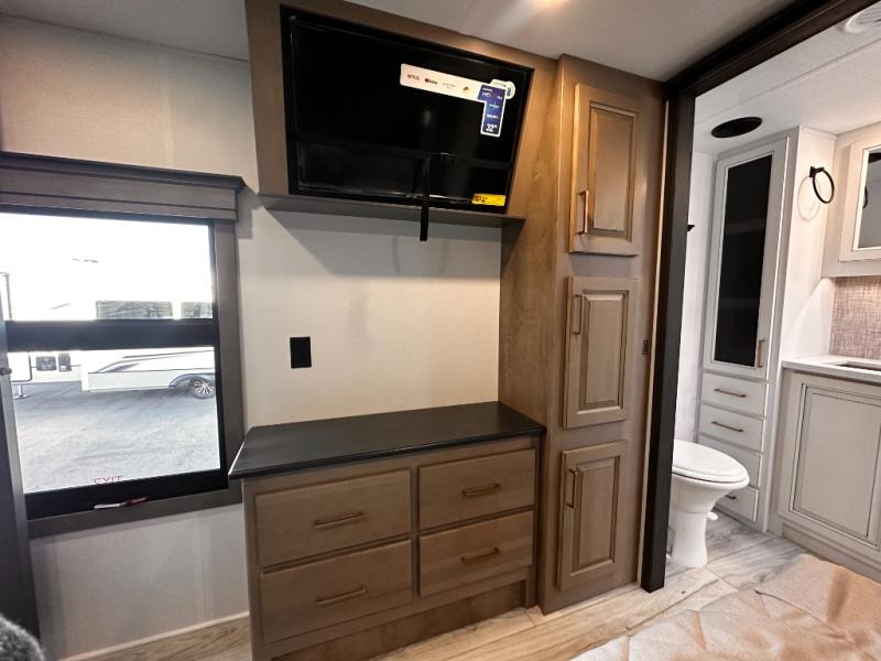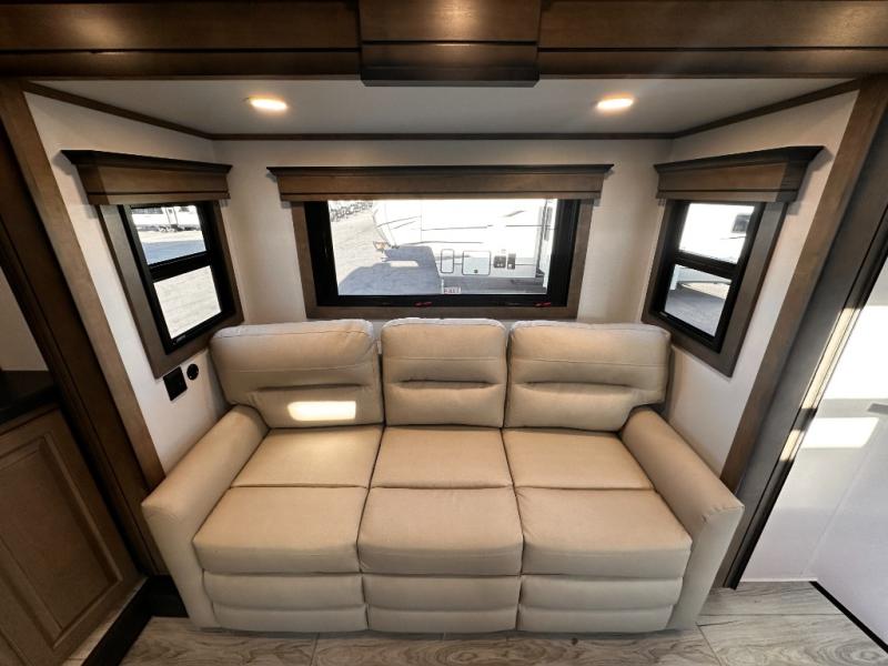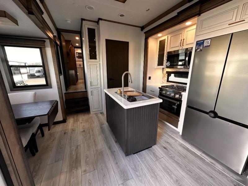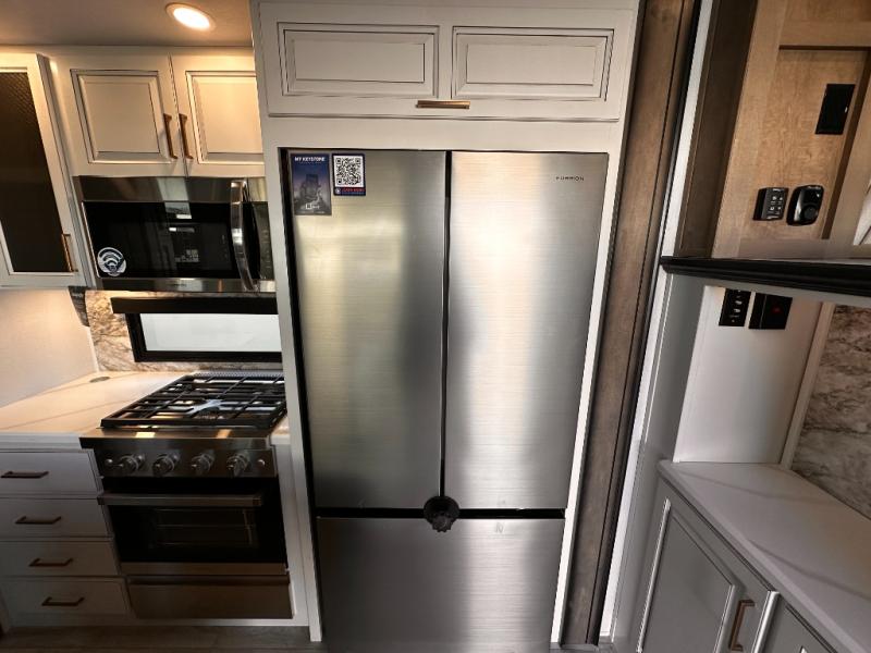 Life will be easier at the campground in this fifth wheel with a bath and a half! The full rear bathroom has a 48" x 30" fiberglass shower with a seat and skylight above, a linen closet to keep your towels close, a dual sink vanity for two to get ready at once, and a barn door to close off the master suite. The bedroom also has a king bed slide with storage underneath across from a dresser with a 32" Smart TV and wardrobe, as well as a large closet with stackable washer and dryer prep. The chef can prepare their best meals with the kitchen island, convection microwave and 24" range, plus there is a pantry/buffet and a free standing legless dinette to enjoy your meals at. The front living area will have you feeling right at home with the front entertainment center that has a telescoping 50" Smart TV, a 5,000 BTU decorative fireplace heater, and storage on either side. There is also opposing hide-a-bed sofa slides for extra sleeping spaces and power theater seating for even more comfort!