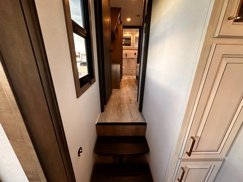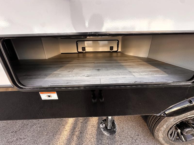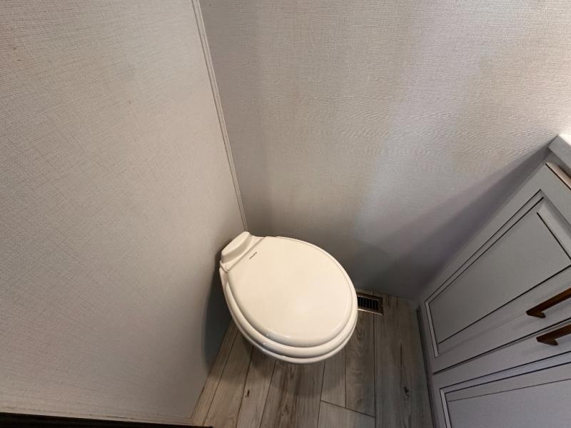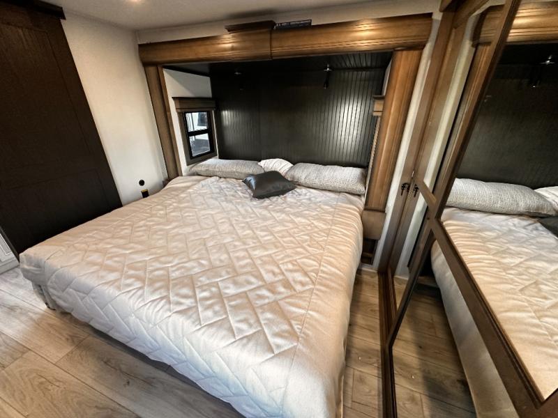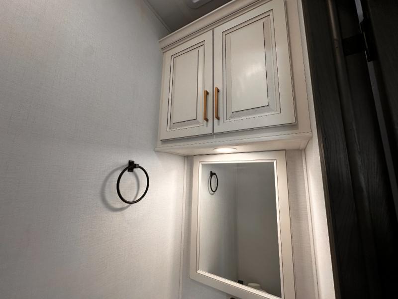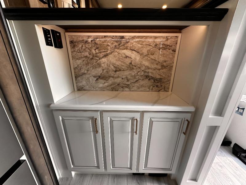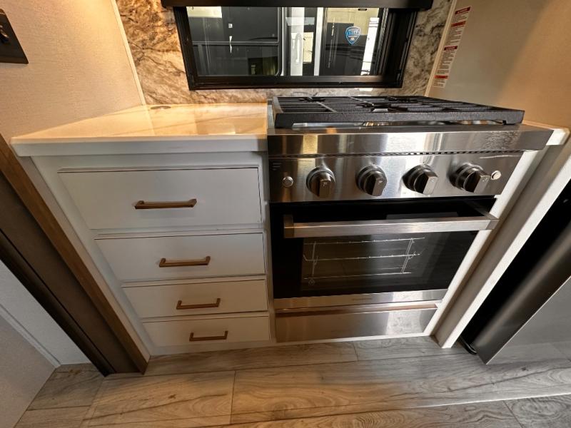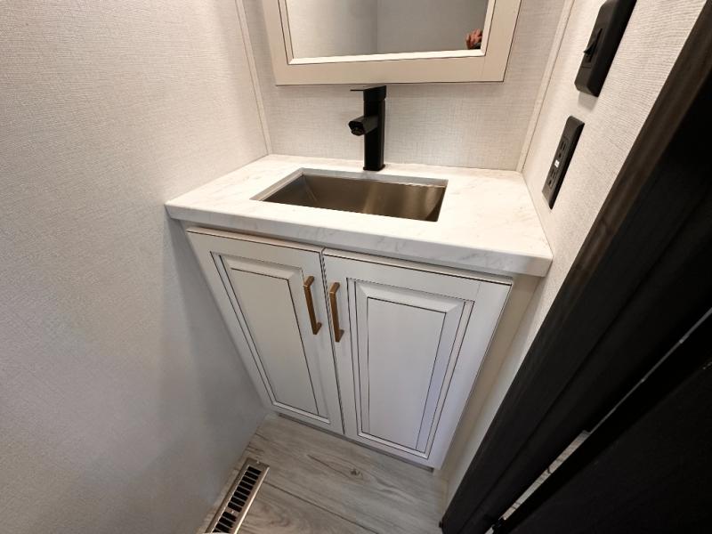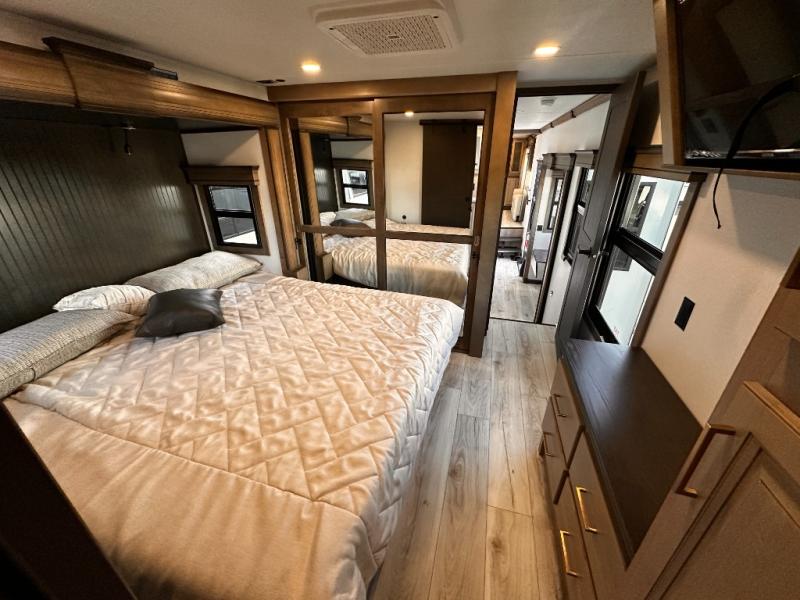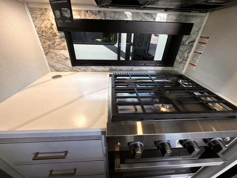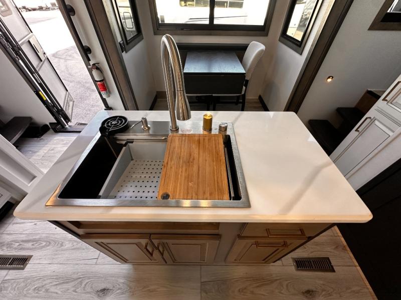 Life will be easier at the campground in this fifth wheel with a bath and a half! The full rear bathroom has a 48" x 30" fiberglass shower with a seat and skylight above, a linen closet to keep your towels close, a dual sink vanity for two to get ready at once, and a barn door to close off the master suite. The bedroom also has a king bed slide with storage underneath across from a dresser with a 32" Smart TV and wardrobe, as well as a large closet with stackable washer and dryer prep. The chef can prepare their best meals with the kitchen island, convection microwave and 24" range, plus there is a pantry/buffet and a free standing legless dinette to enjoy your meals at. The front living area will have you feeling right at home with the front entertainment center that has a telescoping 50" Smart TV, a 5,000 BTU decorative fireplace heater, and storage on either side. There is also opposing hide-a-bed sofa slides for extra sleeping spaces and power theater seating for even more comfort!