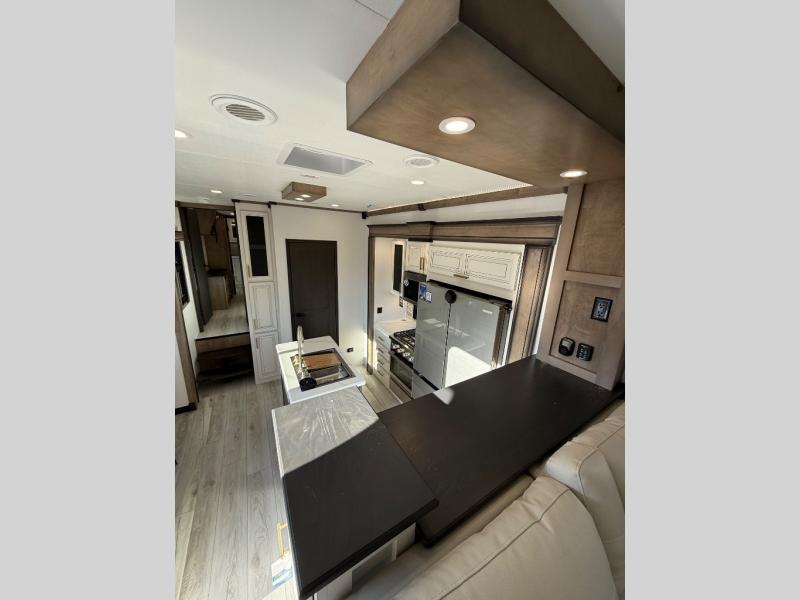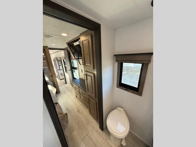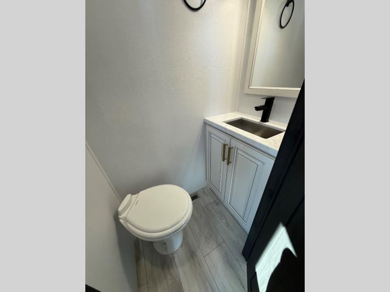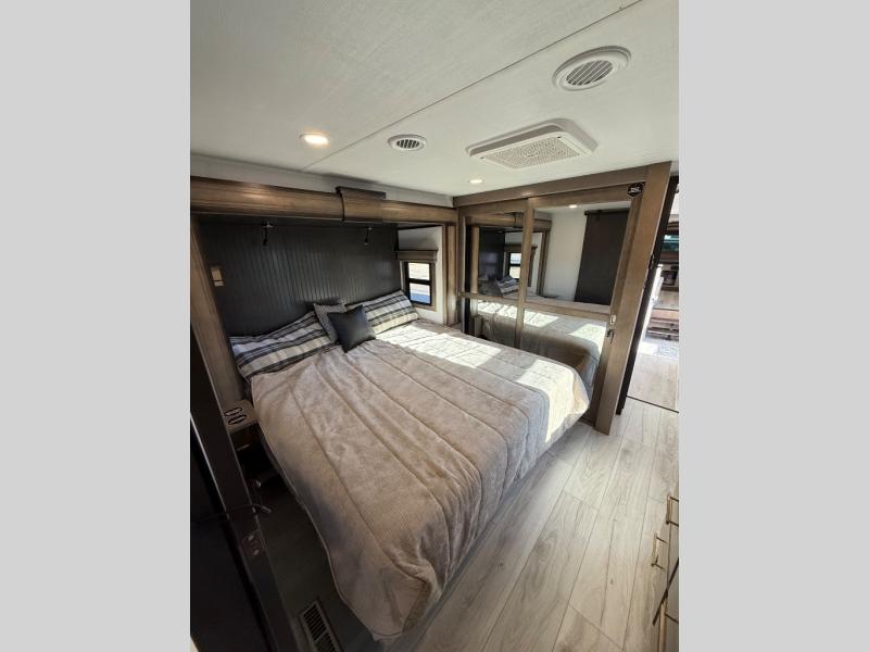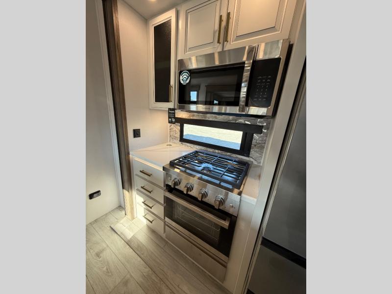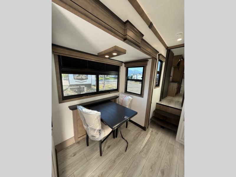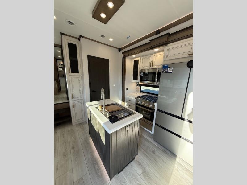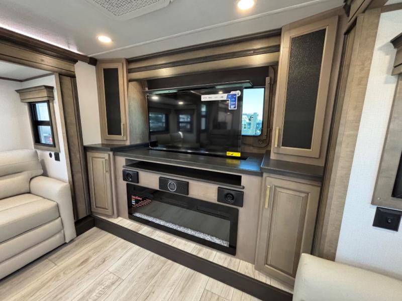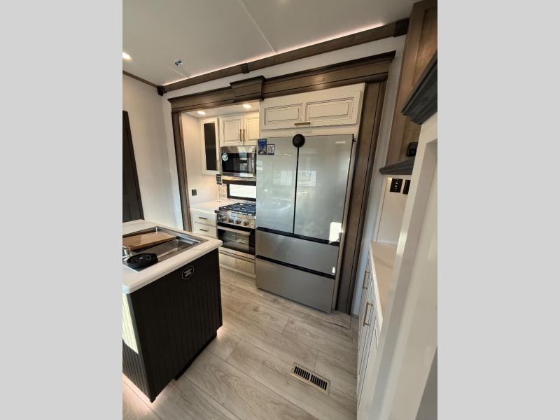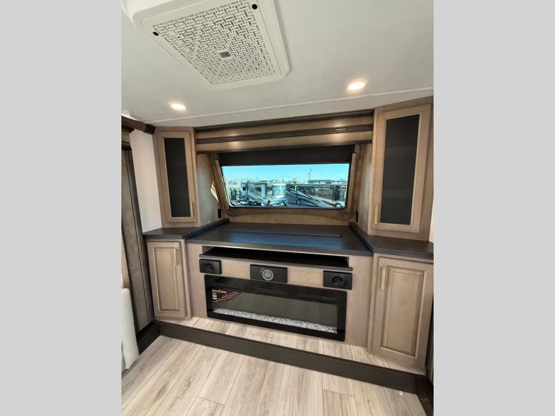 Life will be easier at the campground in this fifth wheel with a bath and a half! The full rear bathroom has a 48" x 30" fiberglass shower with a seat and skylight above, a linen closet to keep your towels close, a dual sink vanity for two to get ready at once, and a barn door to close off the master suite. The bedroom also has a king bed slide with storage underneath across from a dresser with a 32" Smart TV and wardrobe, as well as a large closet with stackable washer and dryer prep. The chef can prepare their best meals with the kitchen island, convection microwave and 24" range, plus there is a pantry/buffet and a free standing legless dinette to enjoy your meals at. The front living area will have you feeling right at home with the front entertainment center that has a telescoping 50" Smart TV, a 5,000 BTU decorative fireplace heater, and storage on either side. There is also opposing hide-a-bed sofa slides for extra sleeping spaces and power theater seating for even more comfort!