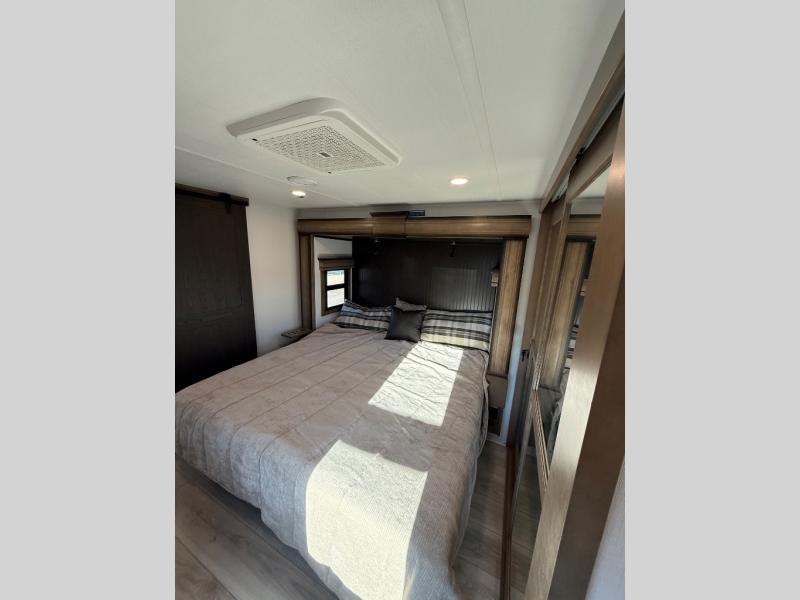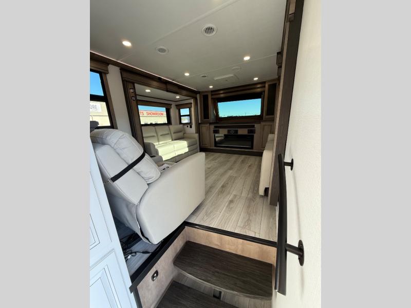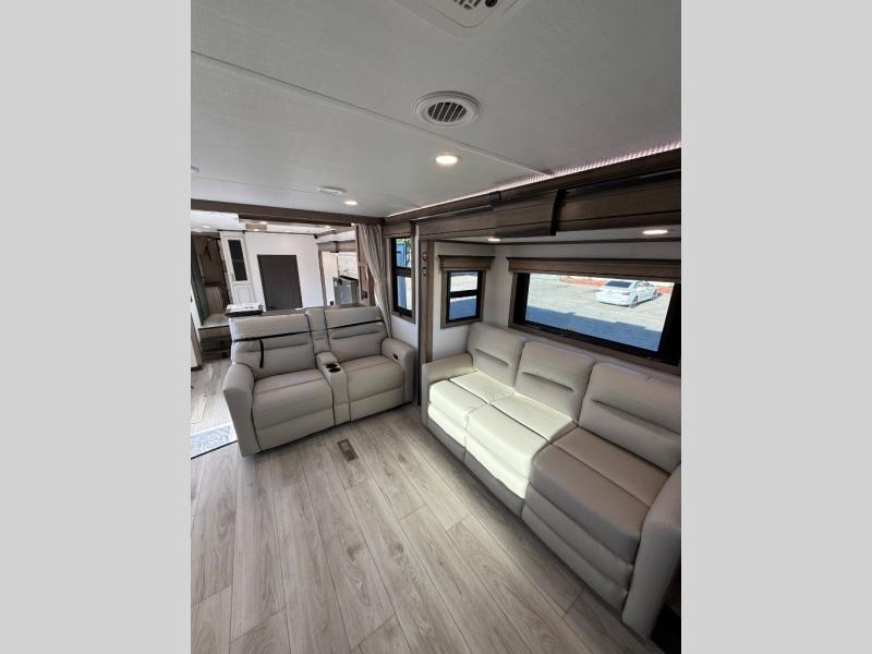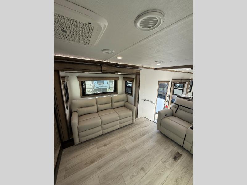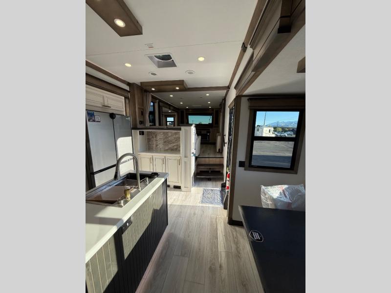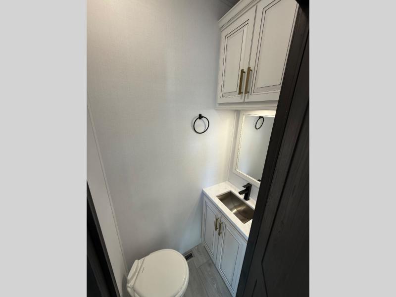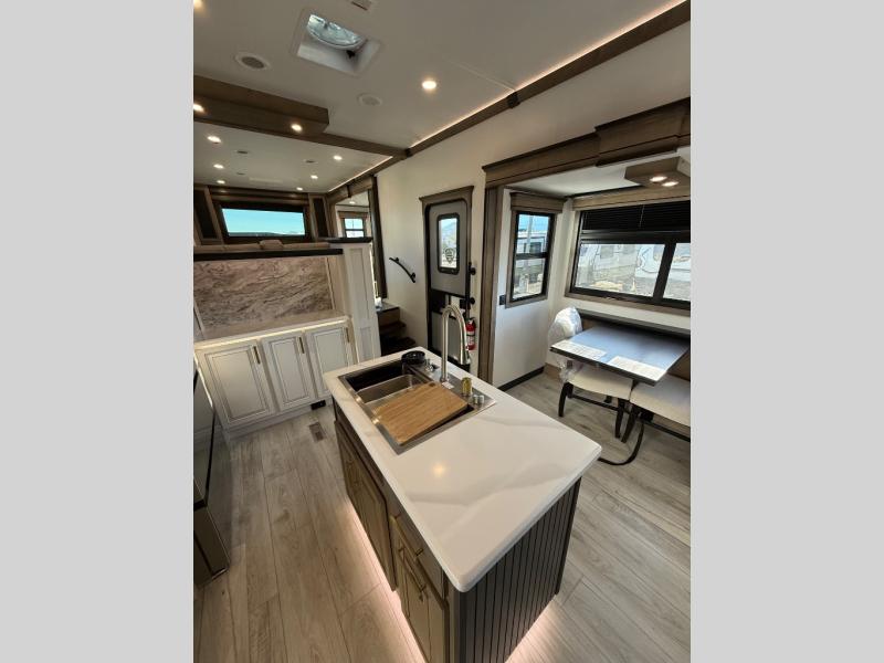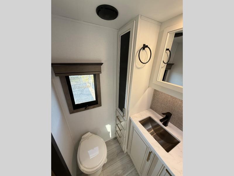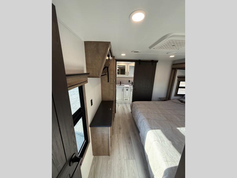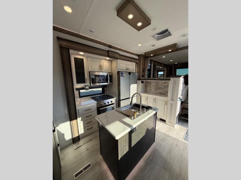 Life will be easier at the campground in this fifth wheel with a bath and a half! The full rear bathroom has a 48" x 30" fiberglass shower with a seat and skylight above, a linen closet to keep your towels close, a dual sink vanity for two to get ready at once, and a barn door to close off the master suite. The bedroom also has a king bed slide with storage underneath across from a dresser with a 32" Smart TV and wardrobe, as well as a large closet with stackable washer and dryer prep. The chef can prepare their best meals with the kitchen island, convection microwave and 24" range, plus there is a pantry/buffet and a free standing legless dinette to enjoy your meals at. The front living area will have you feeling right at home with the front entertainment center that has a telescoping 50" Smart TV, a 5,000 BTU decorative fireplace heater, and storage on either side. There is also opposing hide-a-bed sofa slides for extra sleeping spaces and power theater seating for even more comfort!