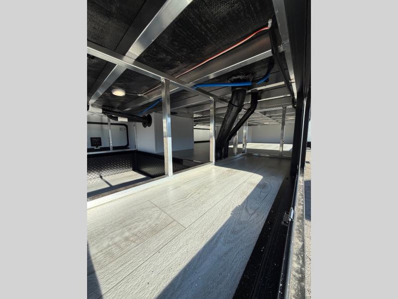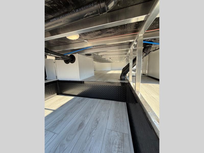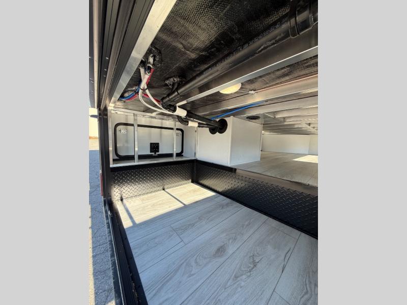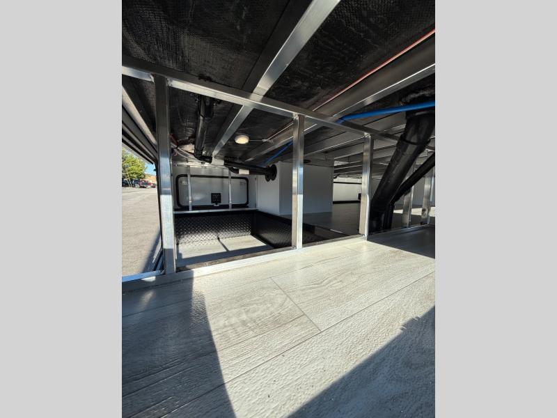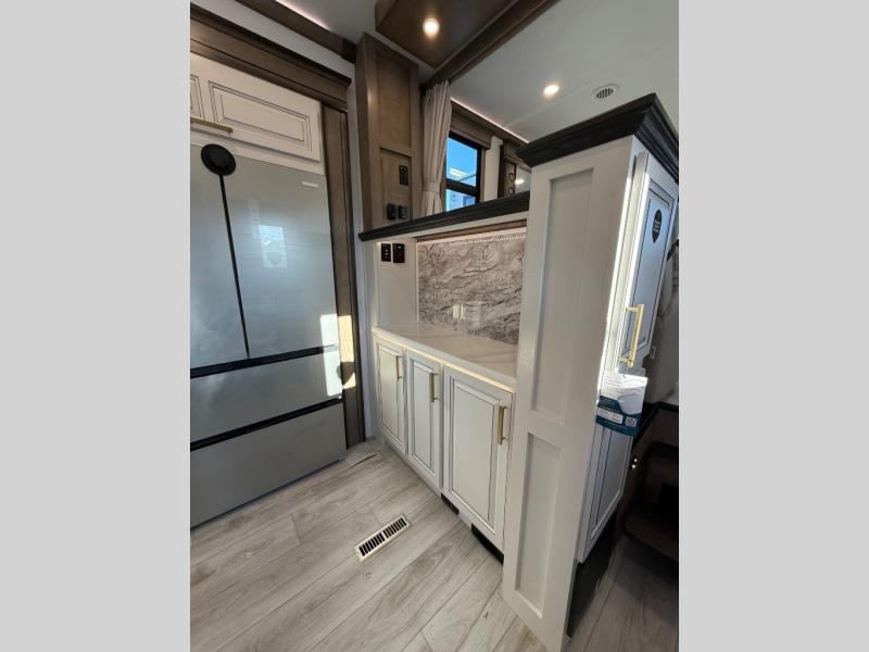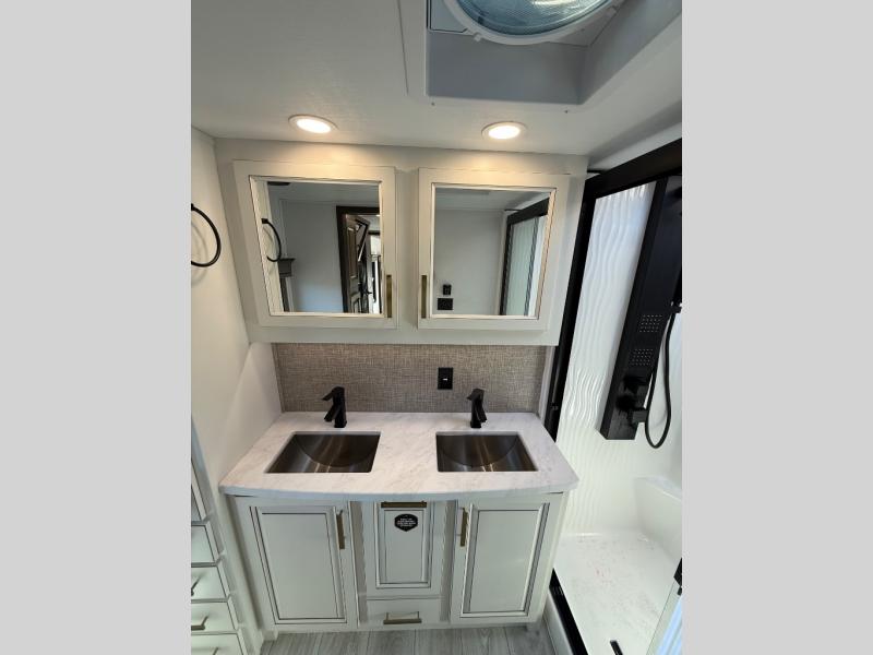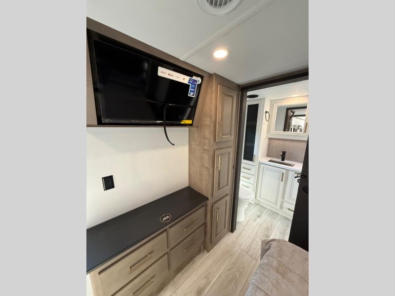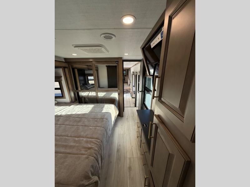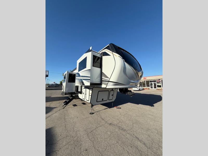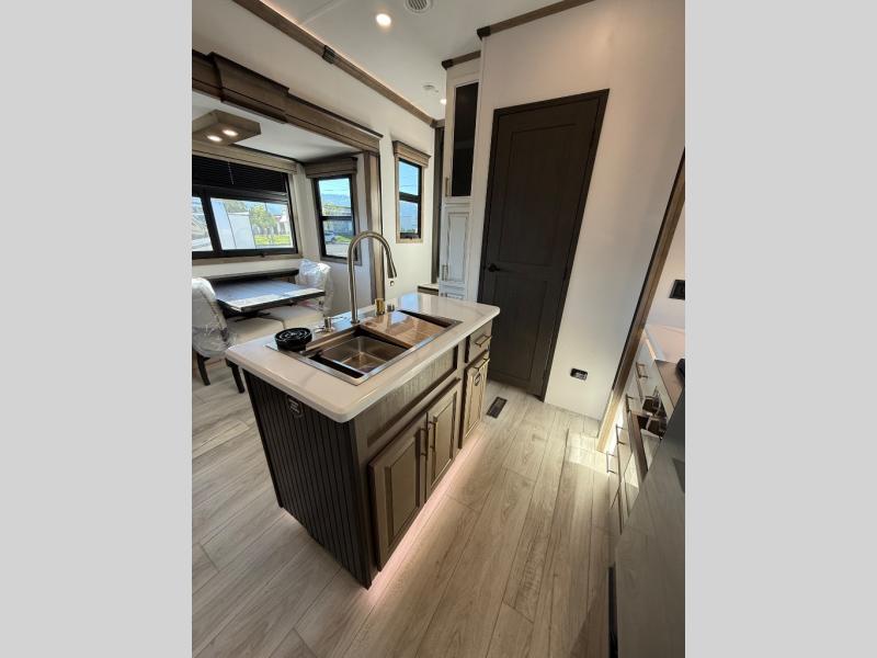 Life will be easier at the campground in this fifth wheel with a bath and a half! The full rear bathroom has a 48" x 30" fiberglass shower with a seat and skylight above, a linen closet to keep your towels close, a dual sink vanity for two to get ready at once, and a barn door to close off the master suite. The bedroom also has a king bed slide with storage underneath across from a dresser with a 32" Smart TV and wardrobe, as well as a large closet with stackable washer and dryer prep. The chef can prepare their best meals with the kitchen island, convection microwave and 24" range, plus there is a pantry/buffet and a free standing legless dinette to enjoy your meals at. The front living area will have you feeling right at home with the front entertainment center that has a telescoping 50" Smart TV, a 5,000 BTU decorative fireplace heater, and storage on either side. There is also opposing hide-a-bed sofa slides for extra sleeping spaces and power theater seating for even more comfort!