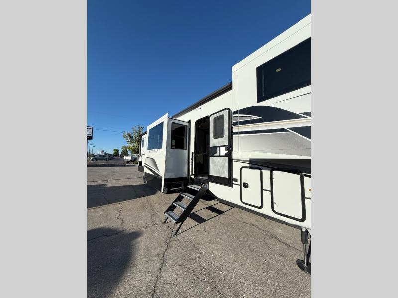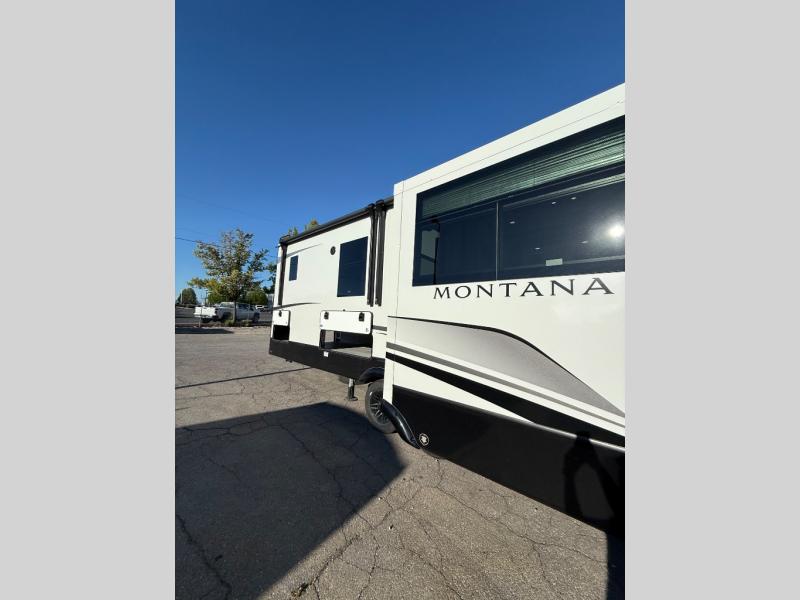 Enjoy luxury, innovation, and the outdoors in any one of Montana's finest fifth wheels. Each set the standard with exceptional features, and exciting factory installed options to provide you a great home on the road. Keystone's exclusive 12" I-beam chassis with z-frame technology has been reengineered to be stronger, lighter and built for "the long haul". A few other construction features you will appreciate include a Road Armor suspension, 2" thick, dual-layered lauan high gloss fiberglass sidewalls, a MaxTurn front cap with KeyShield automotive-grade paint, and a fully walkable roof with an Alpha seamless TPO membrane system. Each feature stylish interiors with two decor choices paired with beautiful hardwood cabinetry, vinyl flooring throughout, central vacuum, plus a La-Z-Boy furniture package for all-around comfort!