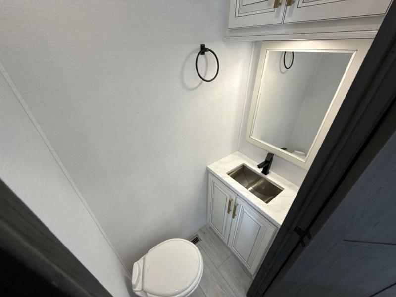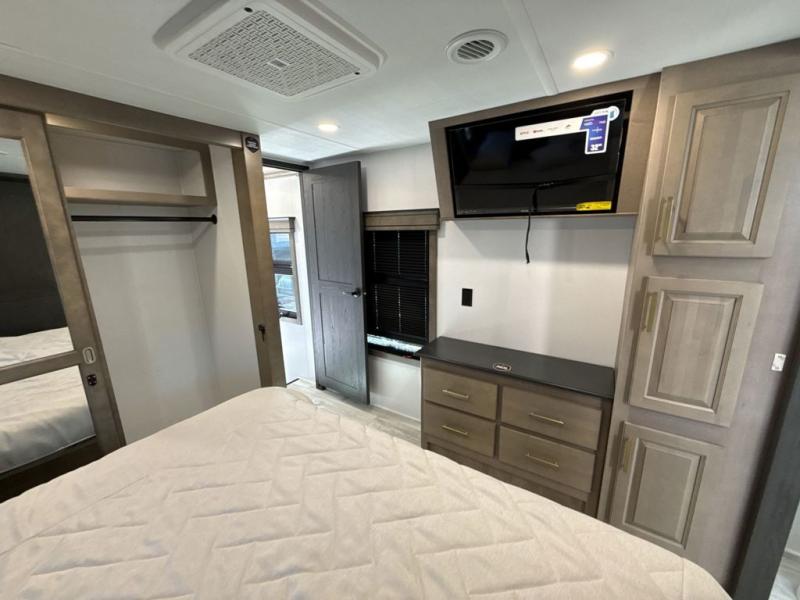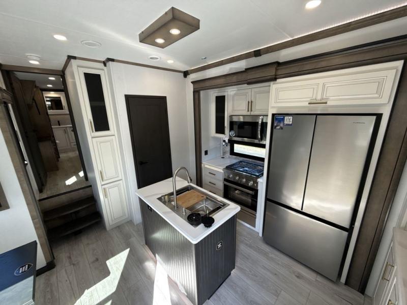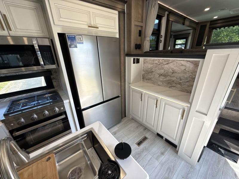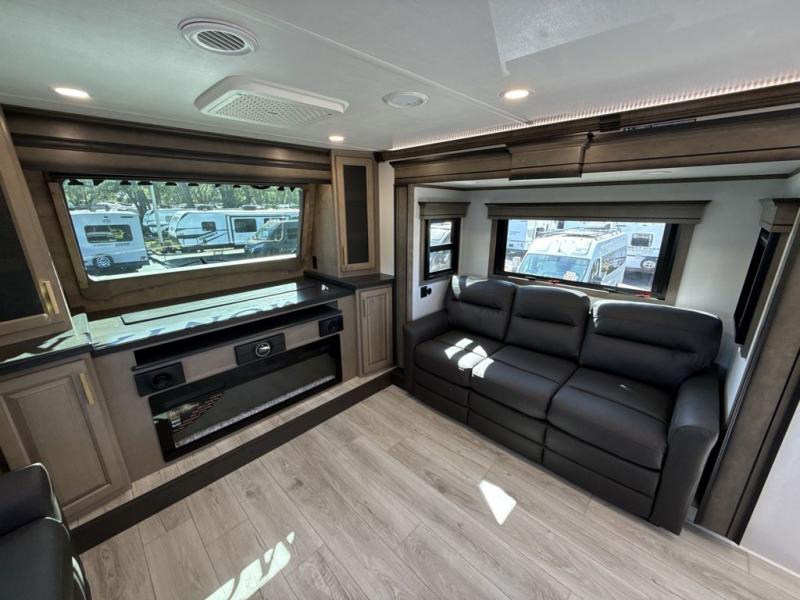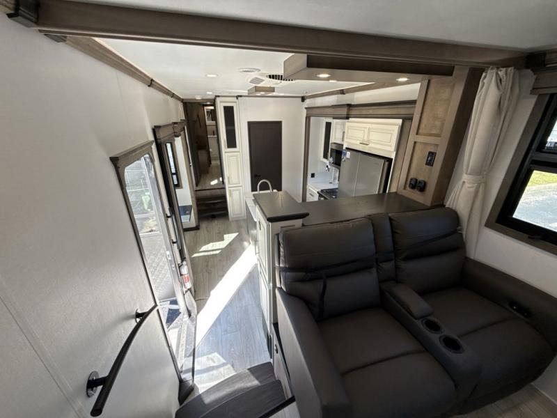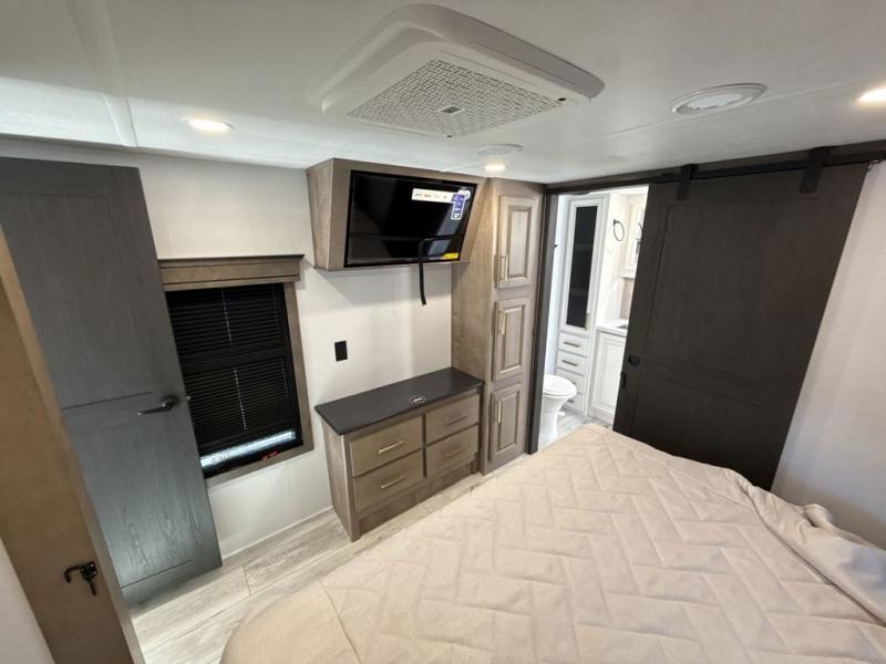 Life will be easier at the campground in this fifth wheel with a bath and a half! The full rear bathroom has a 48" x 30" fiberglass shower with a seat and skylight above, a linen closet to keep your towels close, a dual sink vanity for two to get ready at once, and a barn door to close off the master suite. The bedroom also has a king bed slide with storage underneath across from a dresser with a 32" Smart TV and wardrobe, as well as a large closet with stackable washer and dryer prep. The chef can prepare their best meals with the kitchen island, convection microwave and 24" range, plus there is a pantry/buffet and a free standing legless dinette to enjoy your meals at. The front living area will have you feeling right at home with the front entertainment center that has a telescoping 50" Smart TV, a 5,000 BTU decorative fireplace heater, and storage on either side. There is also opposing hide-a-bed sofa slides for extra sleeping spaces and power theater seating for even more comfort!