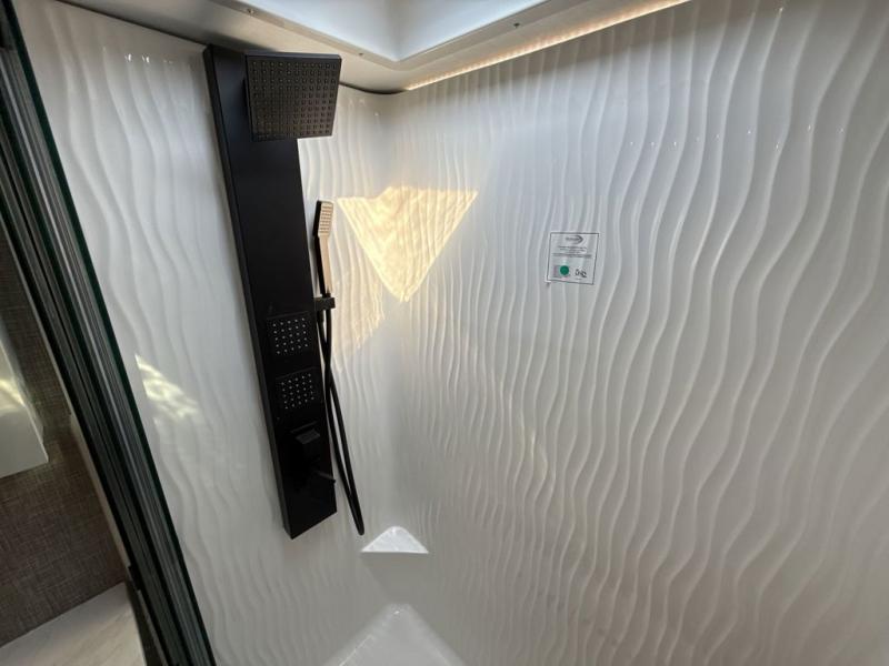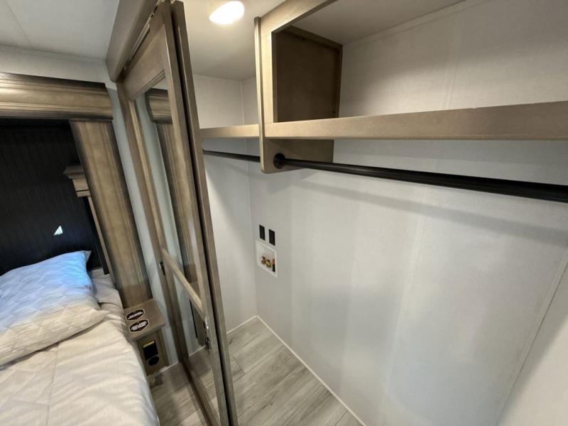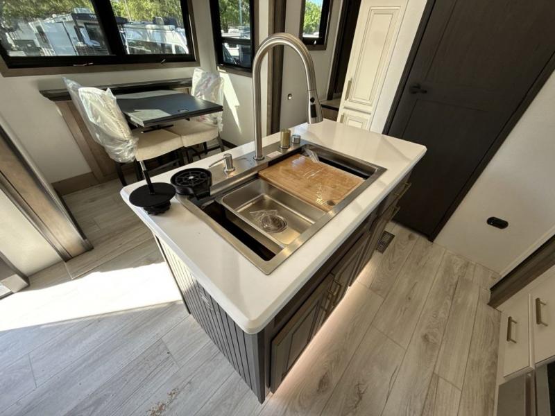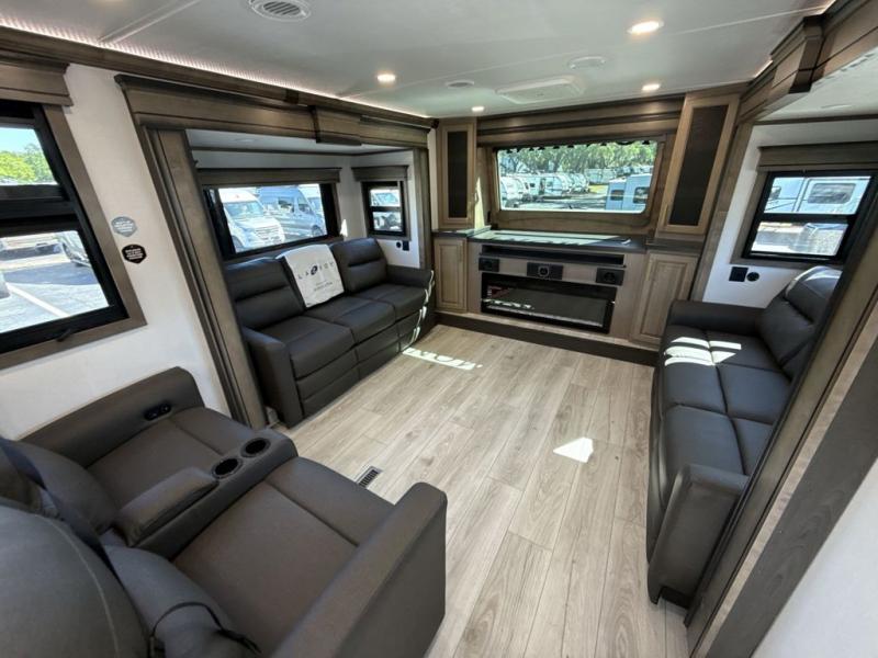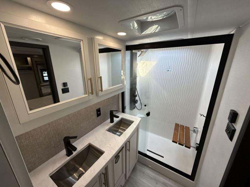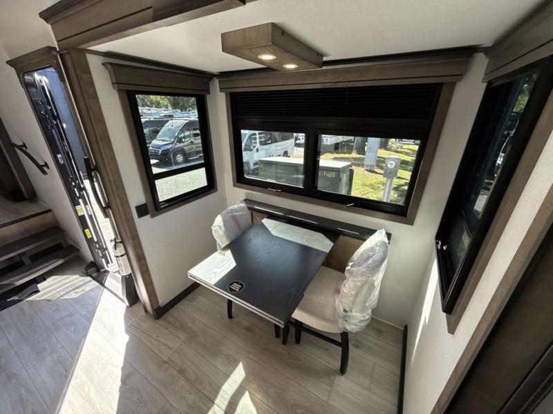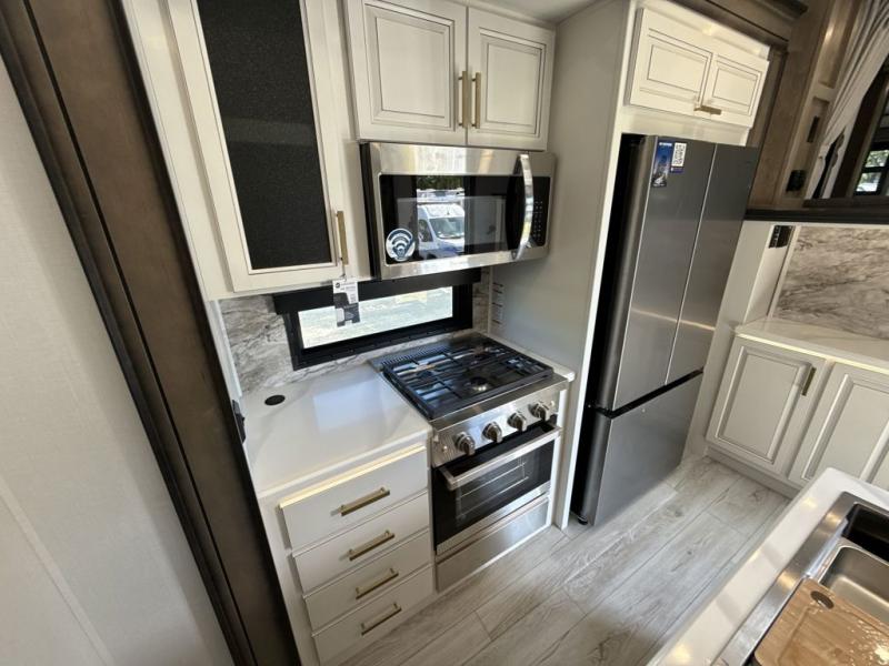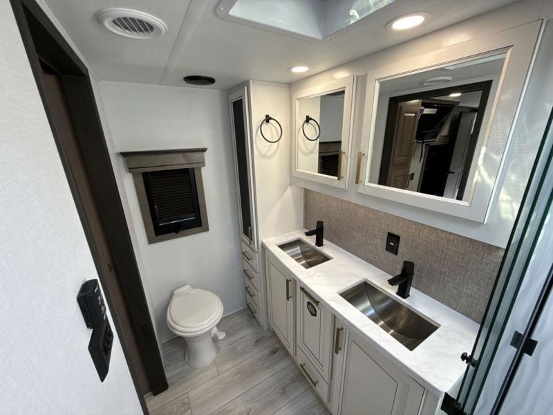 Life will be easier at the campground in this fifth wheel with a bath and a half! The full rear bathroom has a 48" x 30" fiberglass shower with a seat and skylight above, a linen closet to keep your towels close, a dual sink vanity for two to get ready at once, and a barn door to close off the master suite. The bedroom also has a king bed slide with storage underneath across from a dresser with a 32" Smart TV and wardrobe, as well as a large closet with stackable washer and dryer prep. The chef can prepare their best meals with the kitchen island, convection microwave and 24" range, plus there is a pantry/buffet and a free standing legless dinette to enjoy your meals at. The front living area will have you feeling right at home with the front entertainment center that has a telescoping 50" Smart TV, a 5,000 BTU decorative fireplace heater, and storage on either side. There is also opposing hide-a-bed sofa slides for extra sleeping spaces and power theater seating for even more comfort!