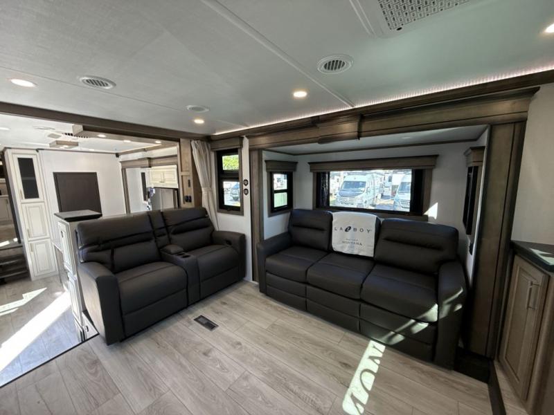 Enjoy luxury, innovation, and the outdoors in any one of Montana's finest fifth wheels. Each set the standard with exceptional features, and exciting factory installed options to provide you a great home on the road. Keystone's exclusive 12" I-beam chassis with z-frame technology has been reengineered to be stronger, lighter and built for "the long haul". A few other construction features you will appreciate include a Road Armor suspension, 2" thick, dual-layered lauan high gloss fiberglass sidewalls, a MaxTurn front cap with KeyShield automotive-grade paint, and a fully walkable roof with an Alpha seamless TPO membrane system. Each feature stylish interiors with two decor choices paired with beautiful hardwood cabinetry, vinyl flooring throughout, central vacuum, plus a La-Z-Boy furniture package for all-around comfort!