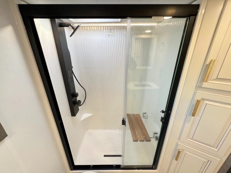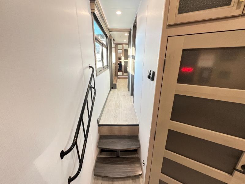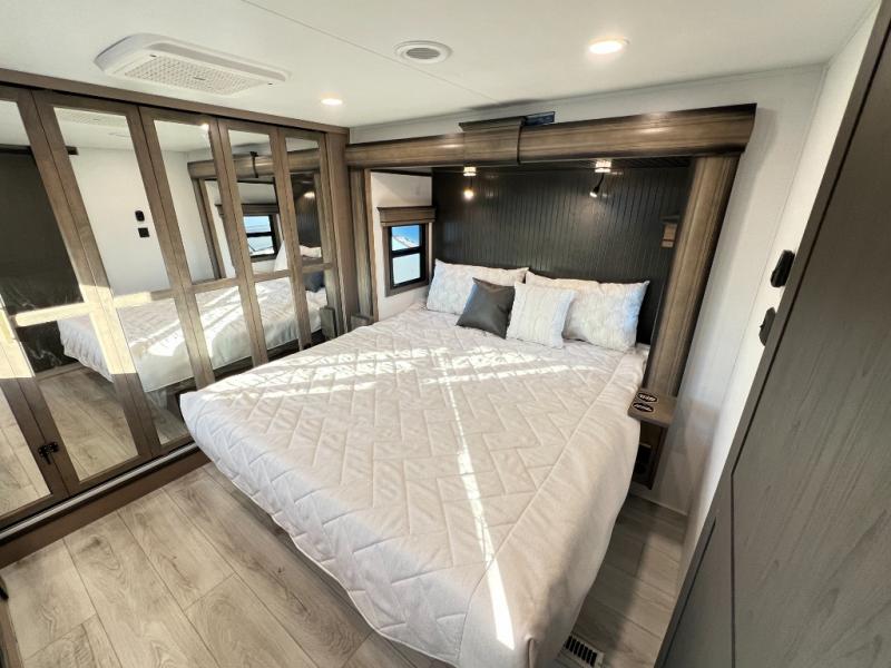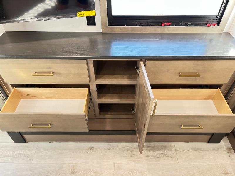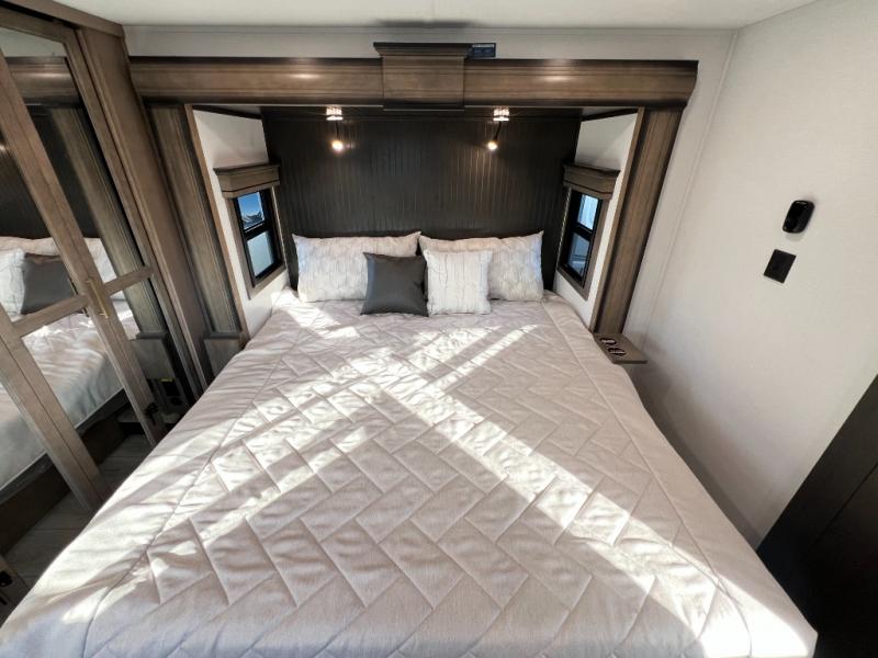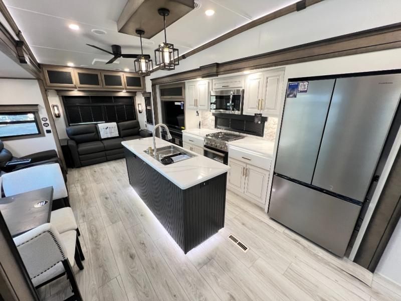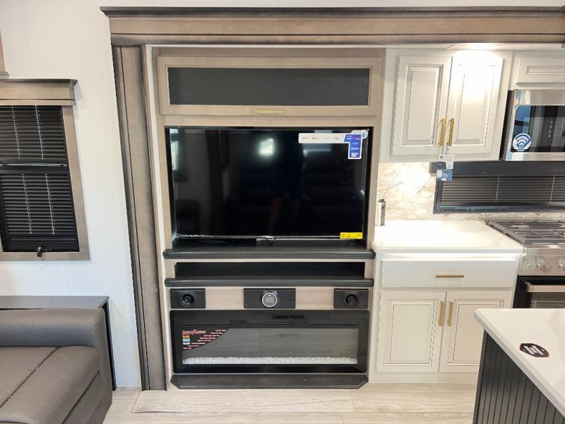 Enjoy a home away from home with this fifth wheel! The front private bedroom has a king bed slide with storage underneath across from a 32" Smart HDTV with drawers below it, a large front closet, and a barn door to close it all off. Freshen up each morning in the full bathroom with the 48" x 30" fiberglass shower with a seat and skylight above for more natural lighting as you get ready at the dual sink vanity. The kitchen has everything you need to prepare your best meals including extra countertop space on the kitchen island and even a closet with washer/dryer prep so you can quickly grab a clean dish towel. Enjoy your meals at the free standing legless dinette and then relax on the rear hide-a-bed sofa or the power theater seating across from the entertainment center with a 5,000 BTU decorative fireplace heater and 50" Smart HDTV to watch your favorite movies!