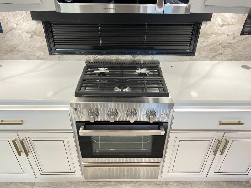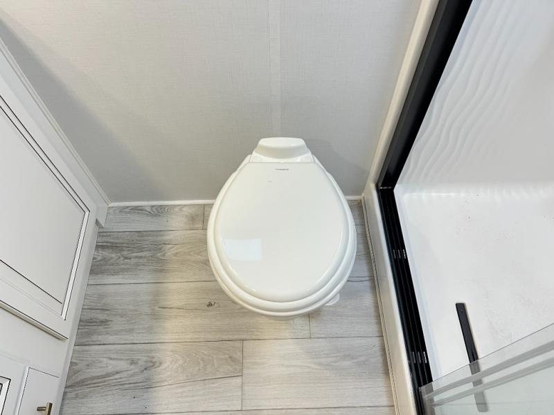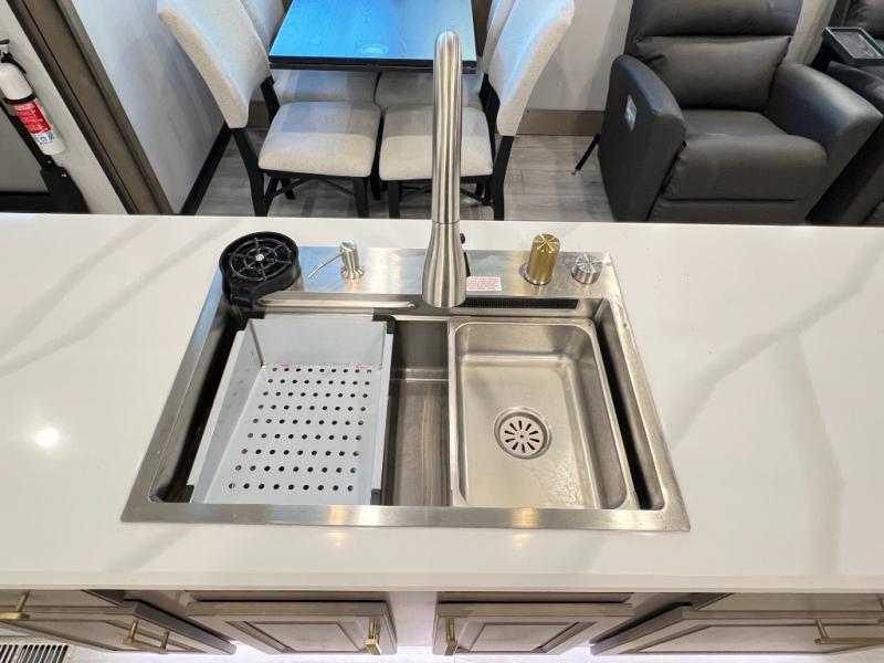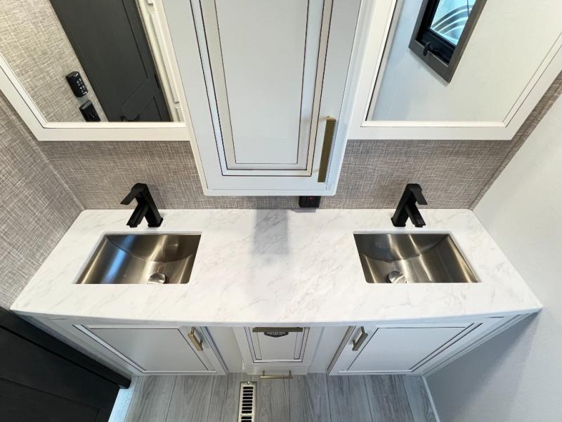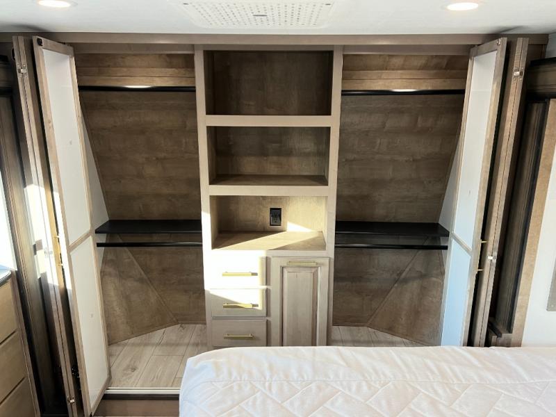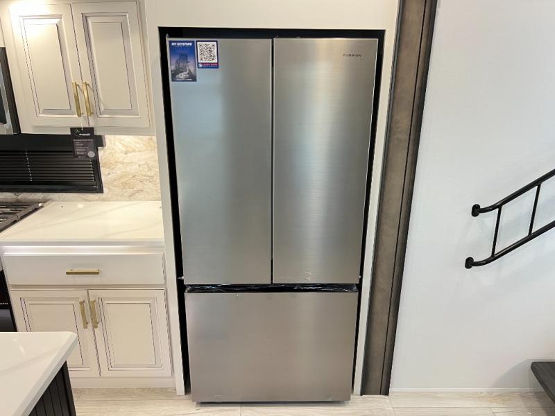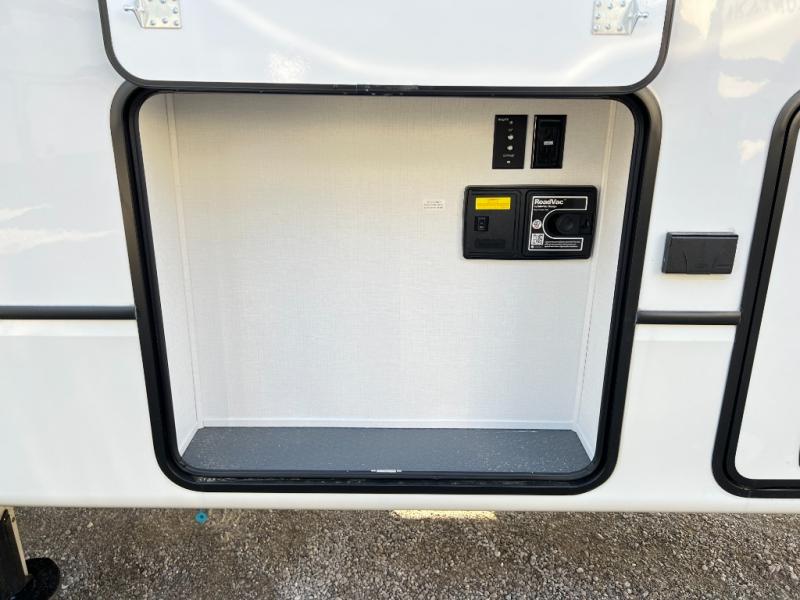 Enjoy a home away from home with this fifth wheel! The front private bedroom has a king bed slide with storage underneath across from a 32" Smart HDTV with drawers below it, a large front closet, and a barn door to close it all off. Freshen up each morning in the full bathroom with the 48" x 30" fiberglass shower with a seat and skylight above for more natural lighting as you get ready at the dual sink vanity. The kitchen has everything you need to prepare your best meals including extra countertop space on the kitchen island and even a closet with washer/dryer prep so you can quickly grab a clean dish towel. Enjoy your meals at the free standing legless dinette and then relax on the rear hide-a-bed sofa or the power theater seating across from the entertainment center with a 5,000 BTU decorative fireplace heater and 50" Smart HDTV to watch your favorite movies!