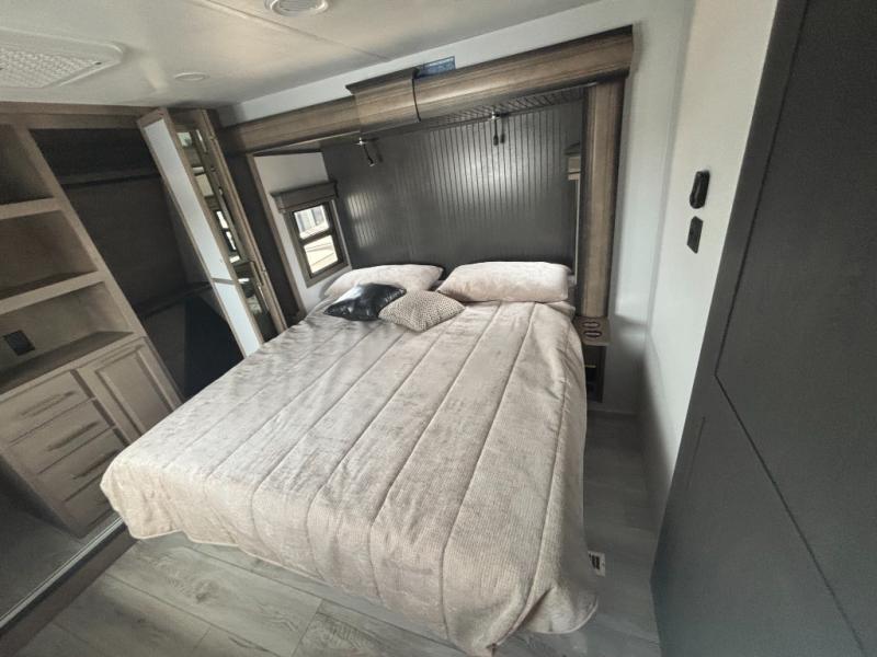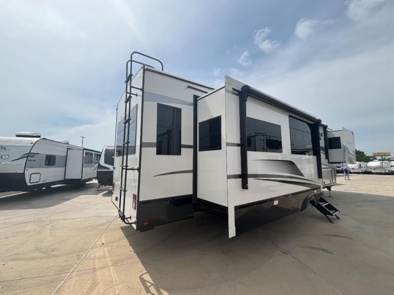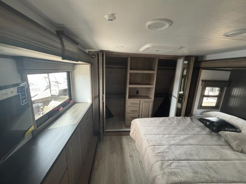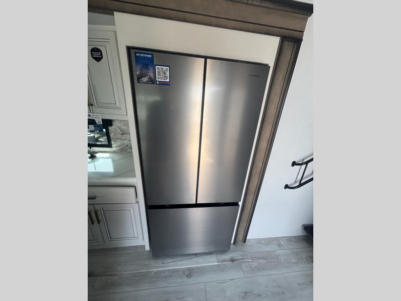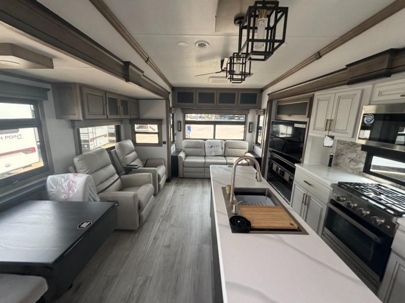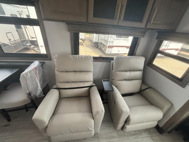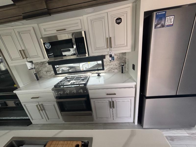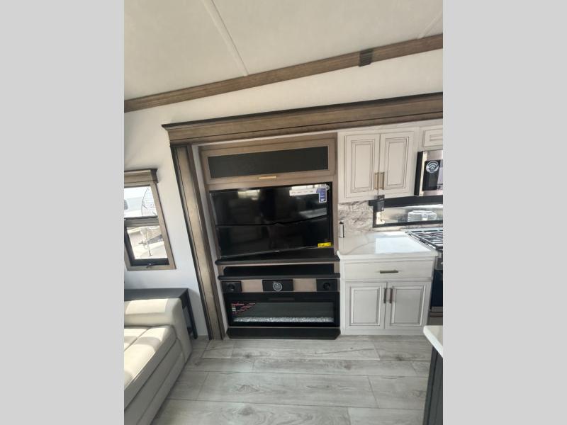 Enjoy a home away from home with this fifth wheel! The front private bedroom has a king bed slide with storage underneath across from a 32" Smart HDTV with drawers below it, a large front closet, and a barn door to close it all off. Freshen up each morning in the full bathroom with the 48" x 30" fiberglass shower with a seat and skylight above for more natural lighting as you get ready at the dual sink vanity. The kitchen has everything you need to prepare your best meals including extra countertop space on the kitchen island and even a closet with washer/dryer prep so you can quickly grab a clean dish towel. Enjoy your meals at the free standing legless dinette and then relax on the rear hide-a-bed sofa or the power theater seating across from the entertainment center with a 5,000 BTU decorative fireplace heater and 50" Smart HDTV to watch your favorite movies!