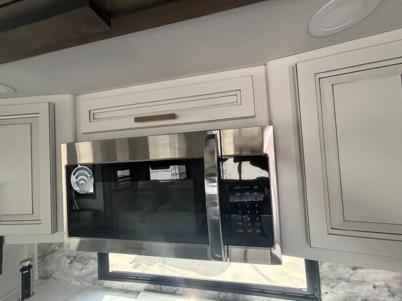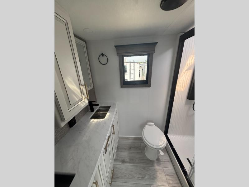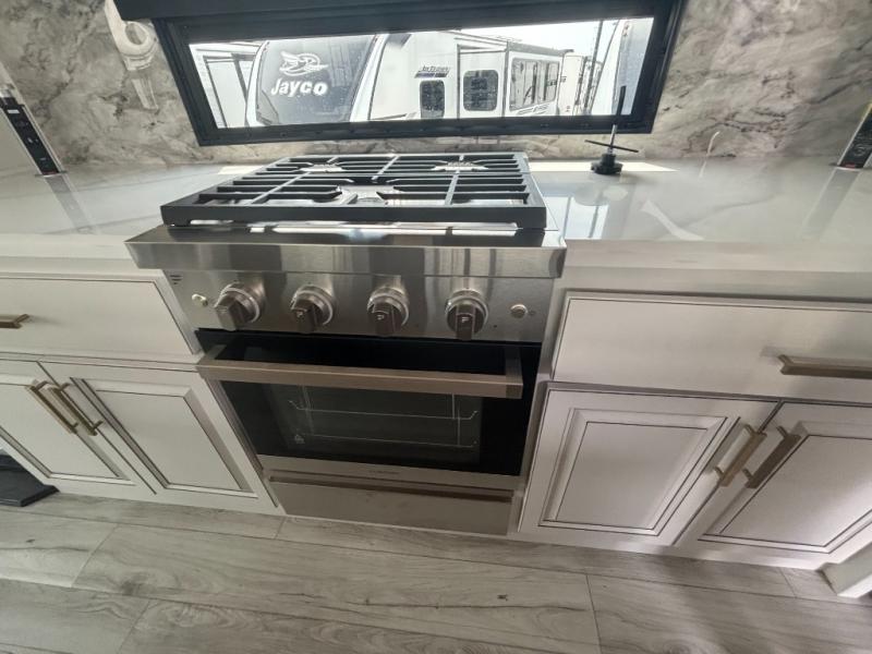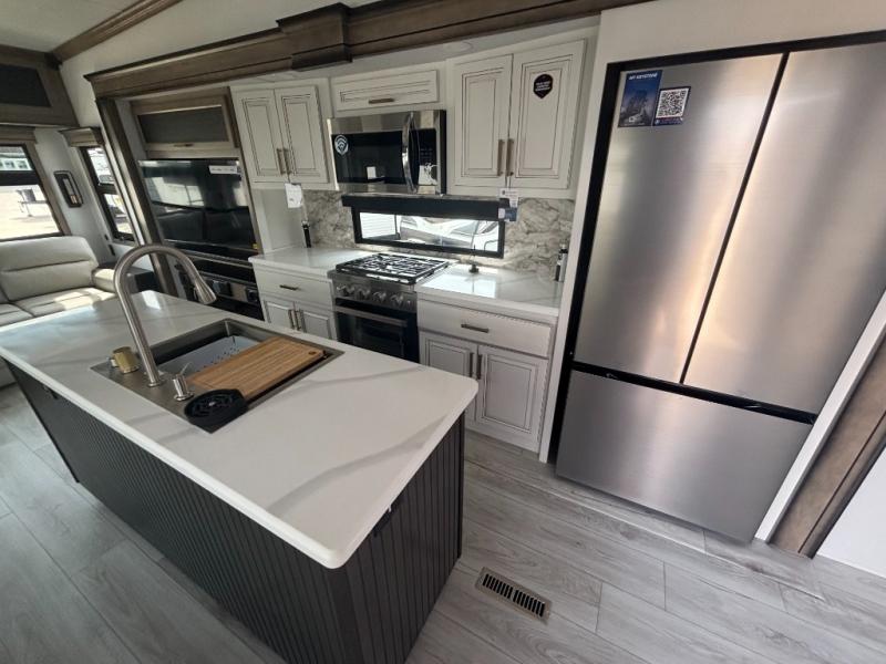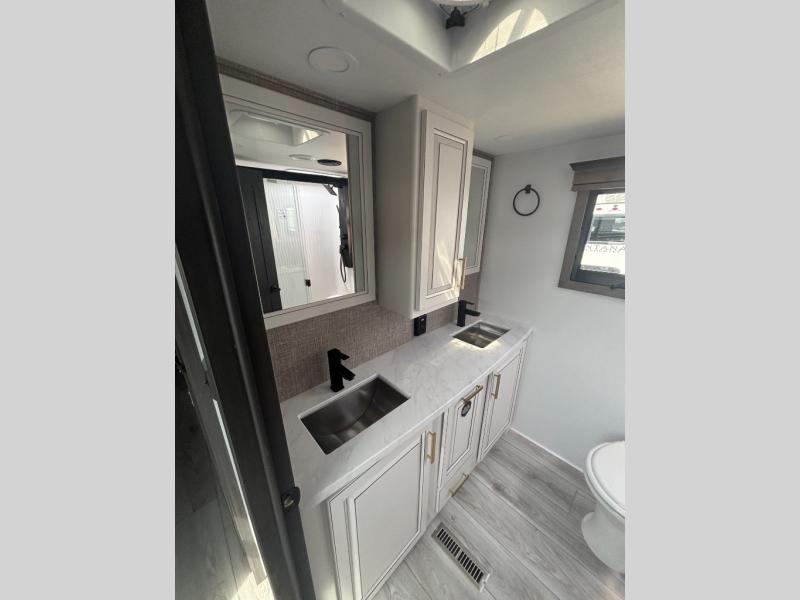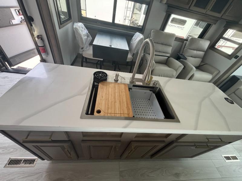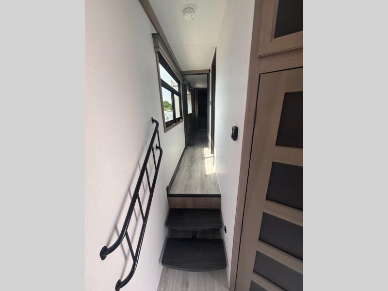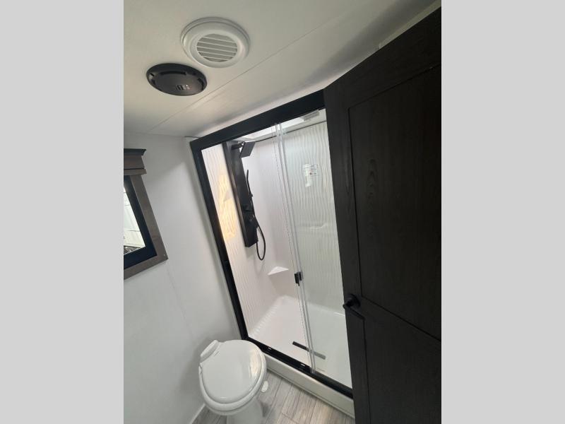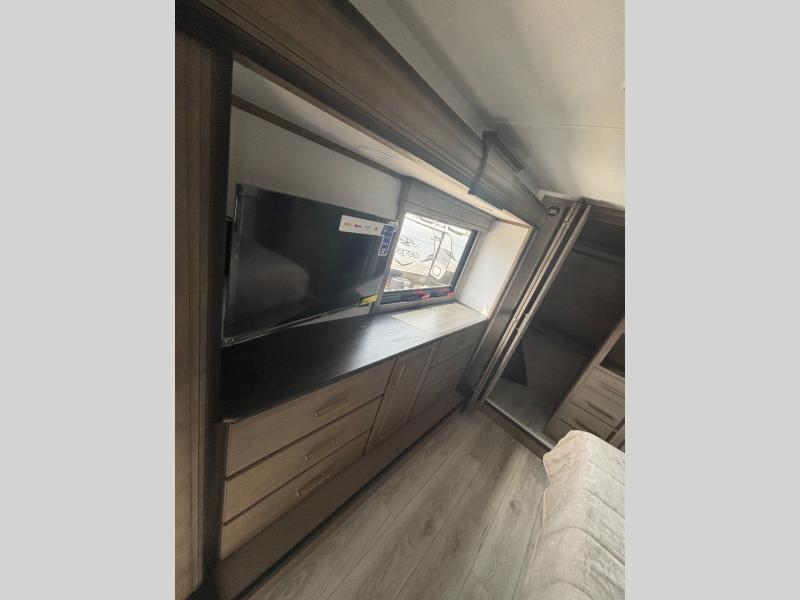 Enjoy a home away from home with this fifth wheel! The front private bedroom has a king bed slide with storage underneath across from a 32" Smart HDTV with drawers below it, a large front closet, and a barn door to close it all off. Freshen up each morning in the full bathroom with the 48" x 30" fiberglass shower with a seat and skylight above for more natural lighting as you get ready at the dual sink vanity. The kitchen has everything you need to prepare your best meals including extra countertop space on the kitchen island and even a closet with washer/dryer prep so you can quickly grab a clean dish towel. Enjoy your meals at the free standing legless dinette and then relax on the rear hide-a-bed sofa or the power theater seating across from the entertainment center with a 5,000 BTU decorative fireplace heater and 50" Smart HDTV to watch your favorite movies!
