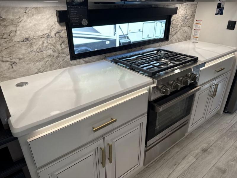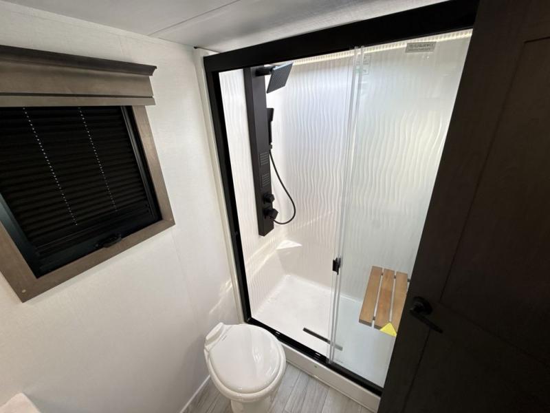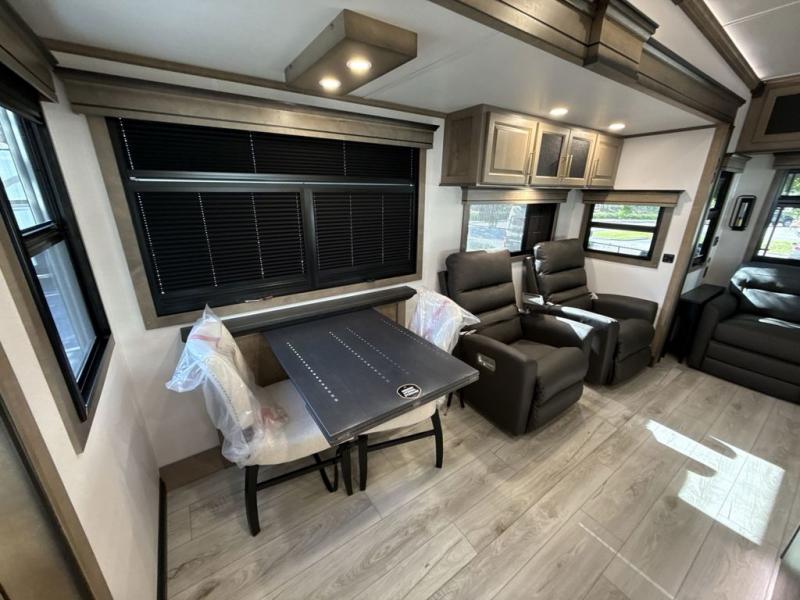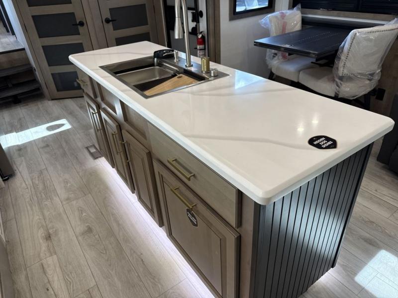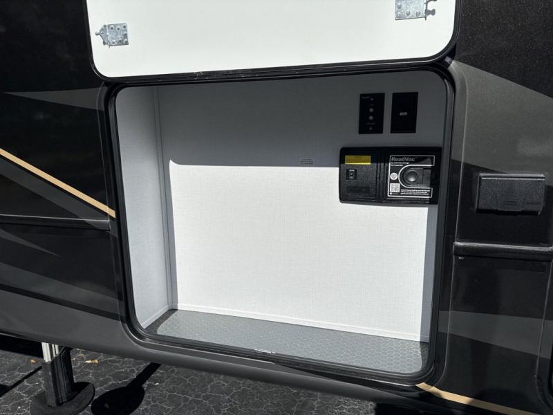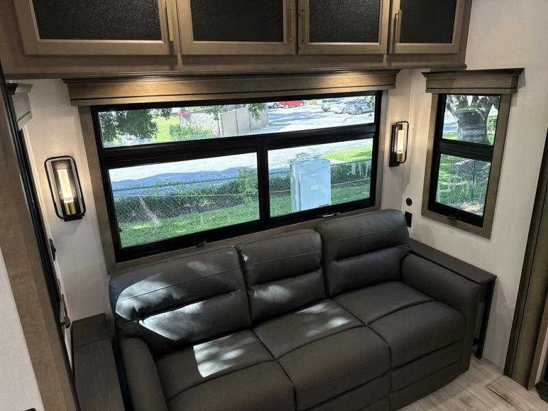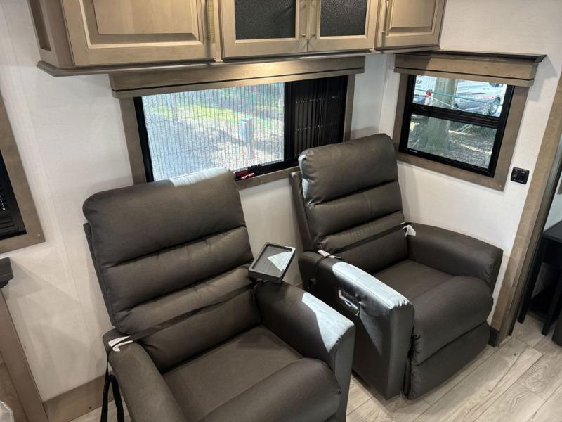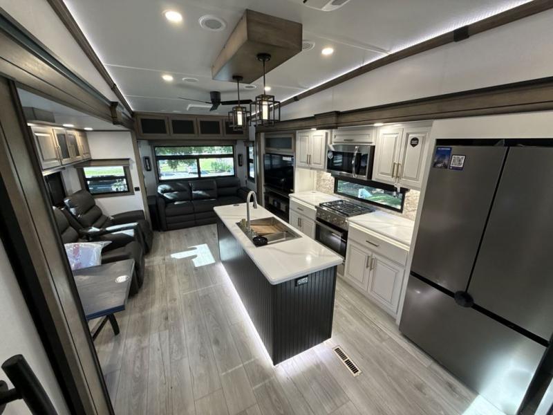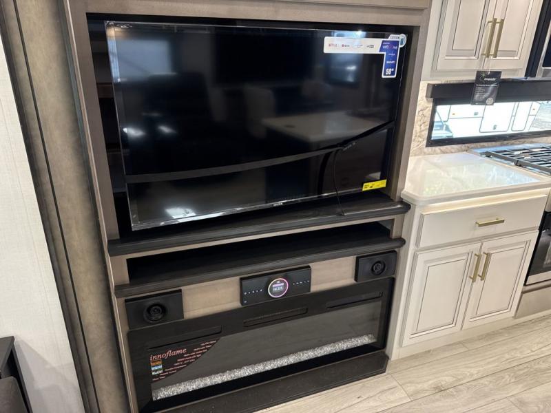 Enjoy a home away from home with this fifth wheel! The front private bedroom has a king bed slide with storage underneath across from a 32" Smart HDTV with drawers below it, a large front closet, and a barn door to close it all off. Freshen up each morning in the full bathroom with the 48" x 30" fiberglass shower with a seat and skylight above for more natural lighting as you get ready at the dual sink vanity. The kitchen has everything you need to prepare your best meals including extra countertop space on the kitchen island and even a closet with washer/dryer prep so you can quickly grab a clean dish towel. Enjoy your meals at the free standing legless dinette and then relax on the rear hide-a-bed sofa or the power theater seating across from the entertainment center with a 5,000 BTU decorative fireplace heater and 50" Smart HDTV to watch your favorite movies!