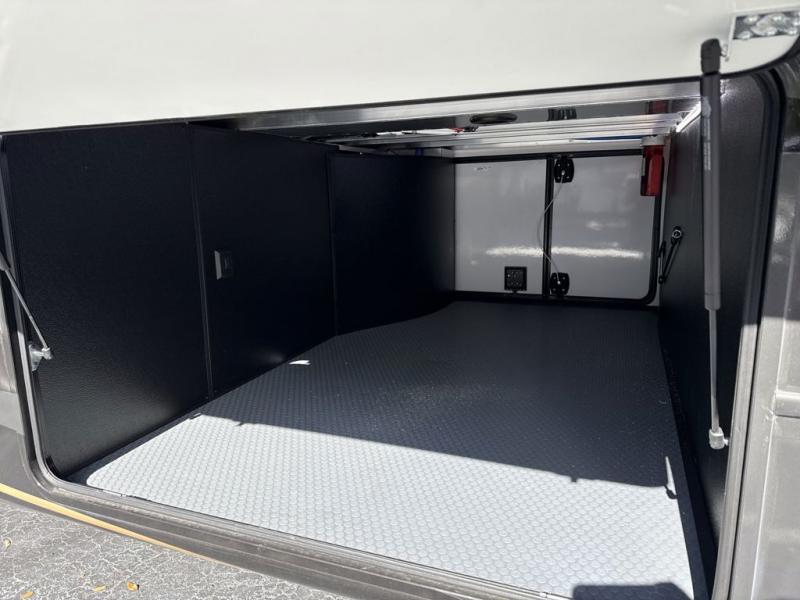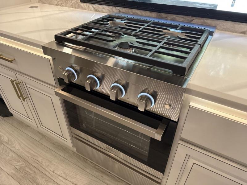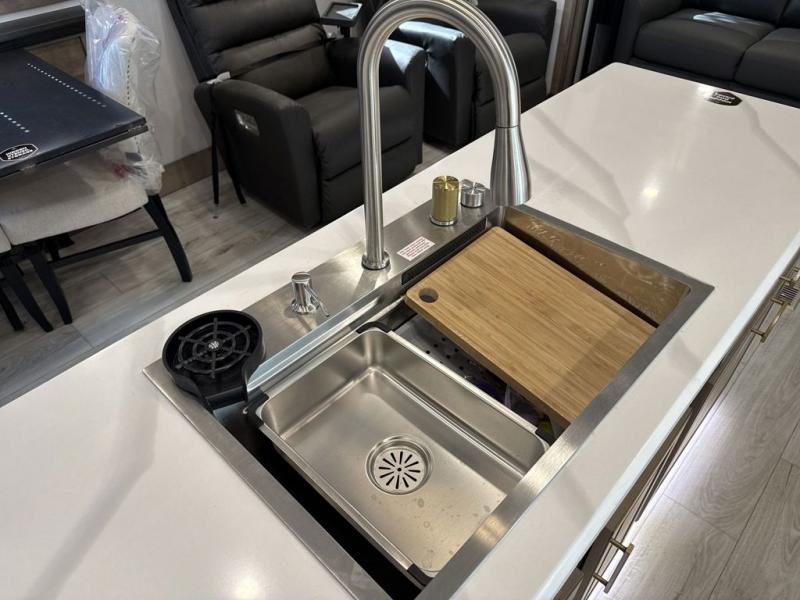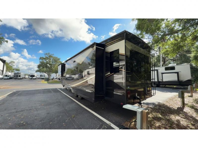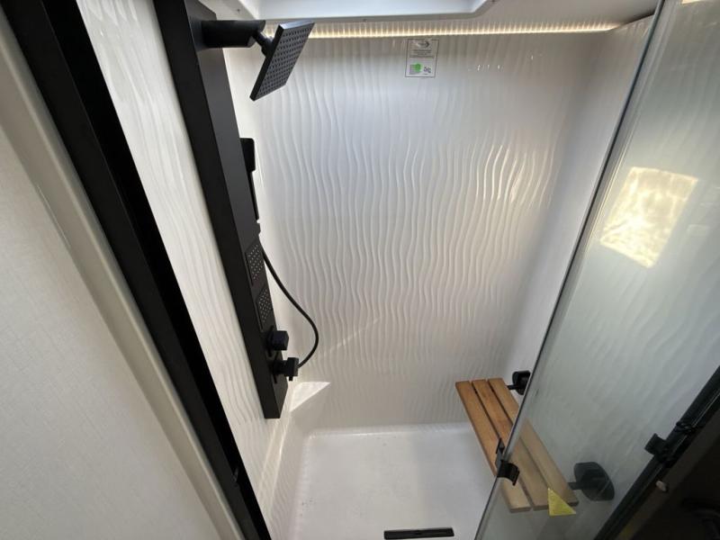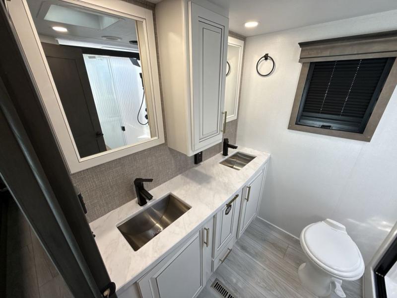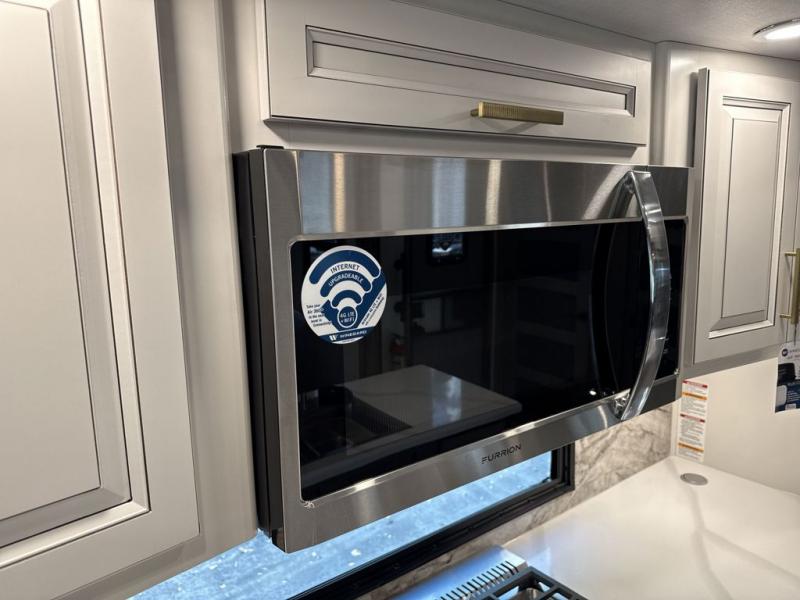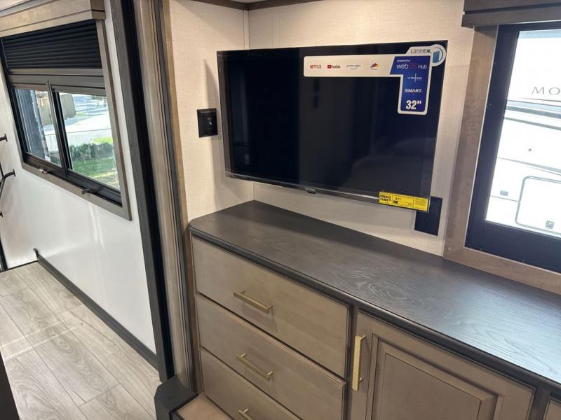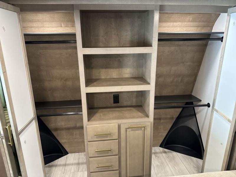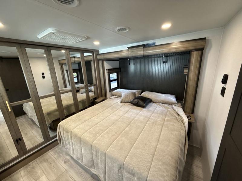 Enjoy a home away from home with this fifth wheel! The front private bedroom has a king bed slide with storage underneath across from a 32" Smart HDTV with drawers below it, a large front closet, and a barn door to close it all off. Freshen up each morning in the full bathroom with the 48" x 30" fiberglass shower with a seat and skylight above for more natural lighting as you get ready at the dual sink vanity. The kitchen has everything you need to prepare your best meals including extra countertop space on the kitchen island and even a closet with washer/dryer prep so you can quickly grab a clean dish towel. Enjoy your meals at the free standing legless dinette and then relax on the rear hide-a-bed sofa or the power theater seating across from the entertainment center with a 5,000 BTU decorative fireplace heater and 50" Smart HDTV to watch your favorite movies!
