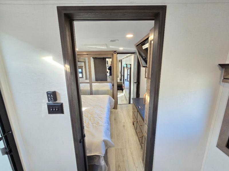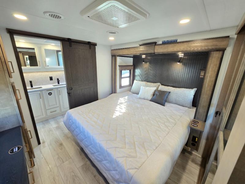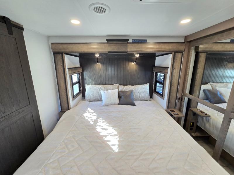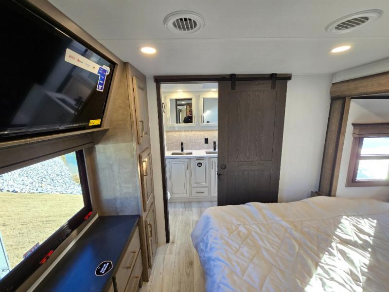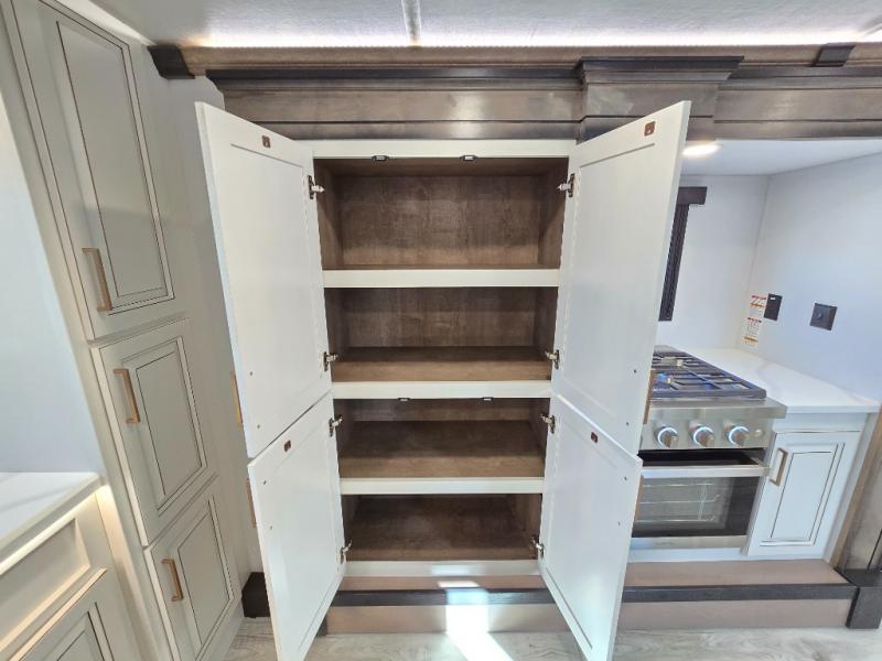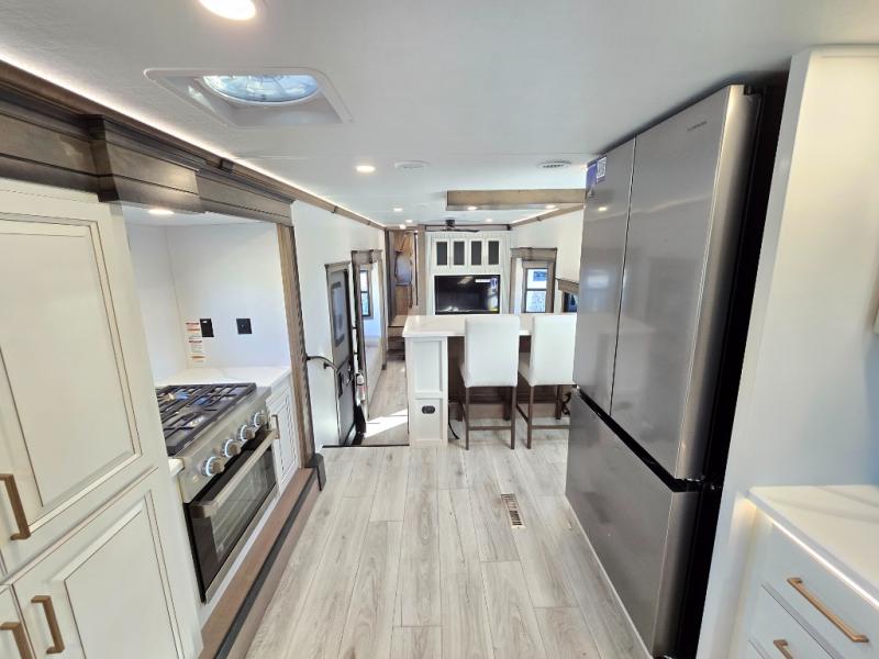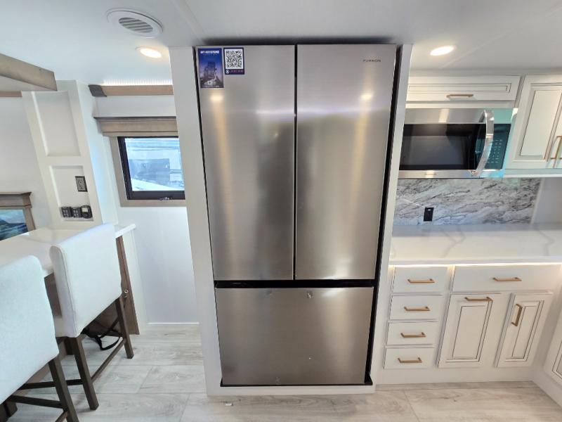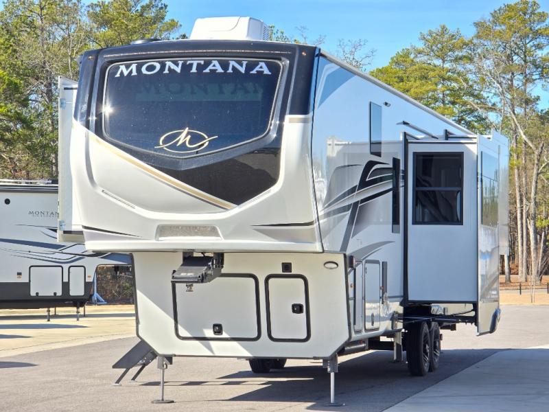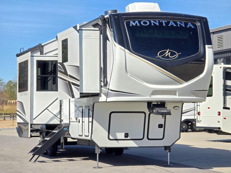 The perfect RV when you like to take "home"' with you when you travel! This Montana fifth wheel gives you the space you want and it feels like home with plenty of features to love and keep you comfortable when you are out enjoying your adventures. Four slides in total give each space plenty of room, the raised front kitchen has everything you need to cook up meals and snacks just like at home. An 18 cu. ft. residential refrigerator with ice maker, convection microwave oven, and large sink, plus pantry space will make any chef happy. The mid-coach area just inside the door features a living room with dual opposing hide-a-bed slides as well as powered theater seating and a fireplace with Smart TV opposite. Step up in back to a bedroom with a king bed slide, a dresser, and closet featuring prep for a stackable washer and dryer. A sliding barn door leads into the rear spacious master bath featuring a 48" x 30" shower, a toilet, linen storage and a vanity with two sinks!