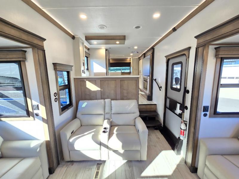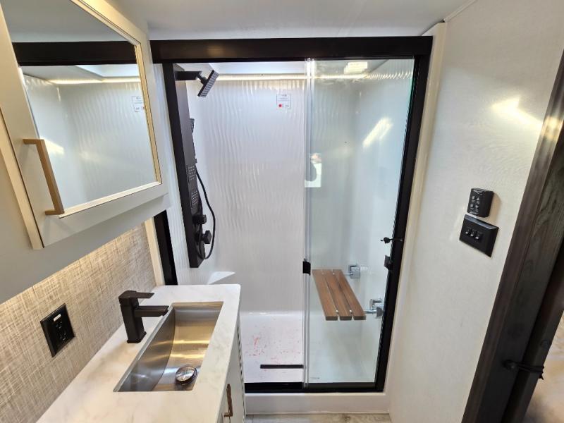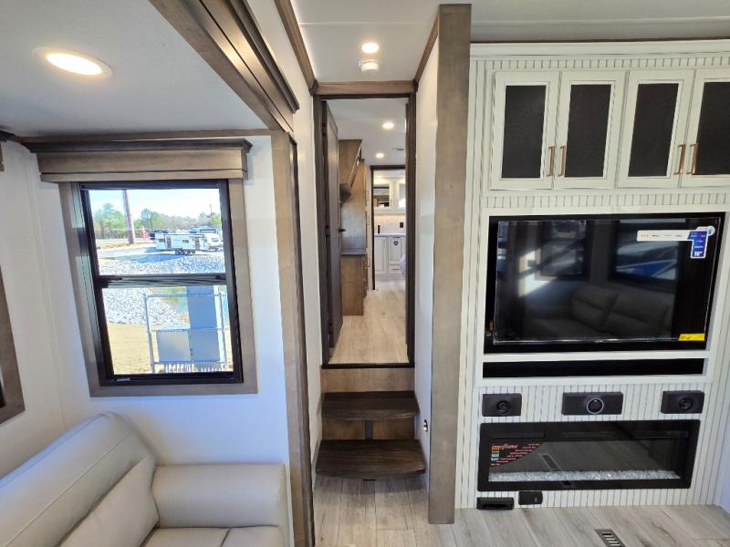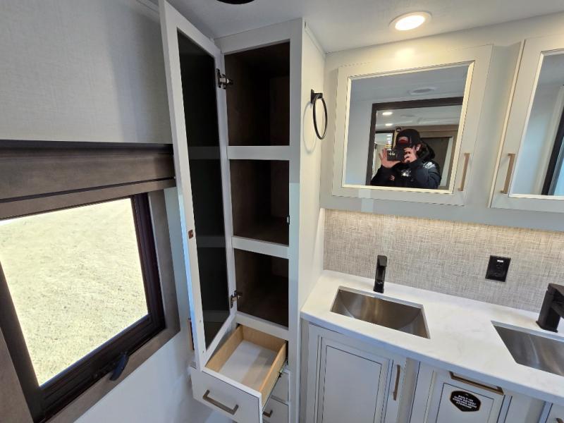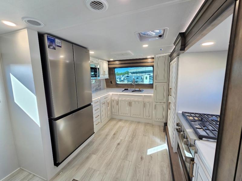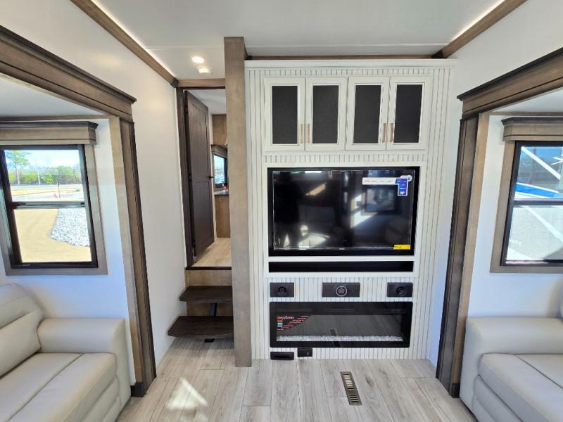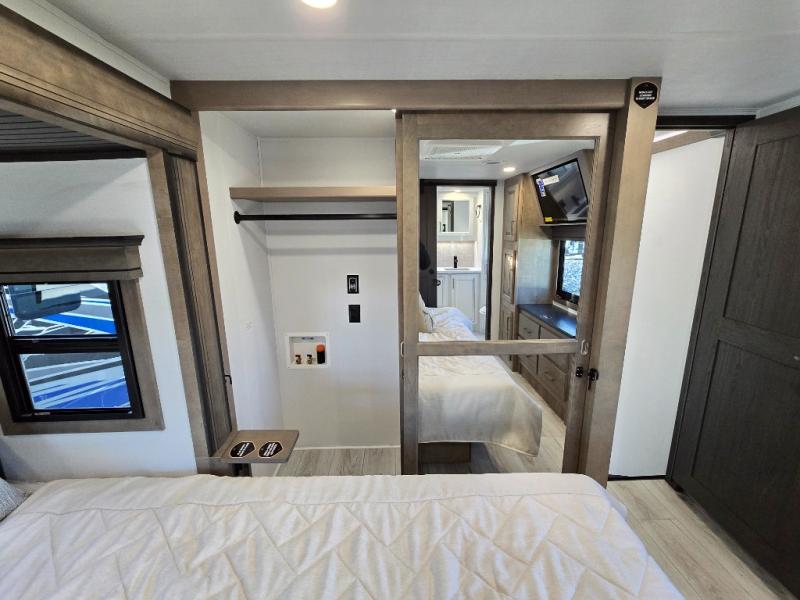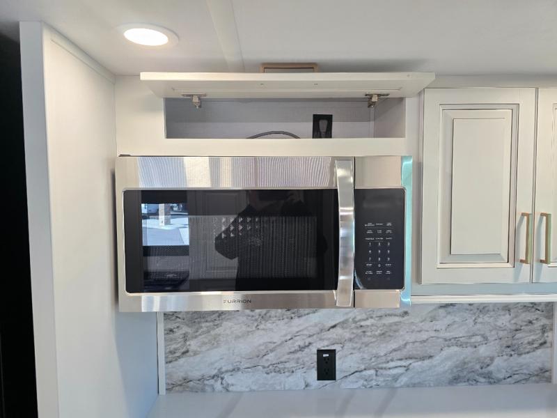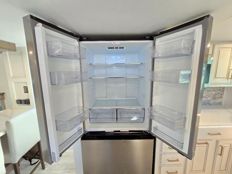 The perfect RV when you like to take "home"' with you when you travel! This Montana fifth wheel gives you the space you want and it feels like home with plenty of features to love and keep you comfortable when you are out enjoying your adventures. Four slides in total give each space plenty of room, the raised front kitchen has everything you need to cook up meals and snacks just like at home. An 18 cu. ft. residential refrigerator with ice maker, convection microwave oven, and large sink, plus pantry space will make any chef happy. The mid-coach area just inside the door features a living room with dual opposing hide-a-bed slides as well as powered theater seating and a fireplace with Smart TV opposite. Step up in back to a bedroom with a king bed slide, a dresser, and closet featuring prep for a stackable washer and dryer. A sliding barn door leads into the rear spacious master bath featuring a 48" x 30" shower, a toilet, linen storage and a vanity with two sinks!