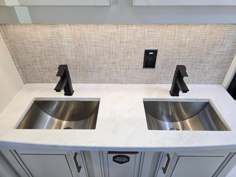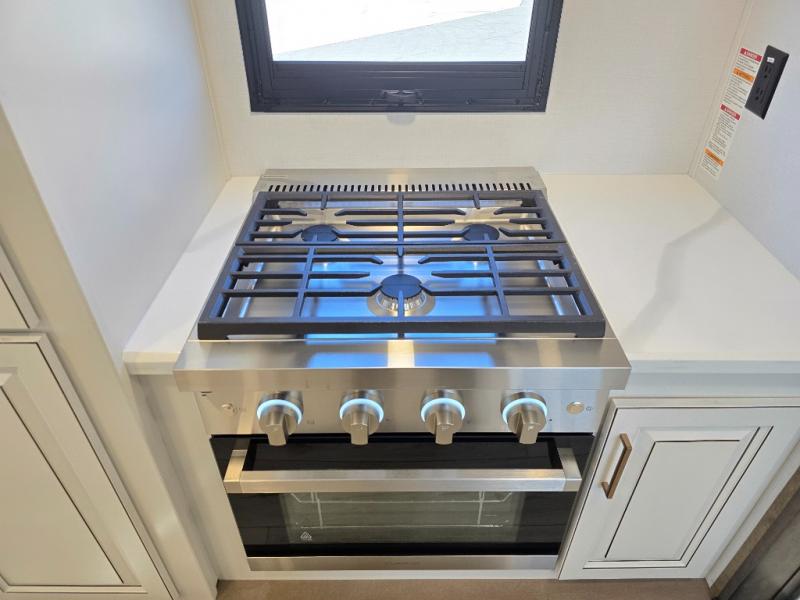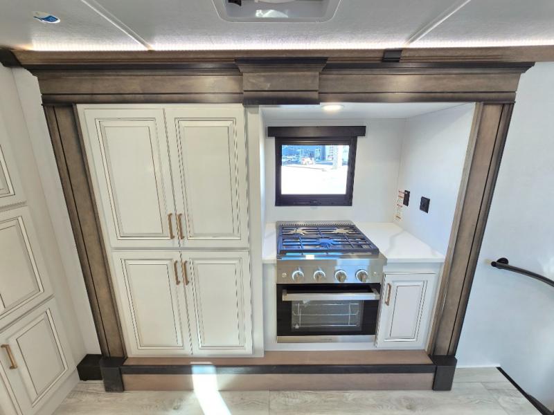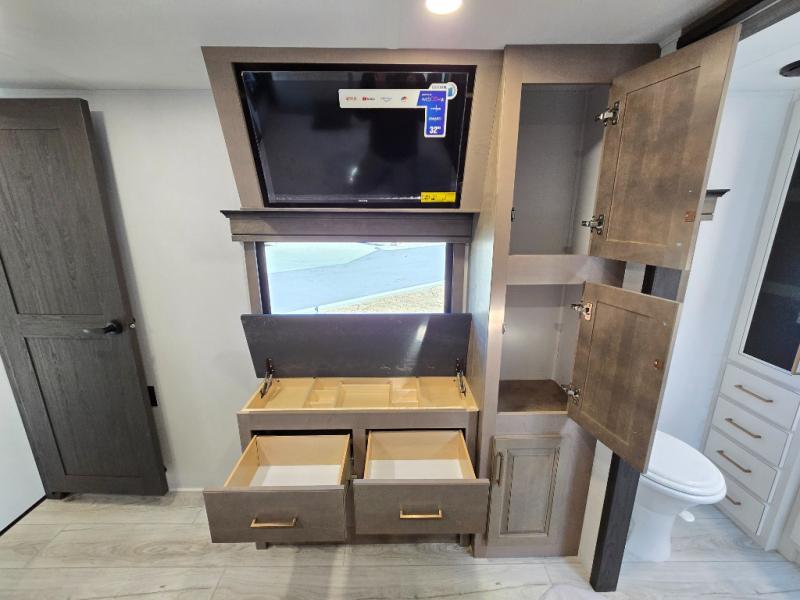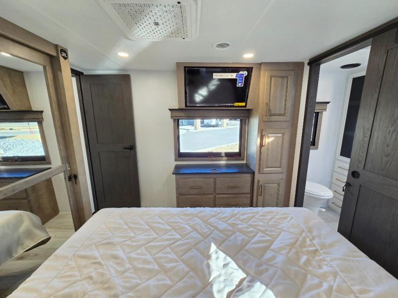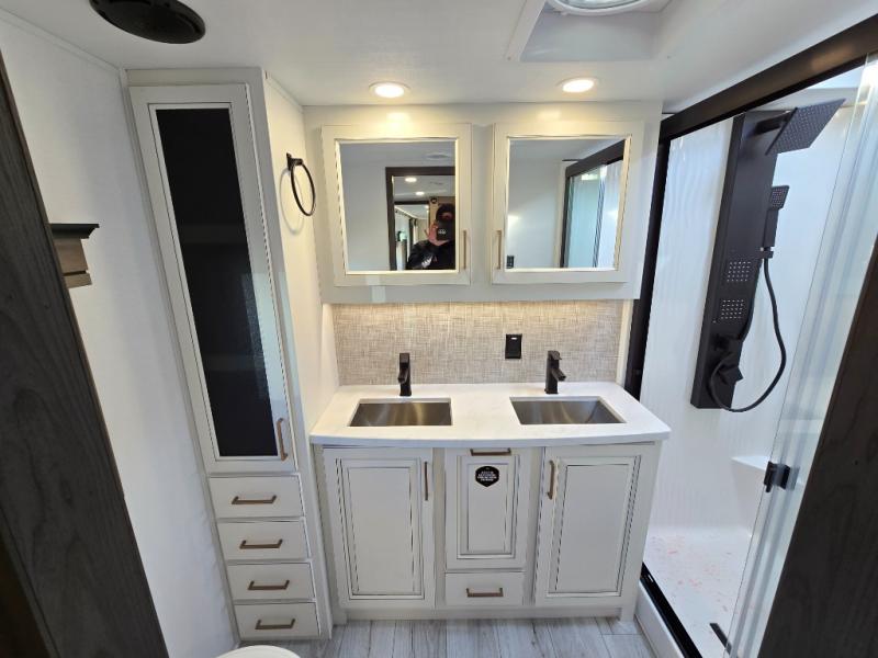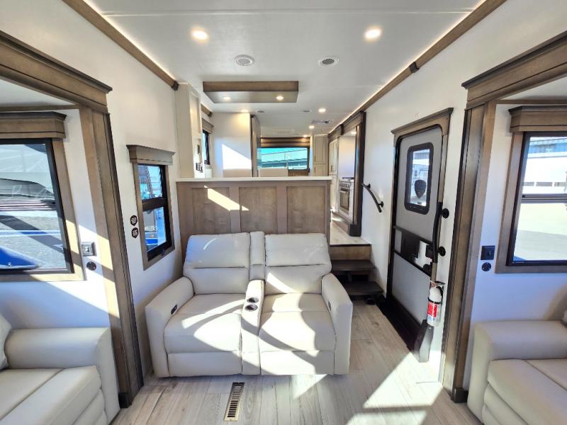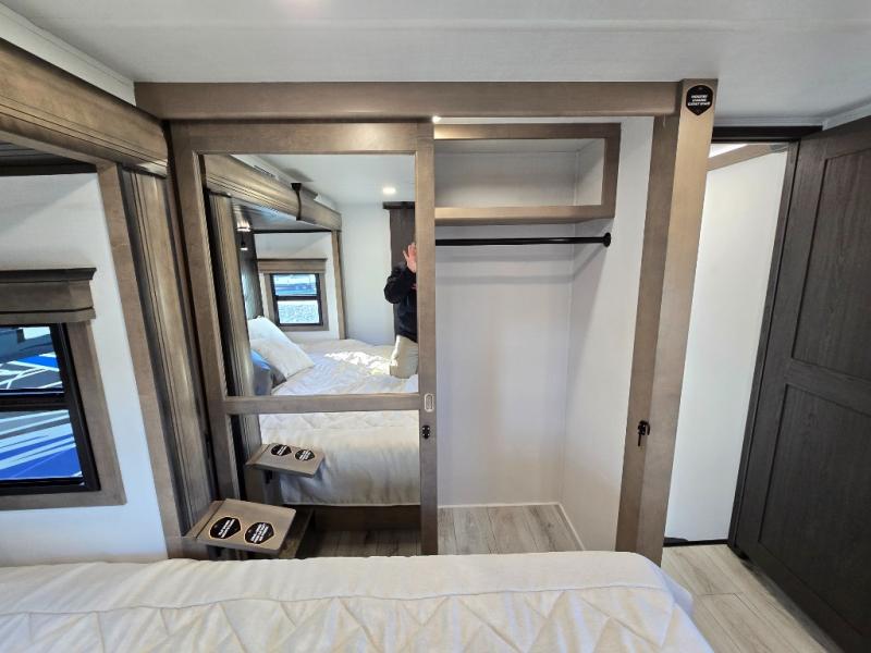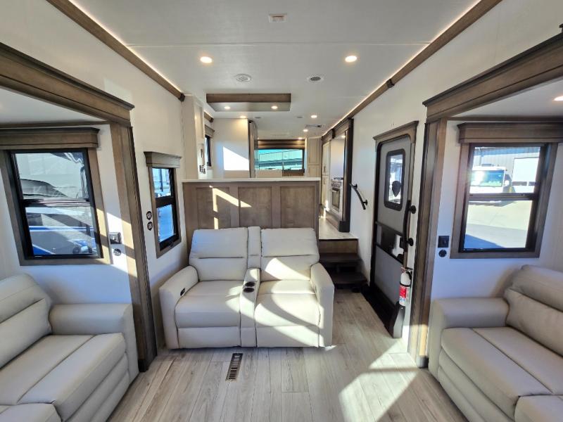 The perfect RV when you like to take "home"' with you when you travel! This Montana fifth wheel gives you the space you want and it feels like home with plenty of features to love and keep you comfortable when you are out enjoying your adventures. Four slides in total give each space plenty of room, the raised front kitchen has everything you need to cook up meals and snacks just like at home. An 18 cu. ft. residential refrigerator with ice maker, convection microwave oven, and large sink, plus pantry space will make any chef happy. The mid-coach area just inside the door features a living room with dual opposing hide-a-bed slides as well as powered theater seating and a fireplace with Smart TV opposite. Step up in back to a bedroom with a king bed slide, a dresser, and closet featuring prep for a stackable washer and dryer. A sliding barn door leads into the rear spacious master bath featuring a 48" x 30" shower, a toilet, linen storage and a vanity with two sinks!